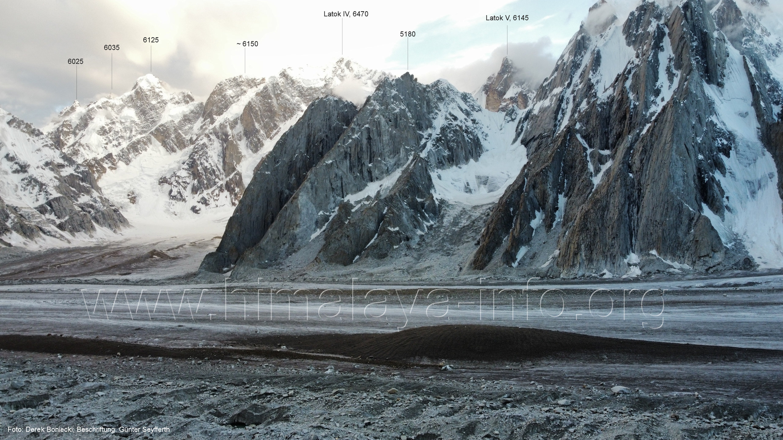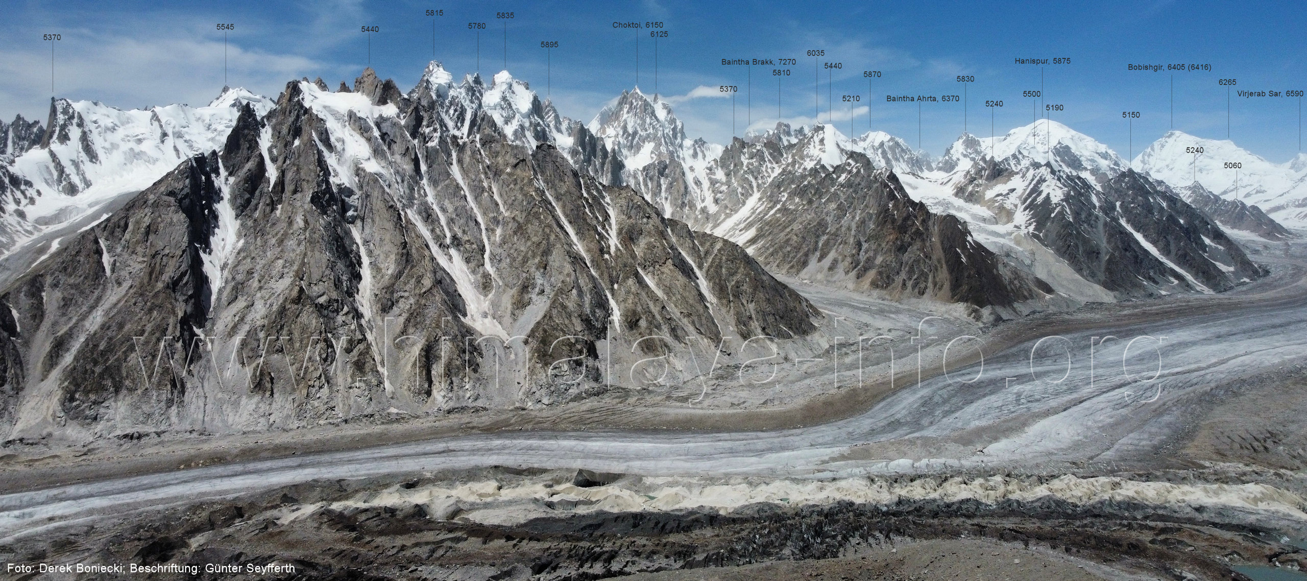 Startopunkt war ein Lager an dem See zwischen Nobande Sobande-Gletscher und dem östlichen Hangfuß; siehe Bild Nr. C-3. (C-1) Blick nach Südwesten entlang des unteren Nobande Sobande-Gletschers Hinter der Gipfelkette mit Bullah (6280 m) und Dongbar (6265 m) liegt der Biafo-Gletscher. Foto: Derek Boniecki, 7. Aug. 2023; Beschriftung: Günter Seyfferth (C-2) Blick nach Westen mit Choktoi (6150 m), Hanispur (5875 m) und Bobishgir (6405 m) Unten geht der Blick auf den Nobande