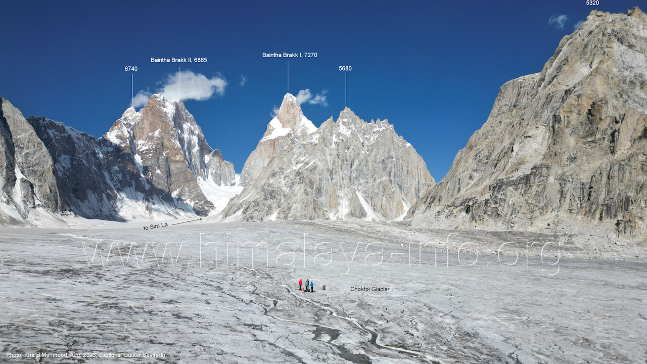 dem oberen Choktoi-Gletscher und am Sim La (B-1) Bei 35°56'50" N, 75°53'15" E mit Blick nach Süden Man sieht die beiden südlichen Gipfel der Latok-Gruppe Latok IV (6470 m) und Latok V (6145 m) Foto: Derek Boniecki, 16. Juli 2023; Beschriftung: Günter Seyfferth (B-2) Bei 35°57'08" N, 75°50'09" mit Blick nach West-Südwesten zum Baintha Brakk II (6885 m) Links sieht man zum Fuß der Nordwand des Latok I (7120 m) Foto: Khalid Mehmood, 21.08.2023; Beschriftung: Günter Seyfferth (B-3) Bei 35°57'08" N, 75°50'09" E mit Blick nach Westen zum Baintha Brak II (6885 m) und Baintha Brakk I (7270 m) Die Aufstiegsroute zum Sim La verläuft zwischen Peak 5680 und Baintha Brakk I. Foto: Khalid Mehmood, 21.08.2023; Beschriftung: Günter Seyfferth (B-4) Blick von Südosten zum Sim La (5440 m) Foto: Khalid Mehmood, 20.08.2023; Beschriftung: Günter Seyfferth (B-5) Blick von Südosten auf den Gletscherbruch unter dem Sim La Die Aufstiegsroute verläuft auf