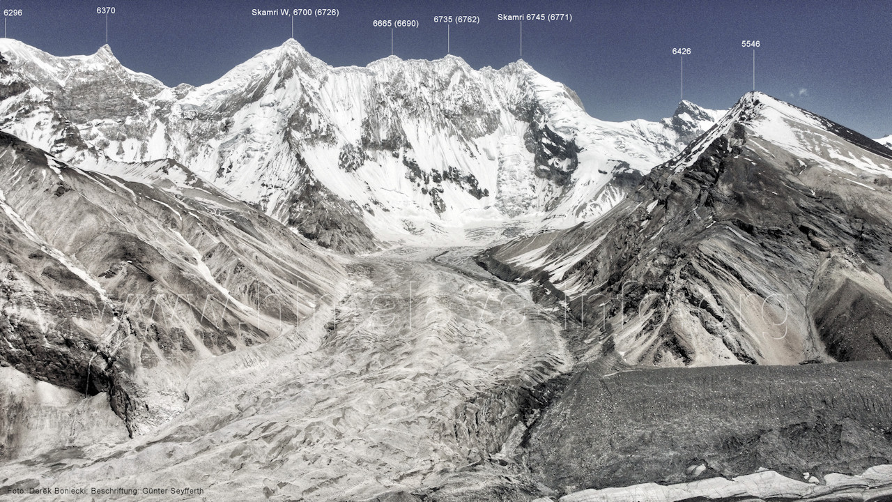 Drenmang-Gletschers in den Nobande Sobande-Gletscher, Foto: Derek Boniecki, 7. Aug. 2023; Beschriftung: Günter Seyfferth (C-4) Blick nach Nord-Nordosten zu den westlichen Gipfeln des Skamri-Massivs Über diese Gipfel verläuft die Grenze zu China. Foto: Derek Boniecki, 7. Aug. 2023; Beschriftung: Günter Seyfferth D.Startpunkt