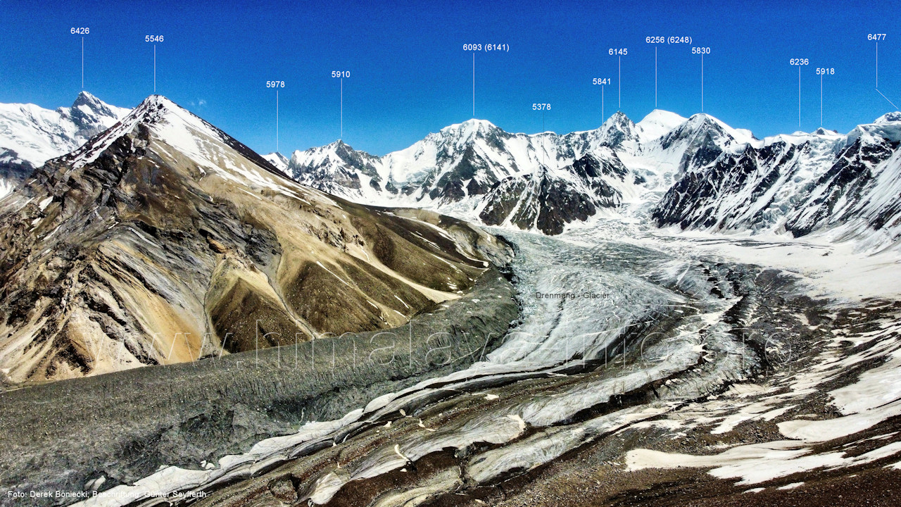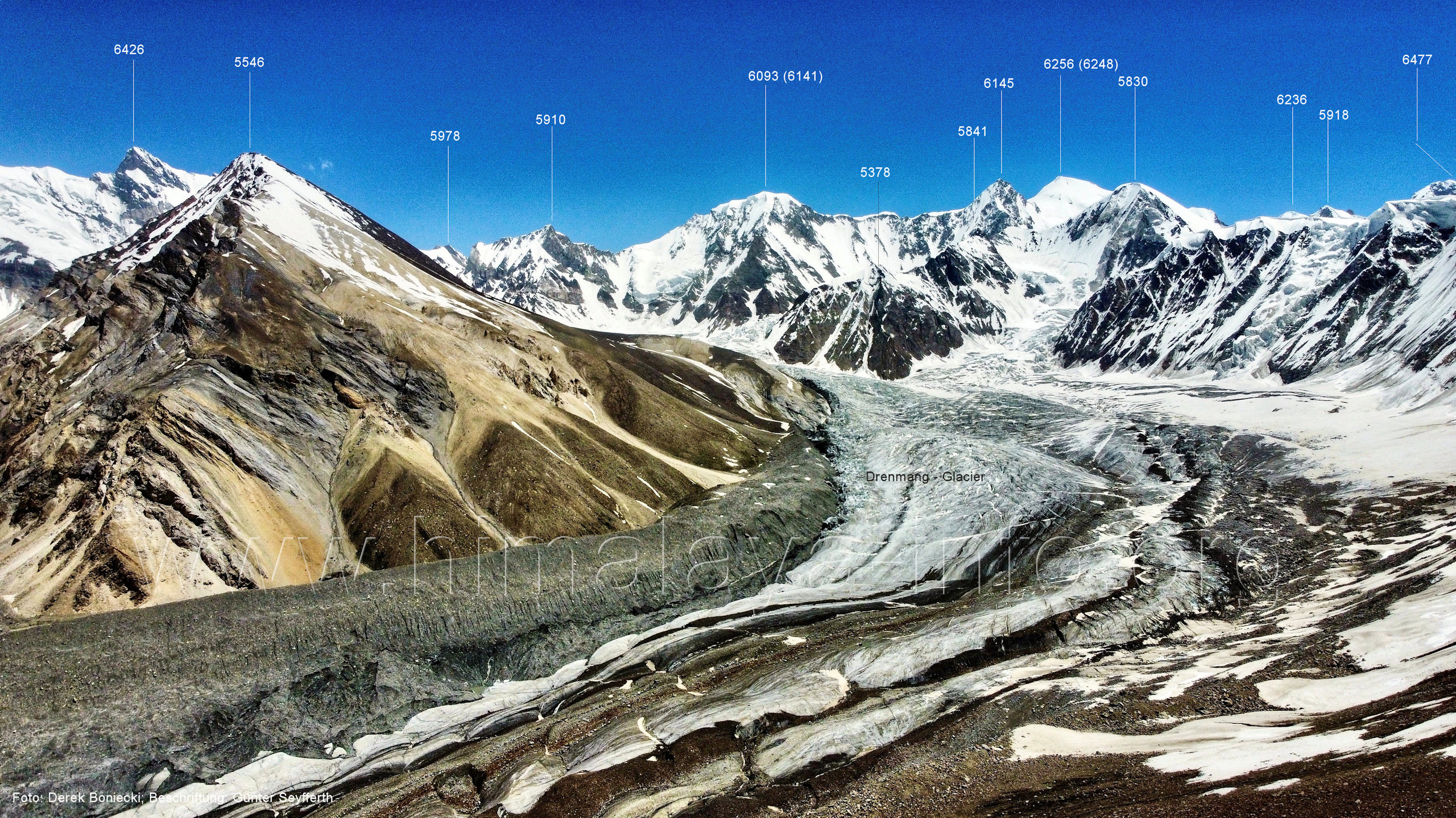 Sobande-Gletscher und auf den von Osten einmündenden Drenmang-Gletscher. Foto: Derek Boniecki, 7. Aug. 2023; Beschriftung: Günter Seyfferth (C-3) Blick nach Nordwesten bis Norden In Bildmitte sieht man die Mündung des