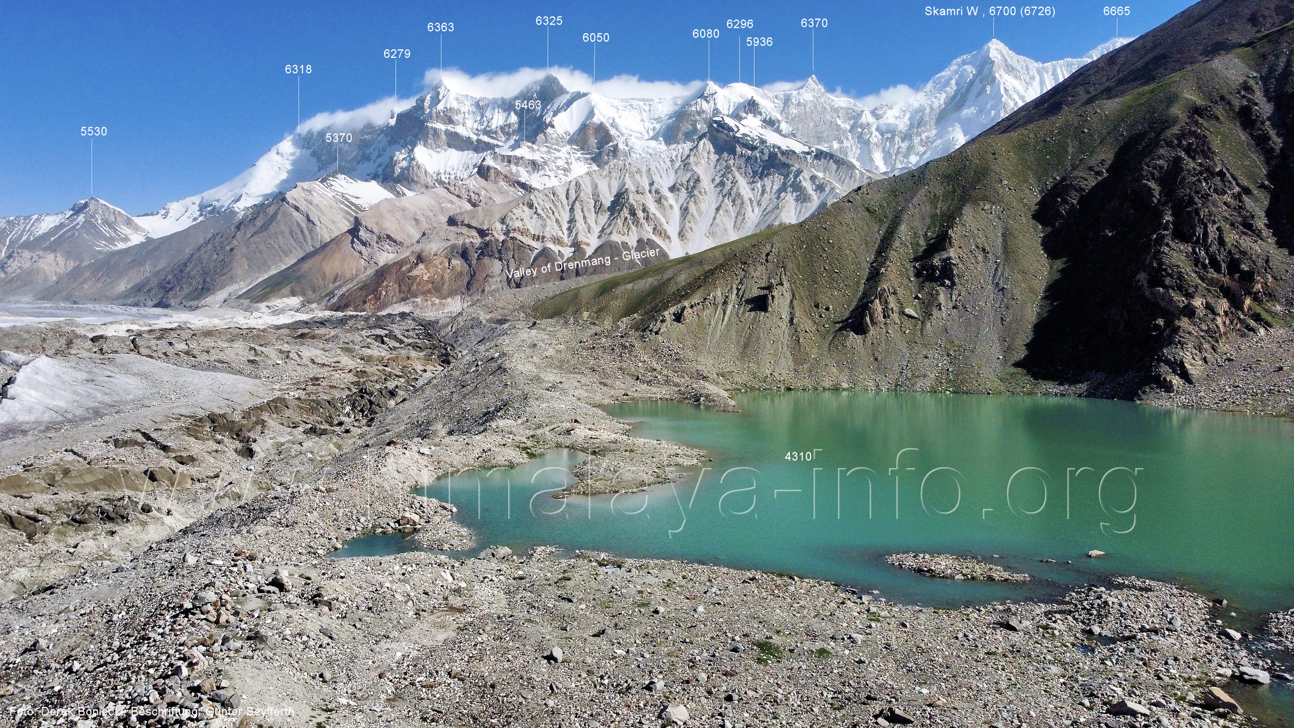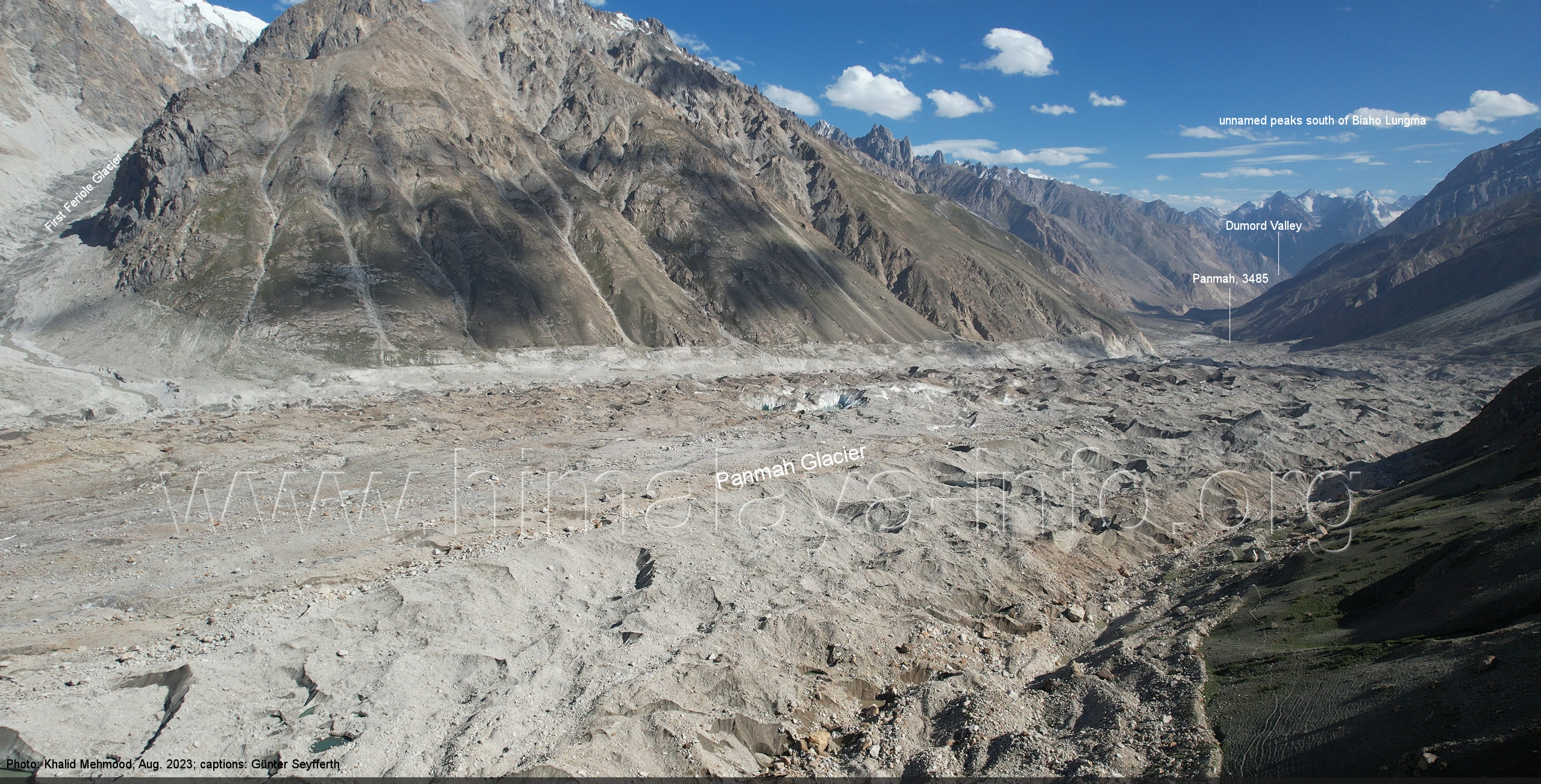 Panmah-Gletscher. (A1-1) Blick enlang des Panmah-Gletschers nach Süden Wenn man von Süden durch das Dumord-Tal heraufkommt, wird am markierten Rastplatz Panmah in 4385 m Höhe vor der Stirnmoräne des Gletschers gezeltet. Foto: Khalid Mehmood, 21.08.2023; Beschriftung: Günter Seyfferth (A-2) Blick nach Nordosten zum Nobande Sobande-Gletscher mit dem Massiv des Skamri (6745 m)Hier geht der Blick auf den Punkt der