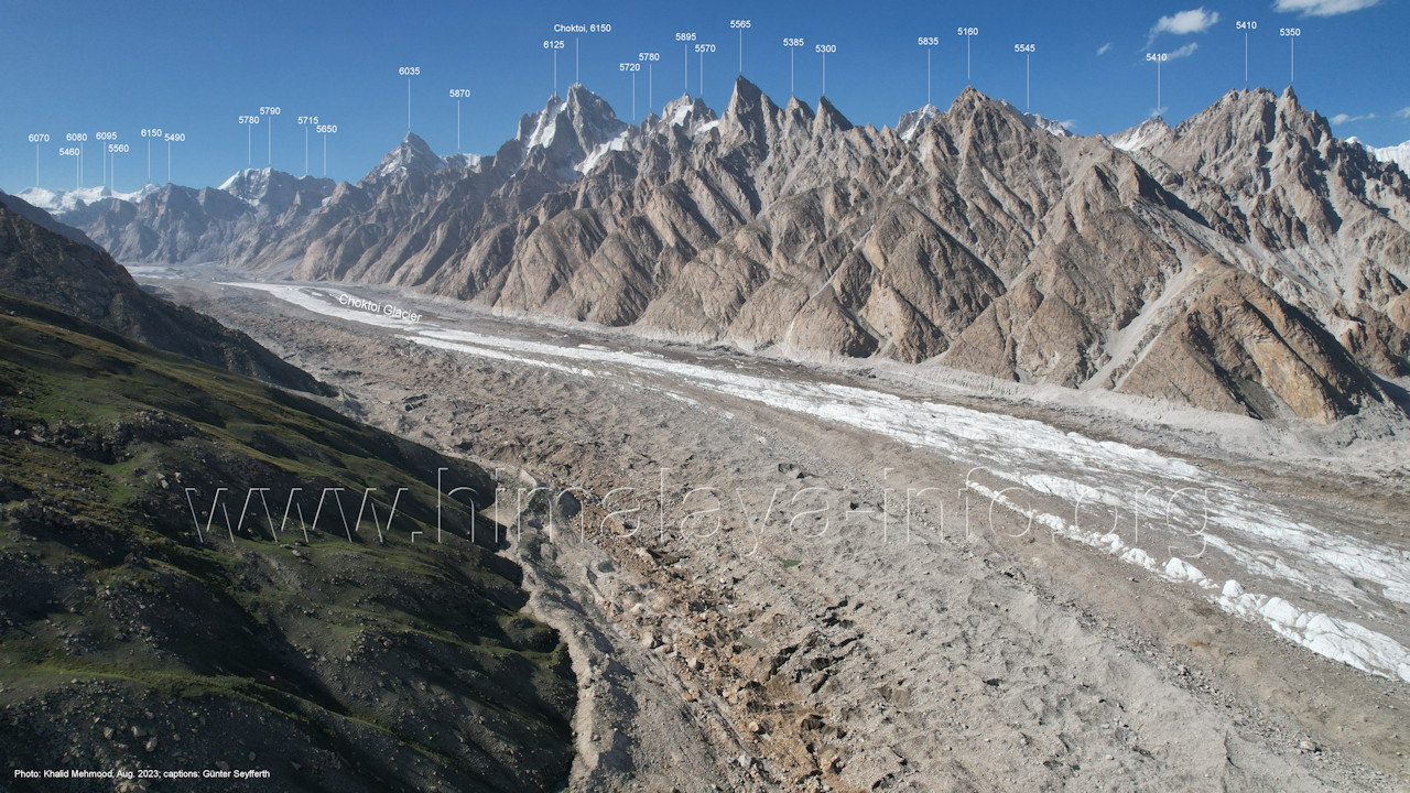 Panmah-Gletscher. Foto: Khalid Mehmood, 21.08.2023; Beschriftung: Günter Seyfferth (A-3) Blick nach Norden entlang des Choktoi-Gletschers zu den Bergen an seinem Ostrand Der Choktoi (6150 m) ist der höchste Gipfel der Berggruppe zwischen Choktoi-Gletscher und Nobande Sobande-Gletscher. Foto: Khalid Mehmood, 21.08.2023; Beschriftung: Günter Seyfferth B. Über