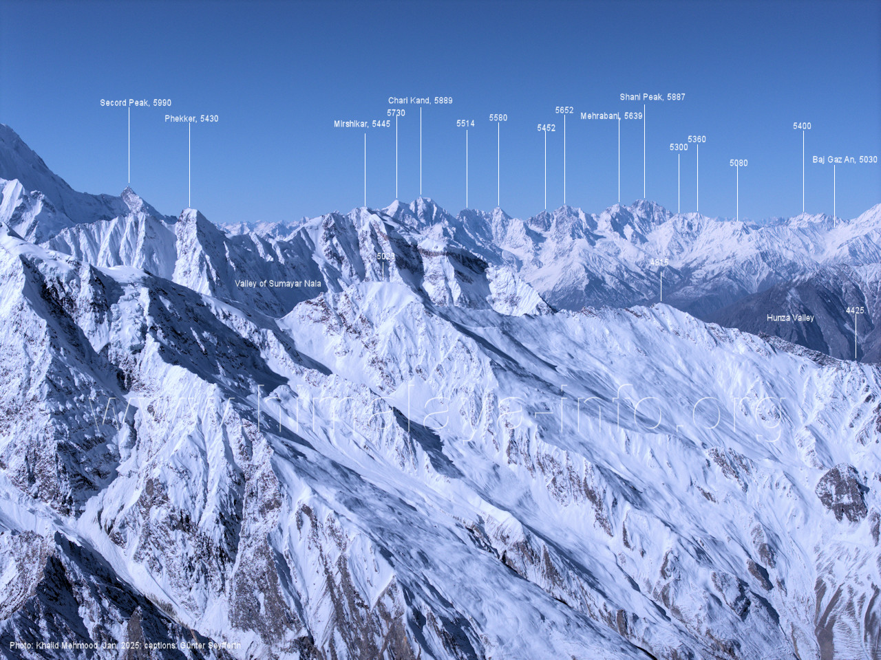 Sar W (7170 m), Momhil Sar (7440 m), Peak 6695 und Borondo Sar (6453 m)