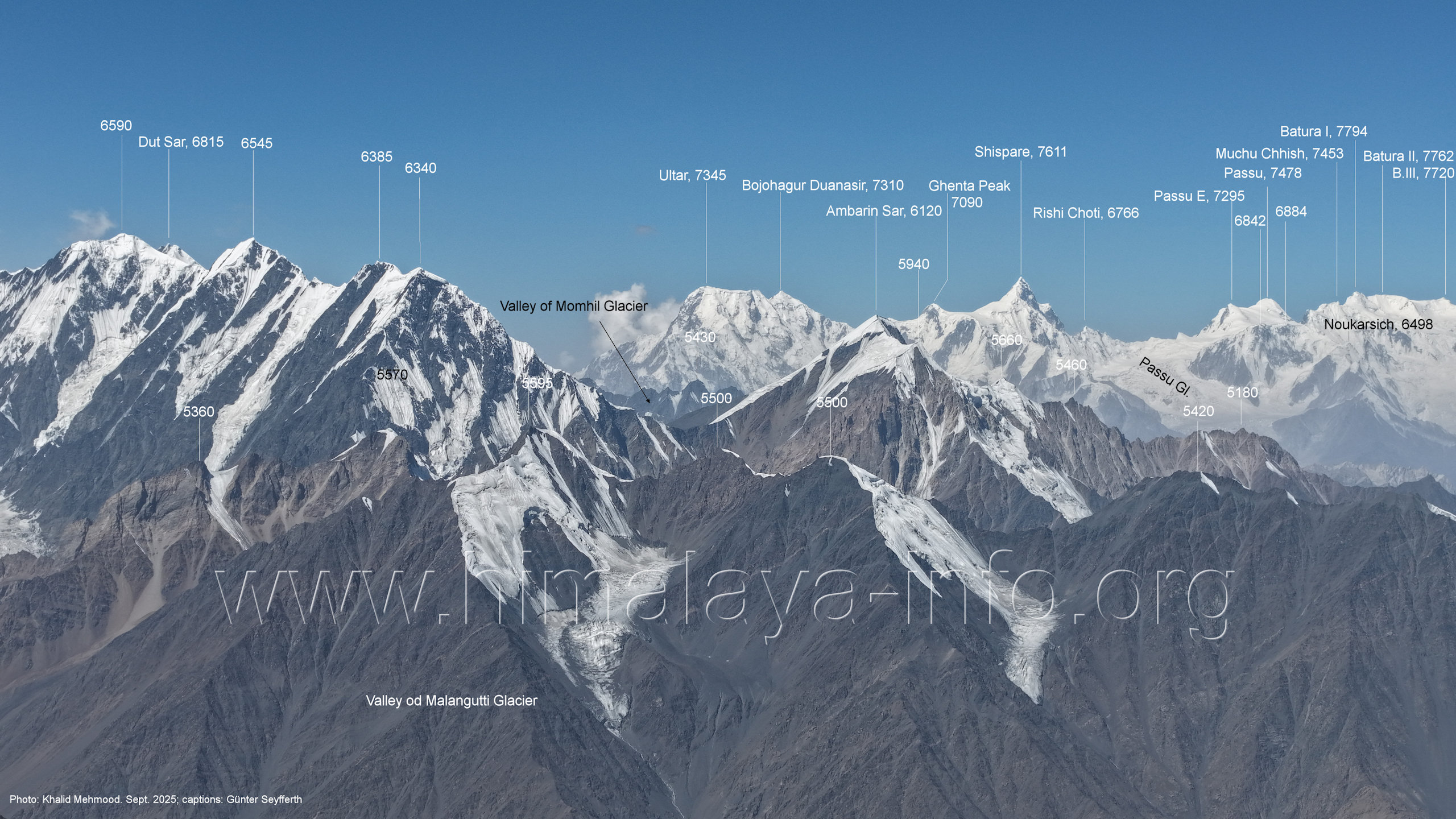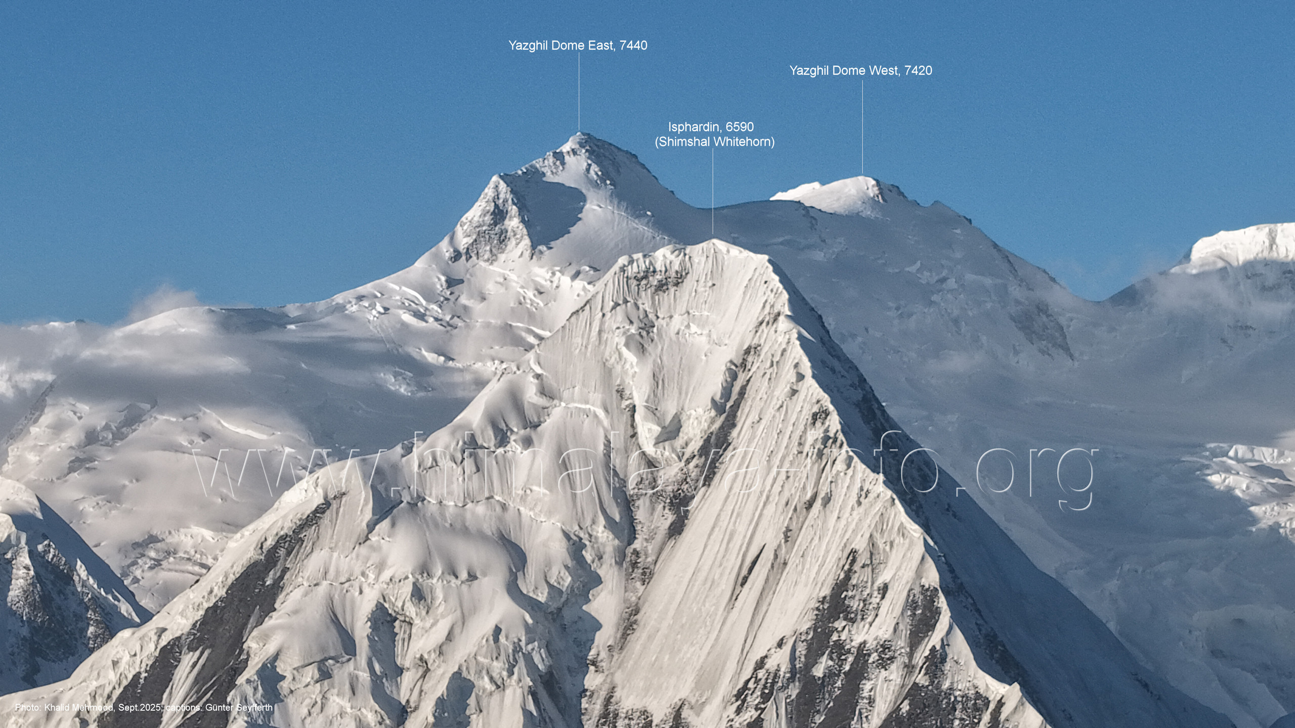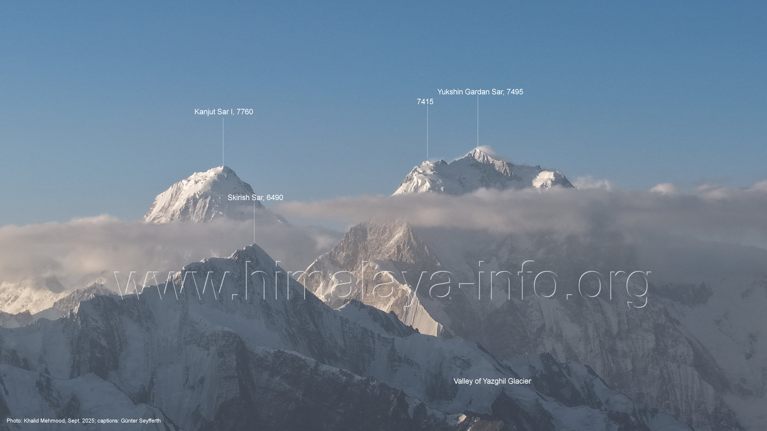 Folgende Links führen zu den Beschreibungen der gezeigten Regionen mit Landkarten: - Karakorum - Shimshal-Region Sued - Karakorum - Shimshal-Region Nord Für alle Bilder dieses Abschnitts gilt: Bildautor: Khalid Mehmood, Beschriftungen: Günter Seyfferth Startpunkt 36°26'17" N, 75°19'06" E am 1. Sept. 2025 in Shimshal (3100 m) Die Bildfolge beginnt mit der Sicht zum Kanjut Sar I und setzt sich jeweils nach rechts fort. (1) Blick nach Süd-Südosten mit Kanjut Sar I (7760 m) und Yukshin Gardan Sar (7495 m) Der Kanjut Sar I ist der östlichste der Siebentausender des Hispar Muztagh. (2) Blick nach Süden zu den beiden Gipfeln des Yazghil Dome (7440 m und 7420 m) und zum Isphardin (6590 m) Die Pioniere der Erkundung des