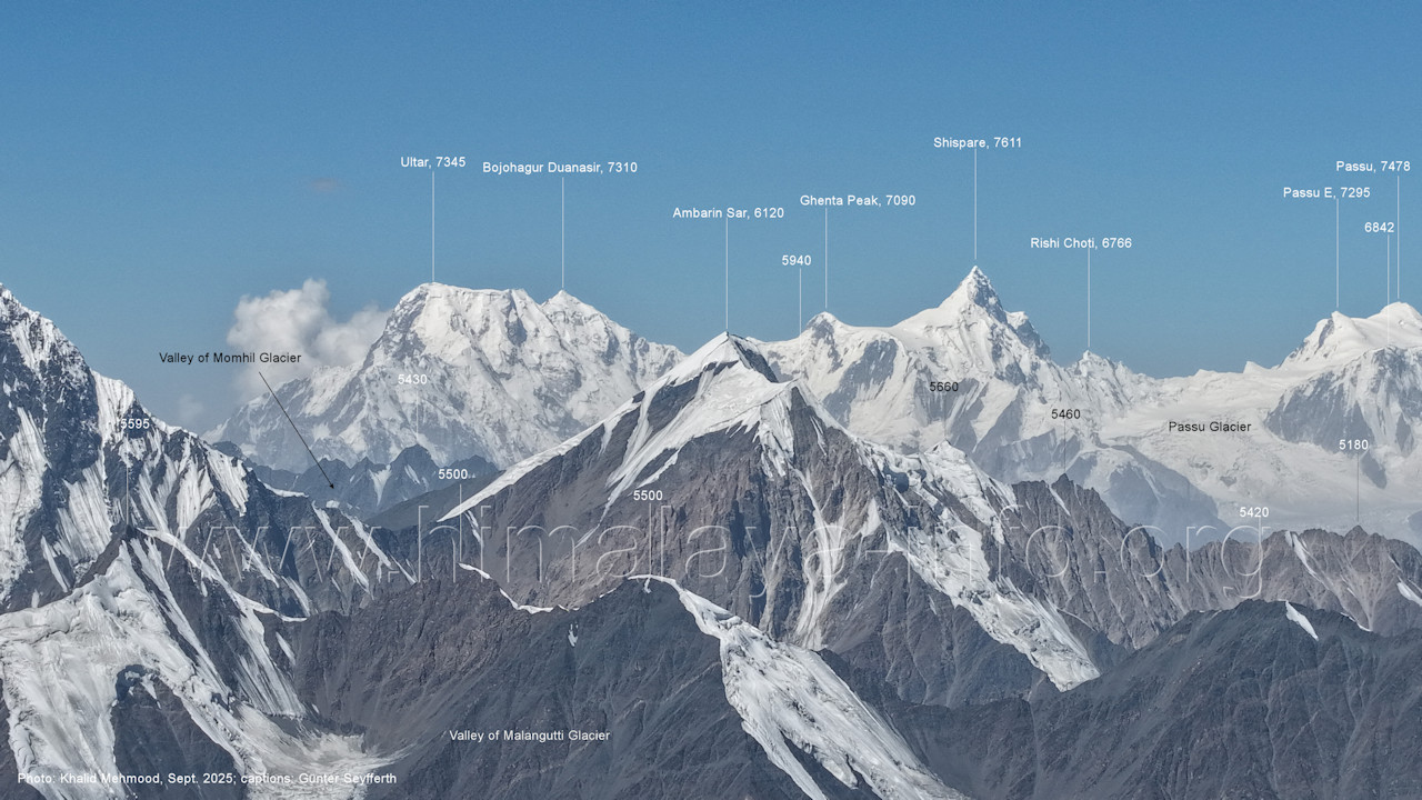 Hispar Muztagh. (4) Blick nach Süd-Südwesten zum Massiv des Disteghil Sar (7885 m) (5) Blick nach Südwesten mit Malangutti Sar (7175 m), Lupghar Sar (7230 m) und Dut Sar (6815 m) Im Vordergrund geht der Blick in das weite Becken des Malangutti-Gletschers. (6) Blick nach West-Südwesten mit Dut Sar (6815 m), Ultar (7345 m), Shispare (7611 m), Passu (7478 m), Muchhu Chhish (7543 m) und Batura I (7794 m) Ziwischen den Bergen des Hispar Muztagh