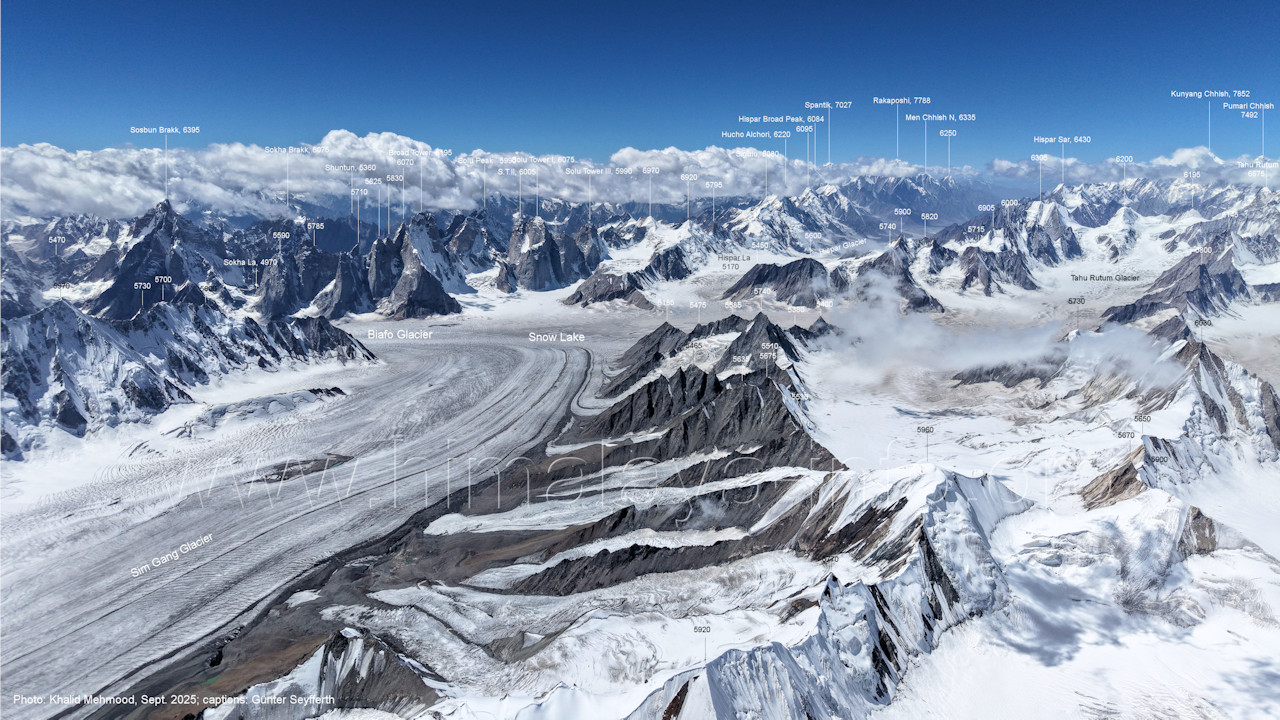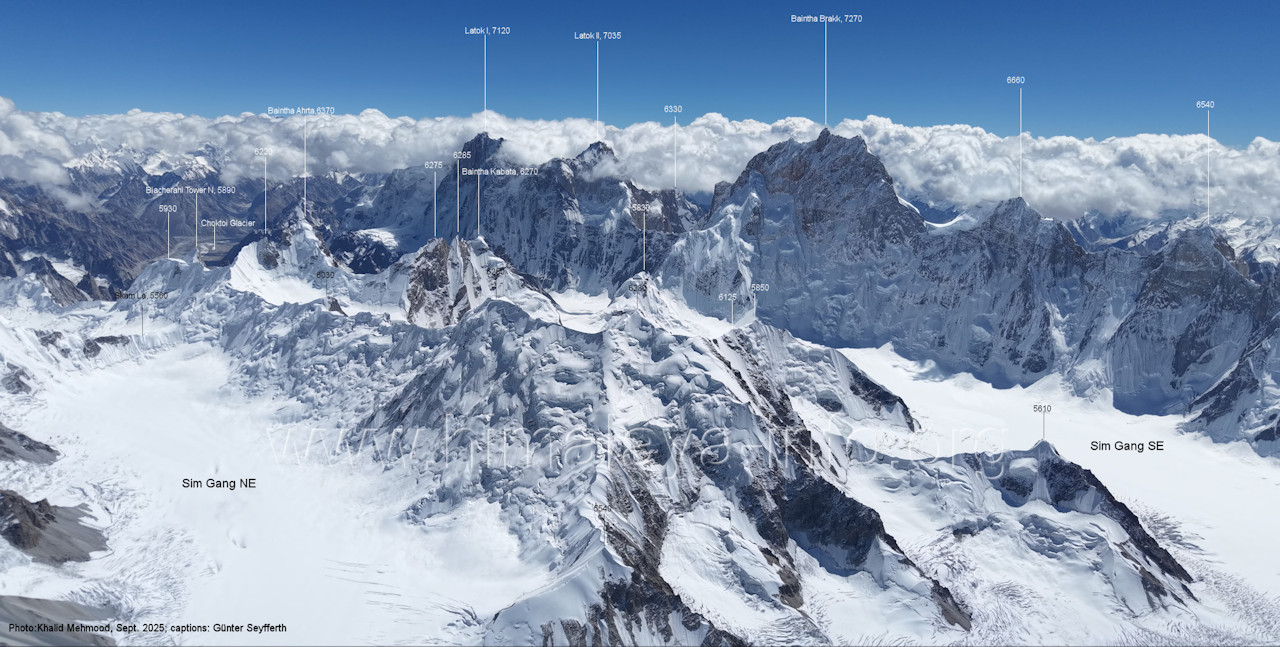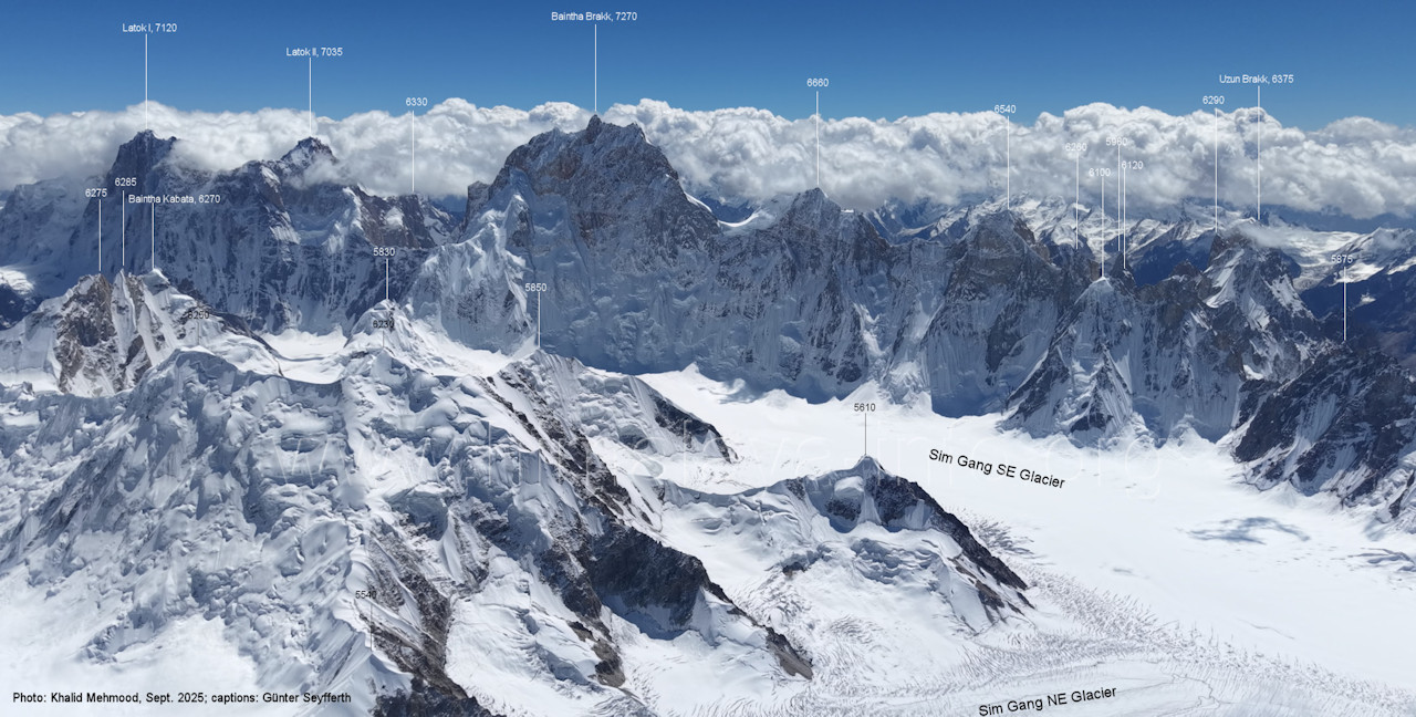II (7035 m), Baintha Brakk (7270 m) Die Nordwand des Bainthe Brakk ist noch unbezwungen (Stand 2025), die Nordwände der unbenannten Gipfel ohnehin. (B4-12) Blick nach Südwesten zum Sim Gang-Gletscher und zu den Gipfeln beidseits des oberen Biafo-Gletschers