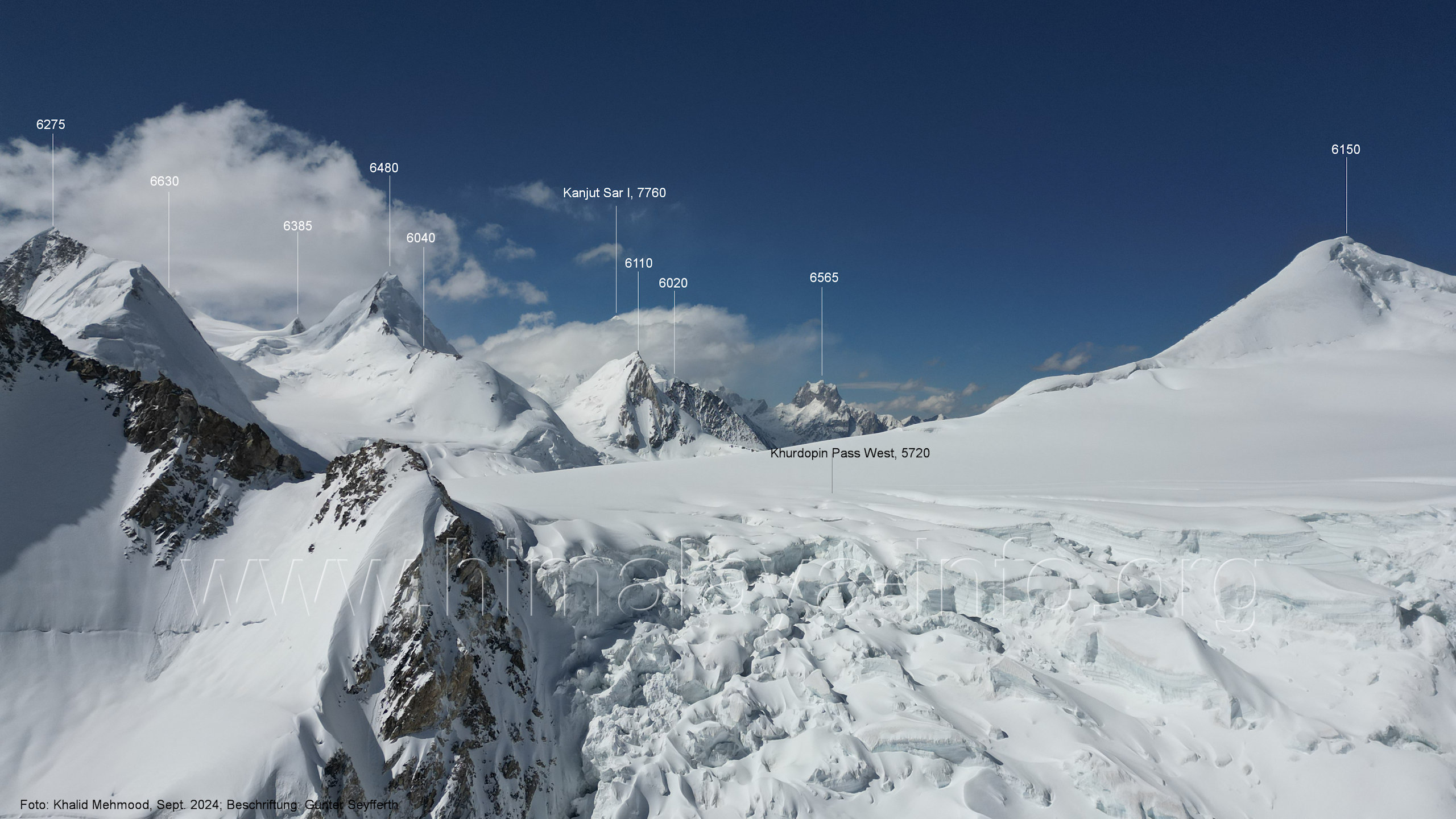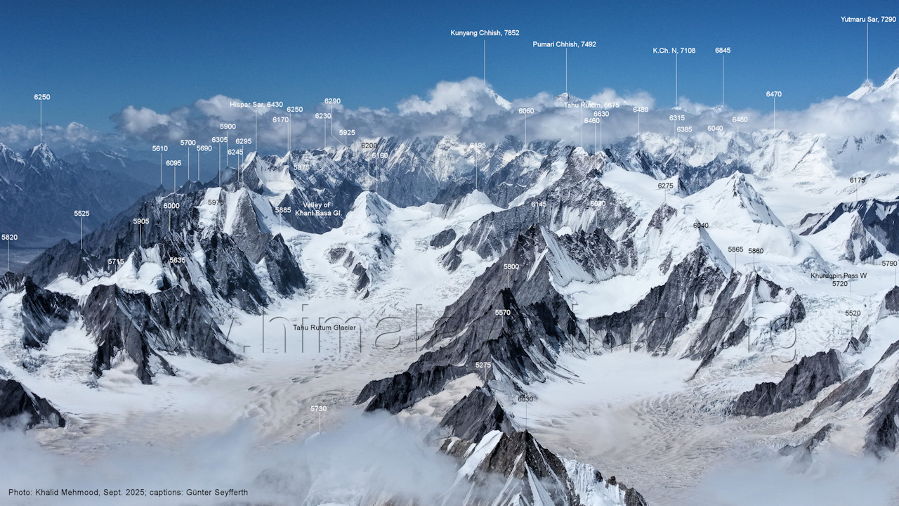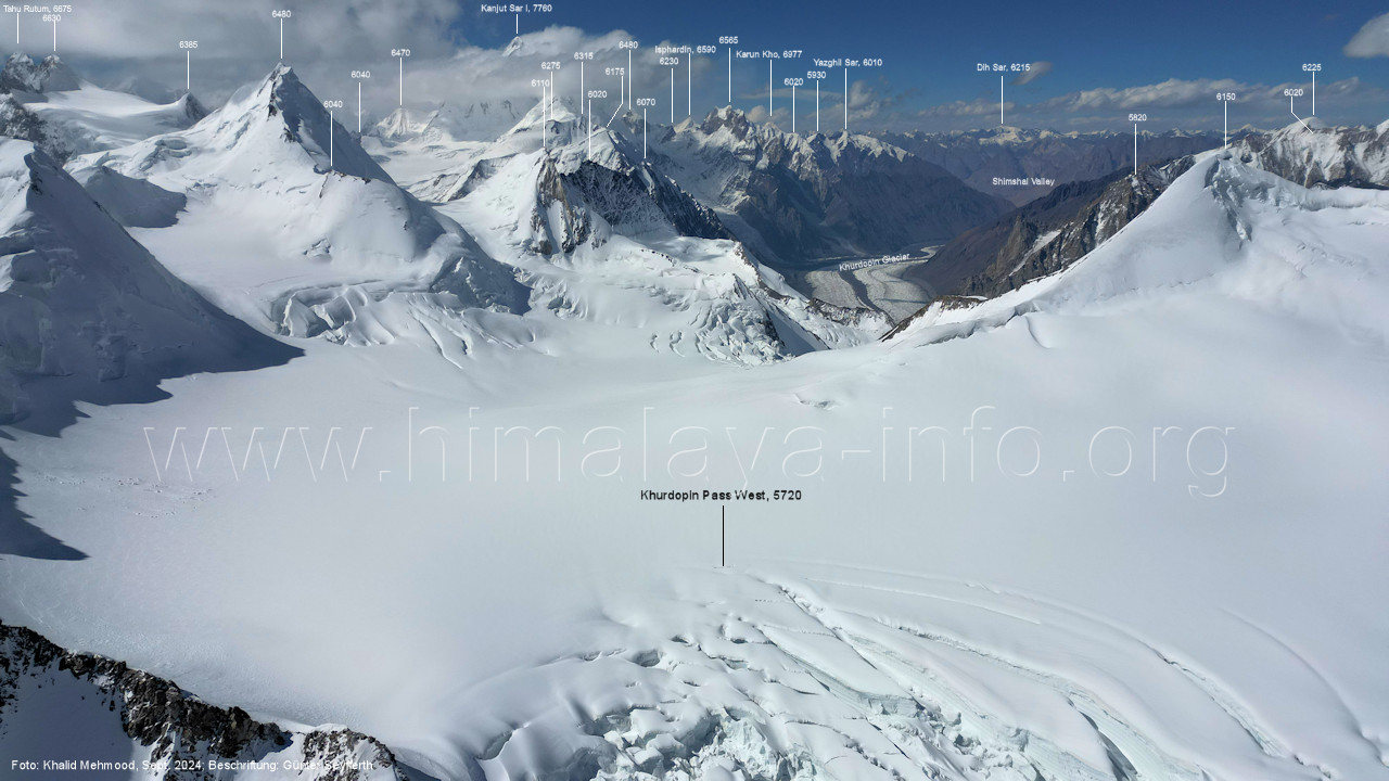 nach dem Start in der Regel natürlich ihre Positionen Für alle Bilder dieses Unterabschnitts gilt: Foto: Khalid Mehmood, Beschriftung: Günter Seyfferth Die Bildfolge beginnt mit der Sicht nach Nordwesten und setzt sich jeweils nach rechts fort. (A6-1) Blick nach Nord-Nordwesten zum Khurdopin-Pass West (5720 m) Vom