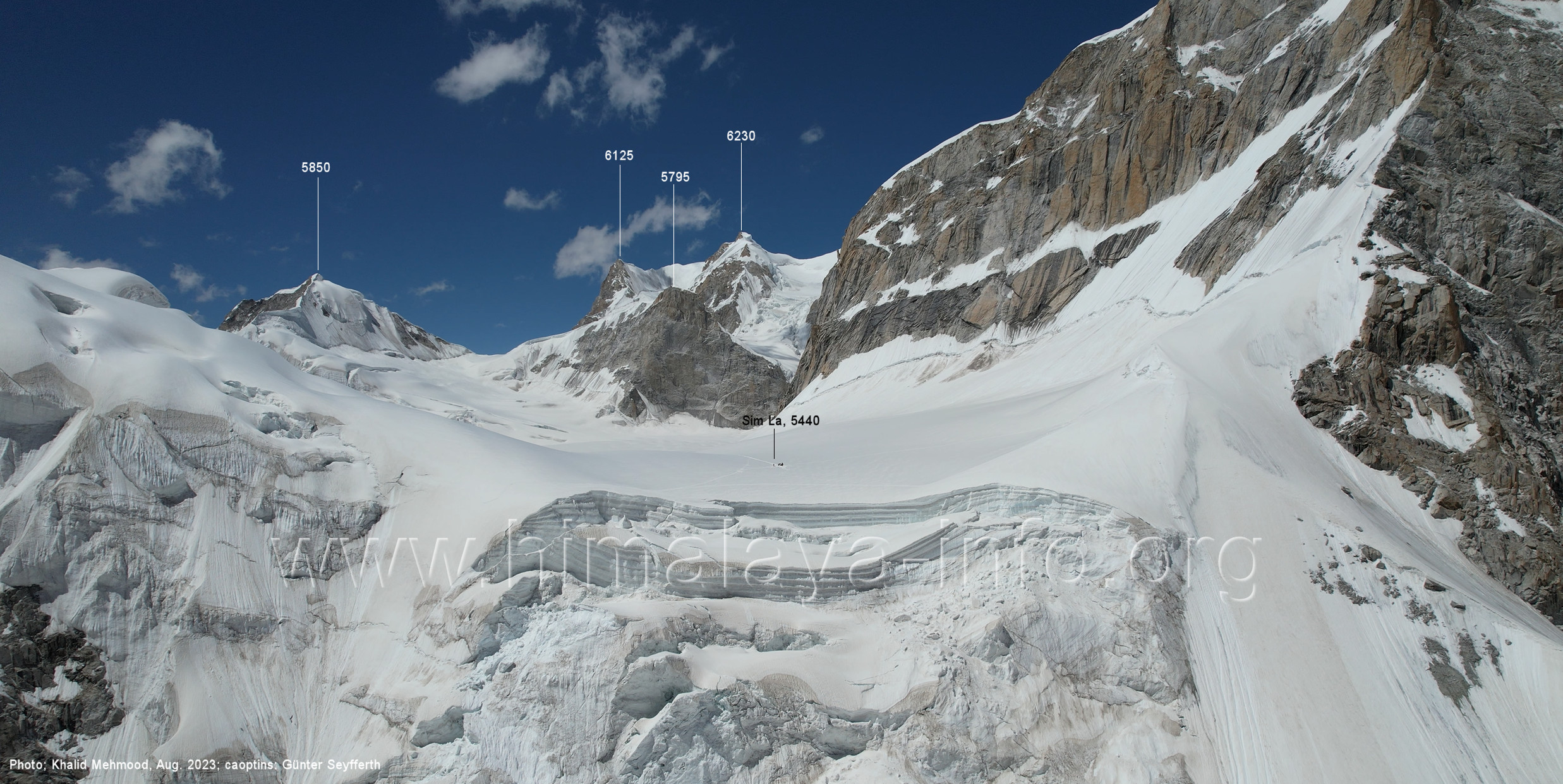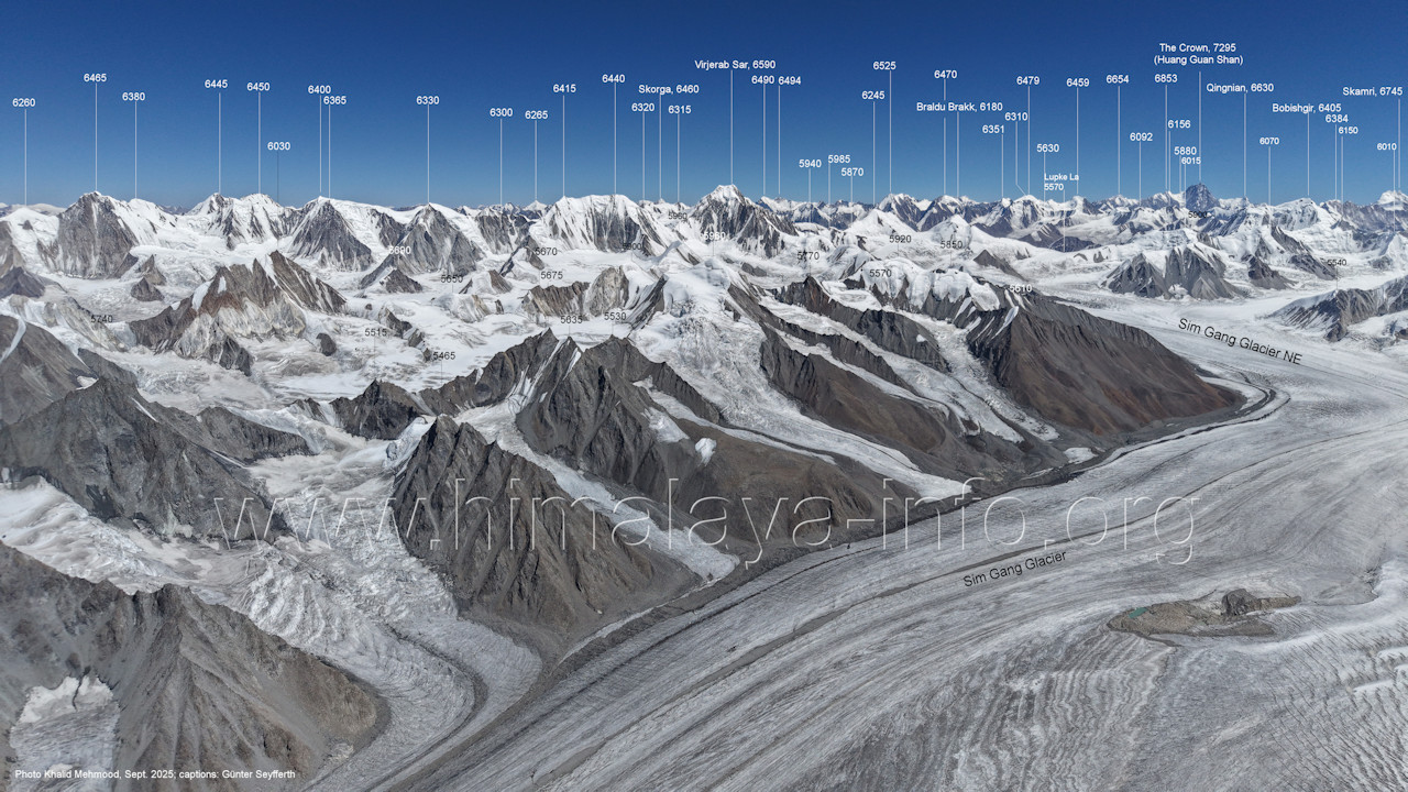 südöstlichen SimGang-Gletscher Der Flug erfolgte im Bereich zwischen Peak 5850 und Peak 6660, also etwas östlich vom Flug gemäß des vorstehenden Abschnitts. Für alle Bilder dieses Unterabschnitts gilt: Foto: Khalid Mehmood, Beschriftung: Günter Seyfferth (B2-1) Blick nach Ost-Südosten zum Sim La (5440 m)