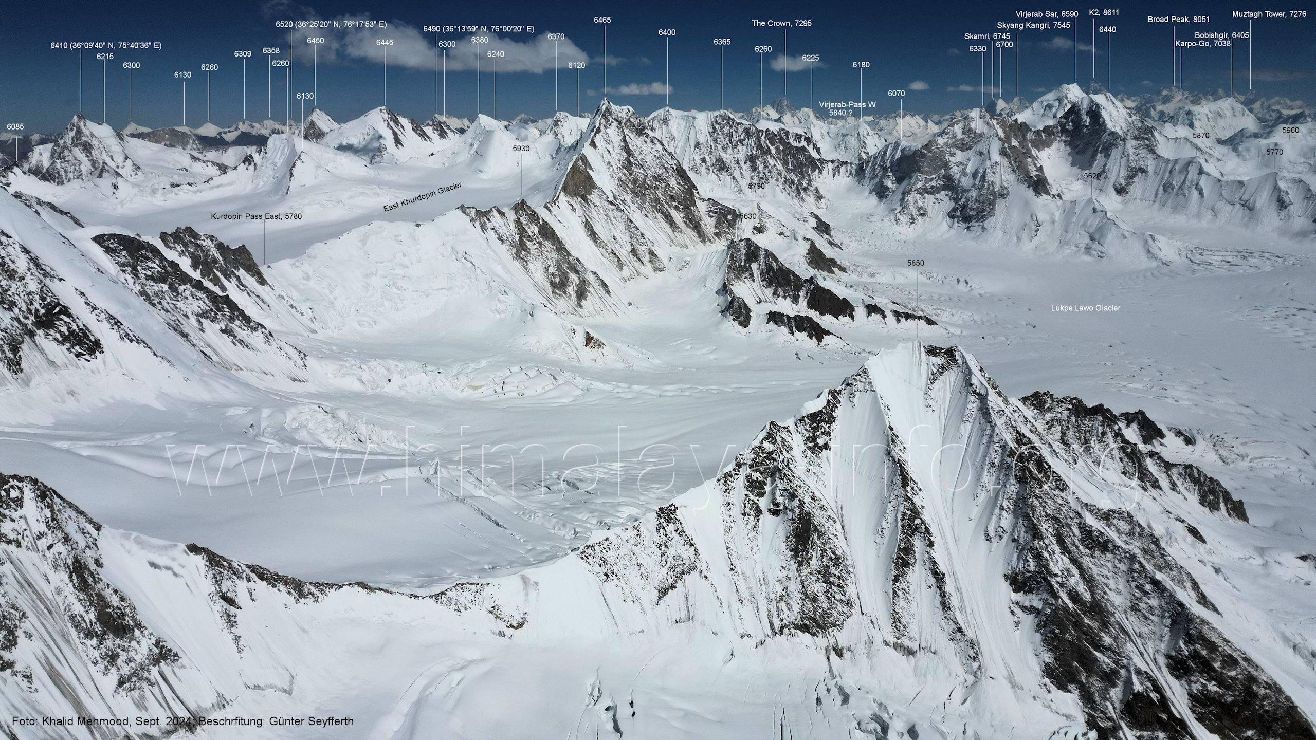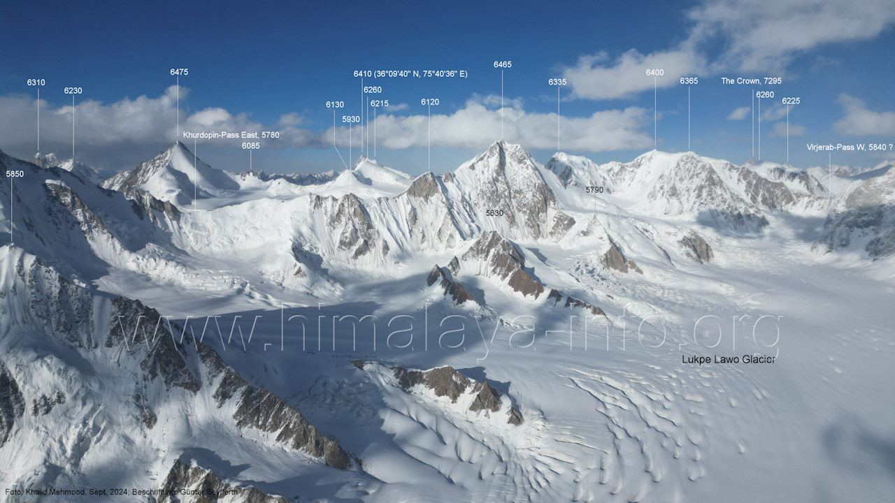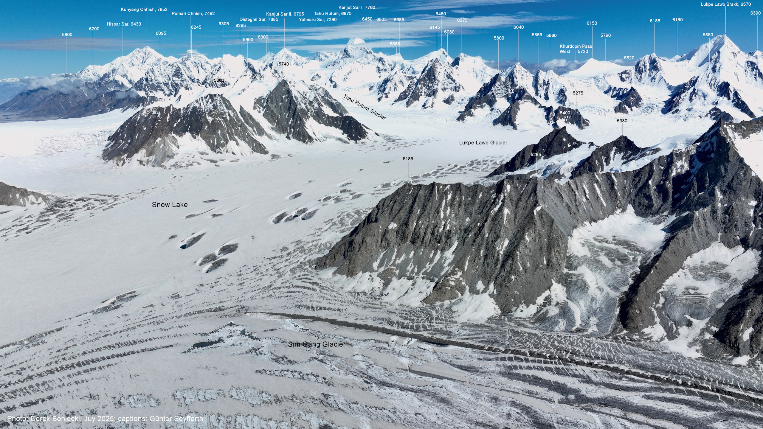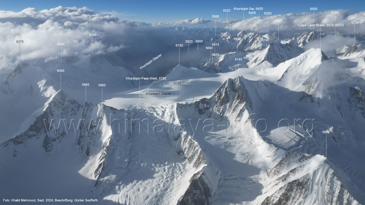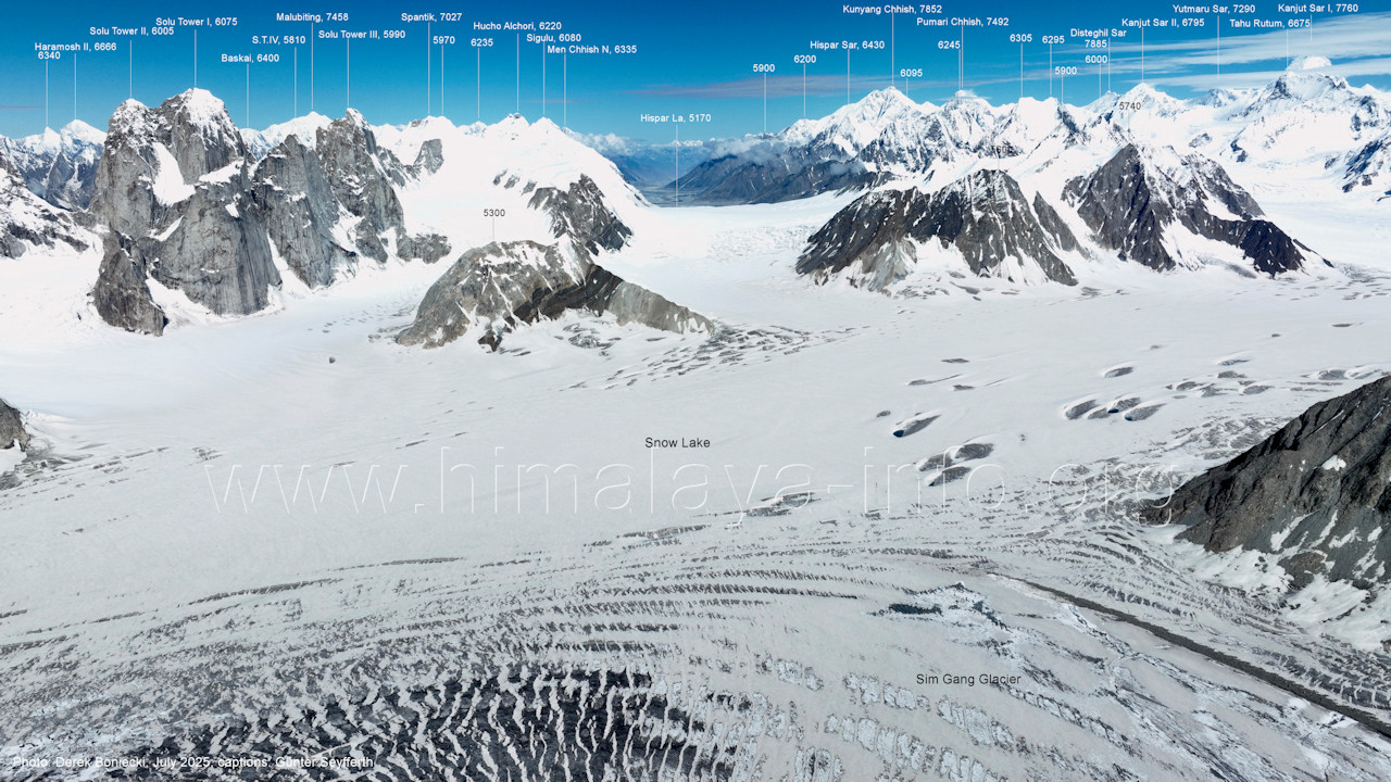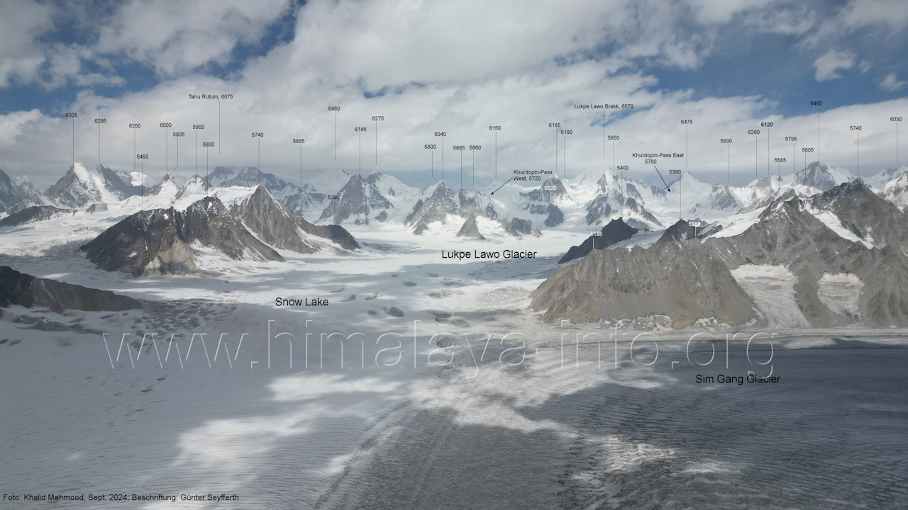 entstanden im Jahr 2024, in dem deutlich mehr Schnee auf dem Gletschereis lag (A5-2) Blick nach Norden mit Khurdopin-Pass West (5720 m) und Lukpe Lawo Brakk (6570 m) Der Aufstieg zum Khurdopin-Pass führt