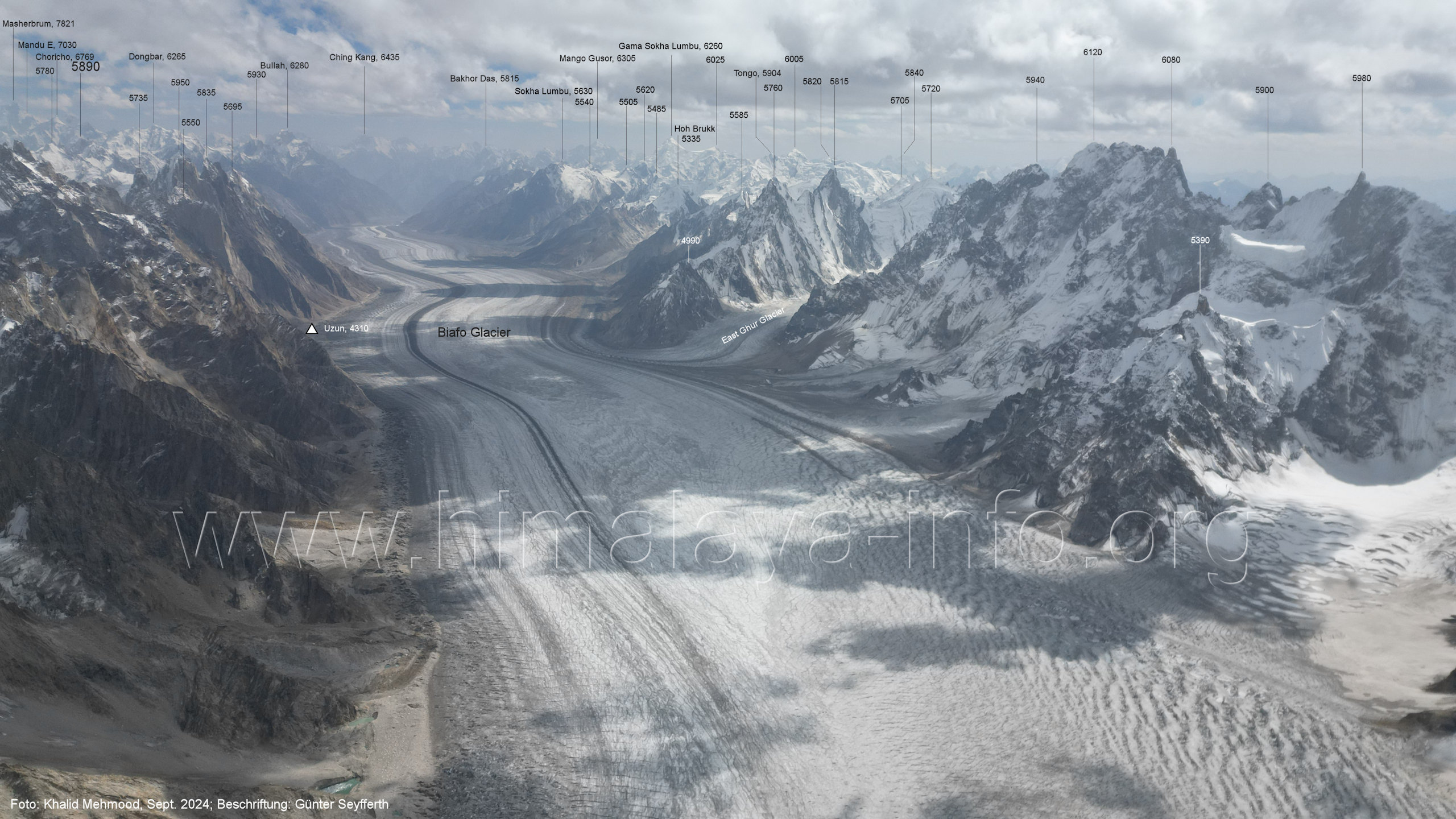 Gang-Gletscher Der Flug erfolgte im Bereich der Vereinigung des nordöstlichen und des südöstlichen Gletscherarms. Für alle Bilder dieses Unterabschnitts gilt: Foto: Khalid Mehmood, Beschriftung: Günter Seyfferth (B1-1) Blick nach Osten entlang des südöstlichen Sim Gang-Gletschers