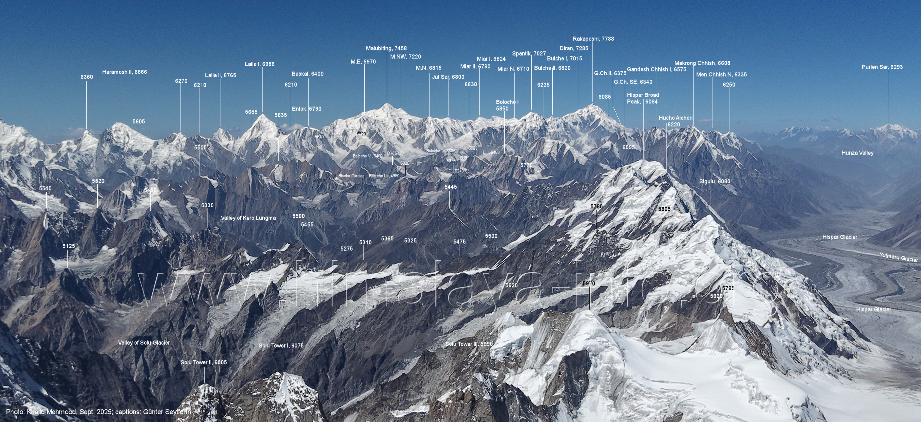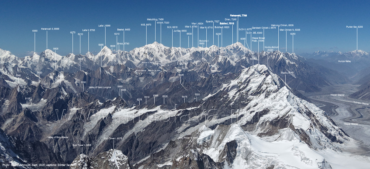 Haramosh II (6666 m), Laila I (6986 m), Malubiting (7458 m), Rechts ist das Hunza-Tal markiert.