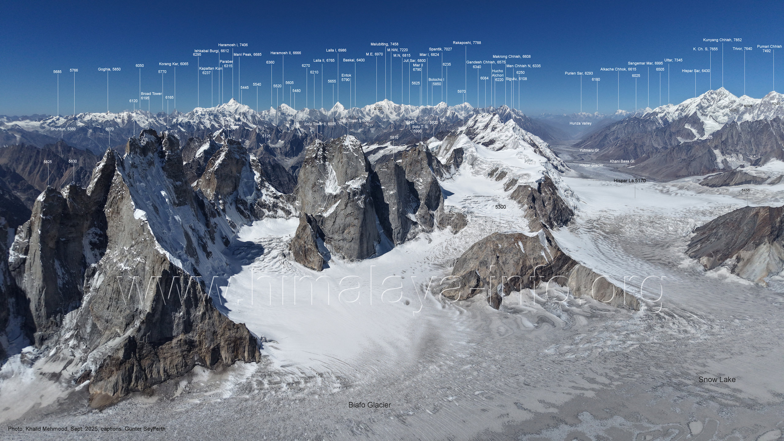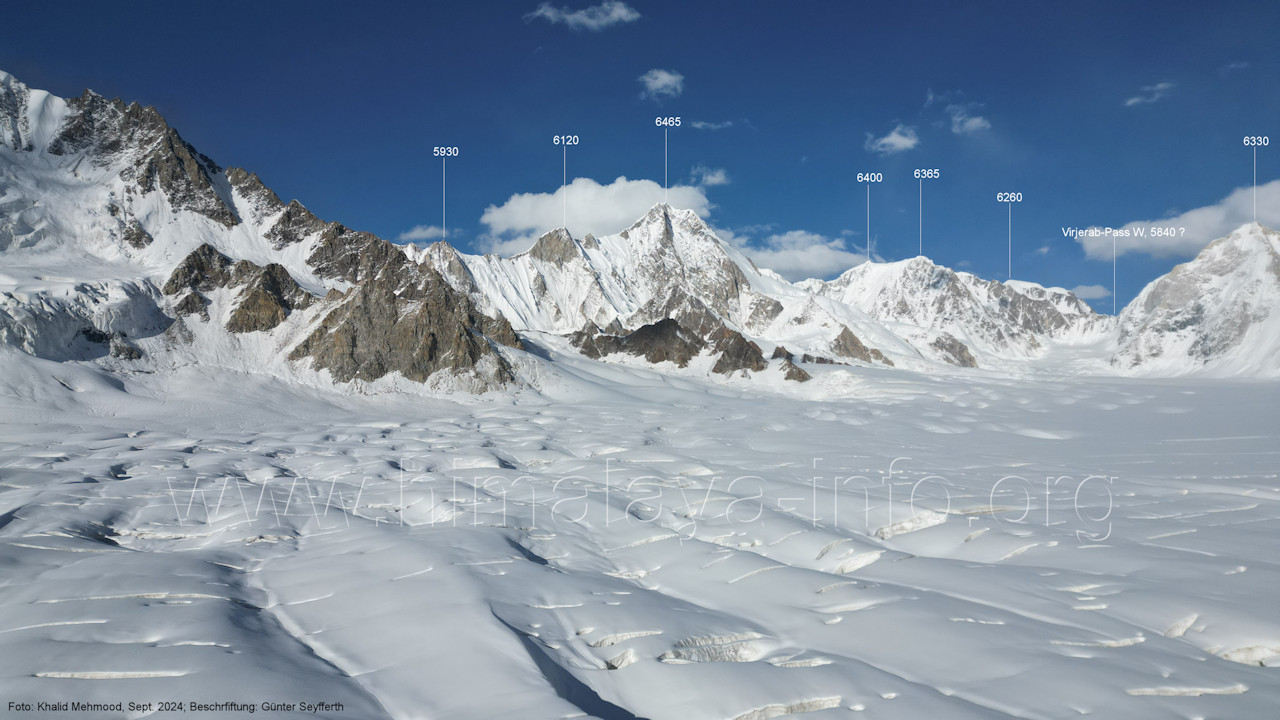 Virjerab-Pass Der Startpunkt liegt knapp unterhalb des Virjerab-Passes. Für alle Bilder dieses Unterabschnitts gilt: Foto: Khalid Mehmood, Beschriftung: Günter Seyfferth Die Bildfolge beginn mit dem Blick nach Südwesten uns setzt sich nach rechts fort, also im Uhrzeigersinn. (B5-1) Blick nach Südwesten in den mittelren und südwestlichen teil des Snow Lake