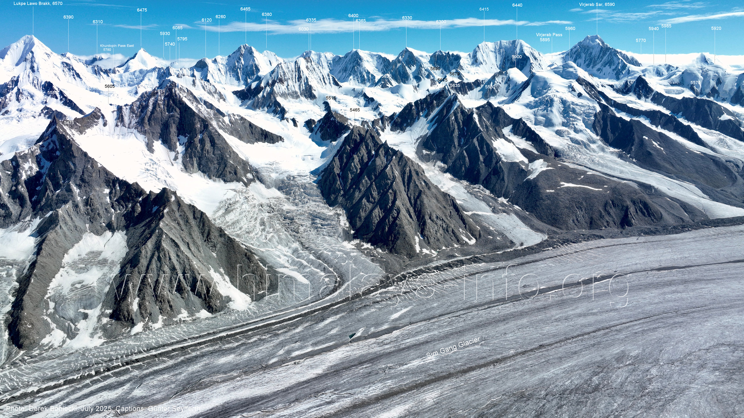 35°59'44" N, 75°37'04" E am westlichen Sim Gang-Gletscher Für alle Bilder dieses Unterabschnitts gilt: Foto: Derek Boniecki, Beschriftung: Günter Seyfferth Die Bildfolge beginnt mit der Sicht nach Norden und setzt sich jeweils nach rechts fort. (A4-1) Blick nach Norden mit Kanjut Sar I (7760 m) und Lukpe Lawo Brakk (6570 m) Die Schneeauflage der Gletscher ist hier - im Juli 2025 - noch besser als auf den Bildern in Abschnitt A3, die 2 Monate später aufgenommen wurden. (A4-2) Blick nach Nord-Nordosten mit Lukpe Lawo Brakk (6570 m), Peak 6465, Peak 6400, Peak 6440 und Virjerab Sar (6590 m) Die Gipfelkette im Vordergrund trennt