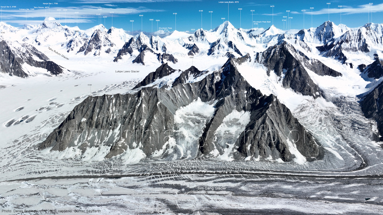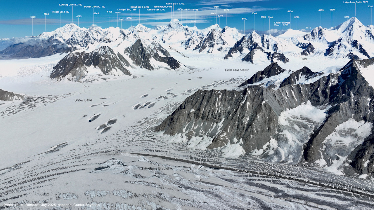 wo die Position der Drohne weiter links war. (B5-2) Blick nach Westen entlang der Gipfelkette am Nordrand des Snow Lake mit dem Lukpe Lawo Brakk (6570 m) Bitte vergleichen Sie mit BIld Nr. B4-3. (B5-3) Blick nach Norden entlang des Virjerab-Gletschers