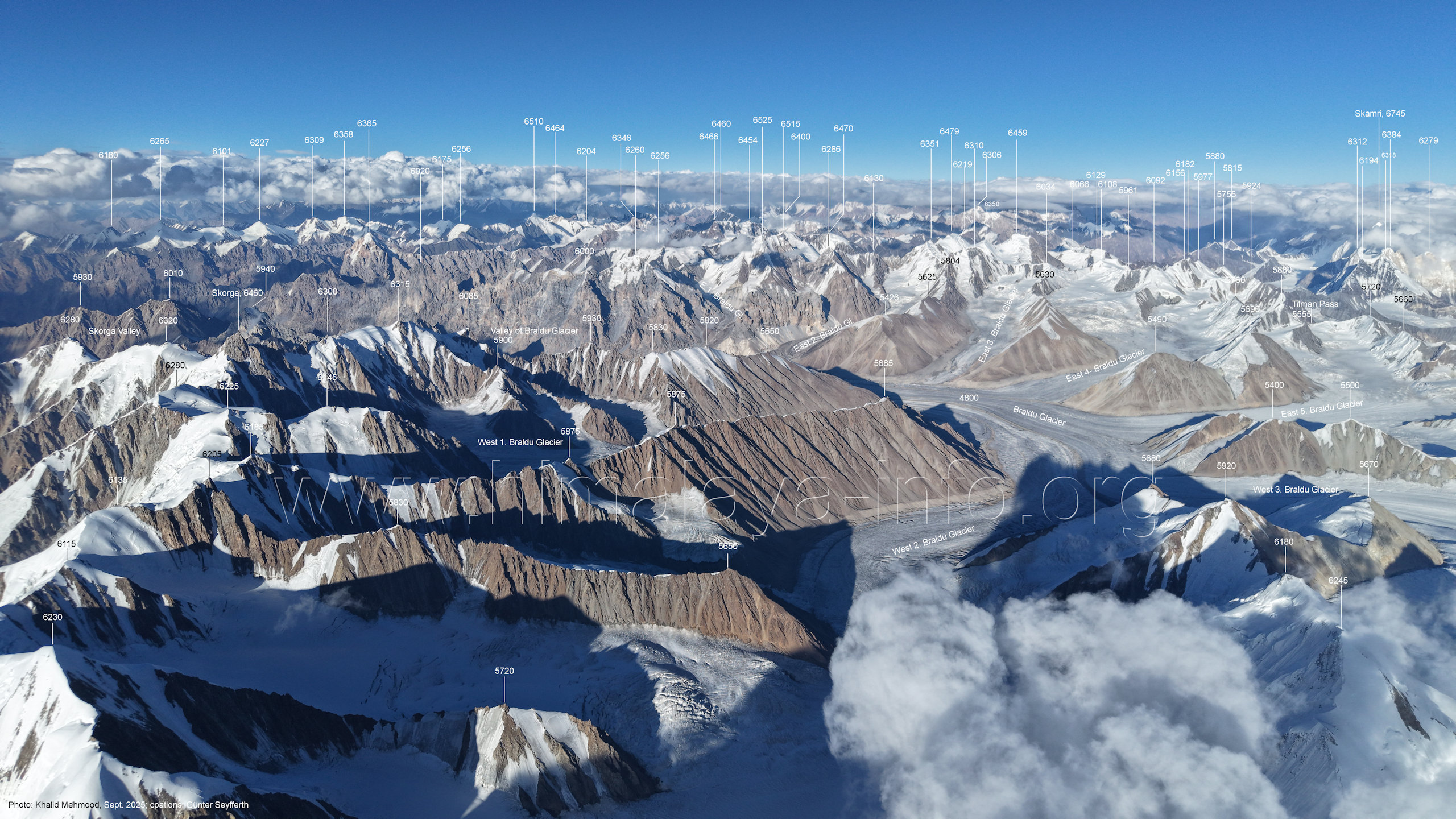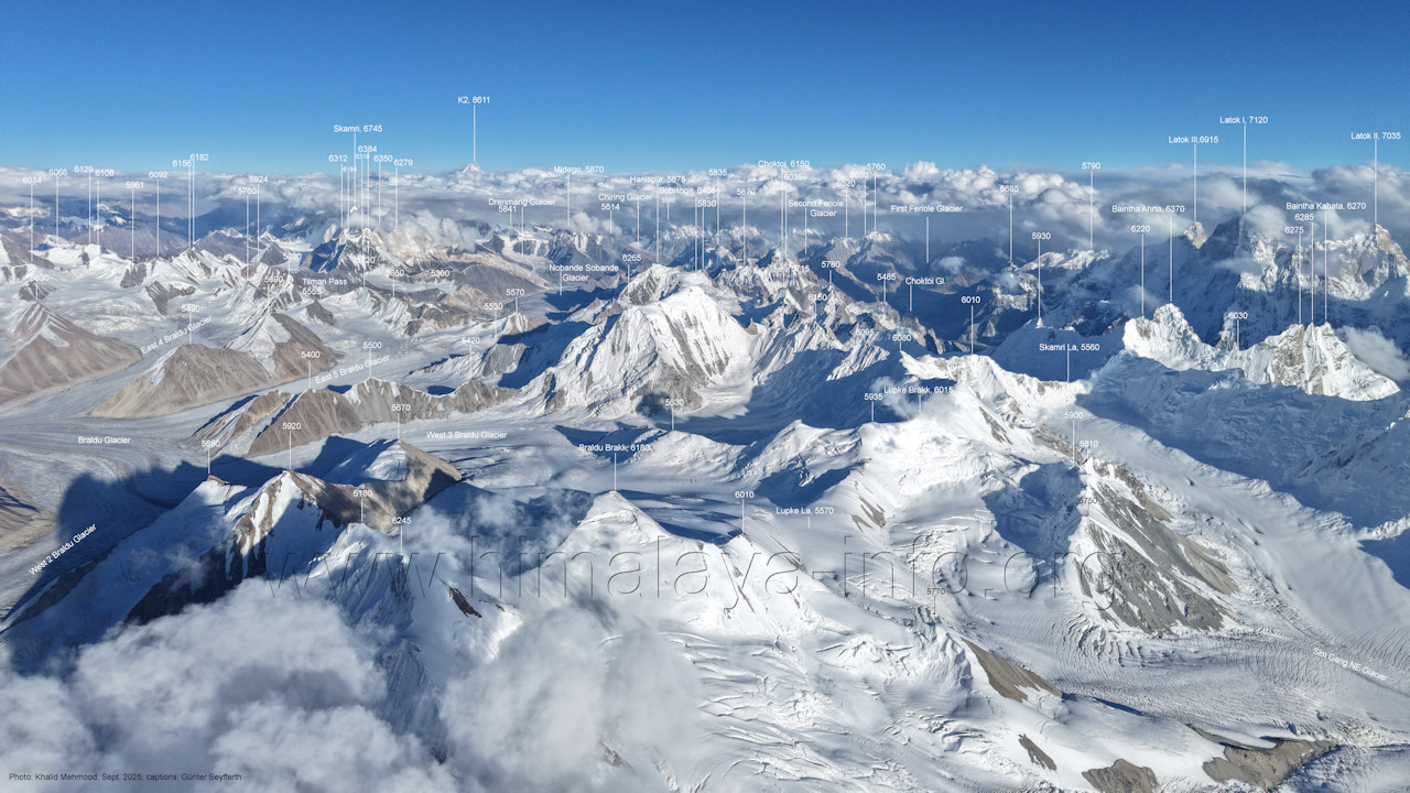 Flughöhe niedriger. (A2-5) Blick nach Südwesten mit Sosbun Brakk (6395 m), Sokha Brakk (6075 m) und Broad Tower (6195 m) Im Hintergrund geht der Blick in den