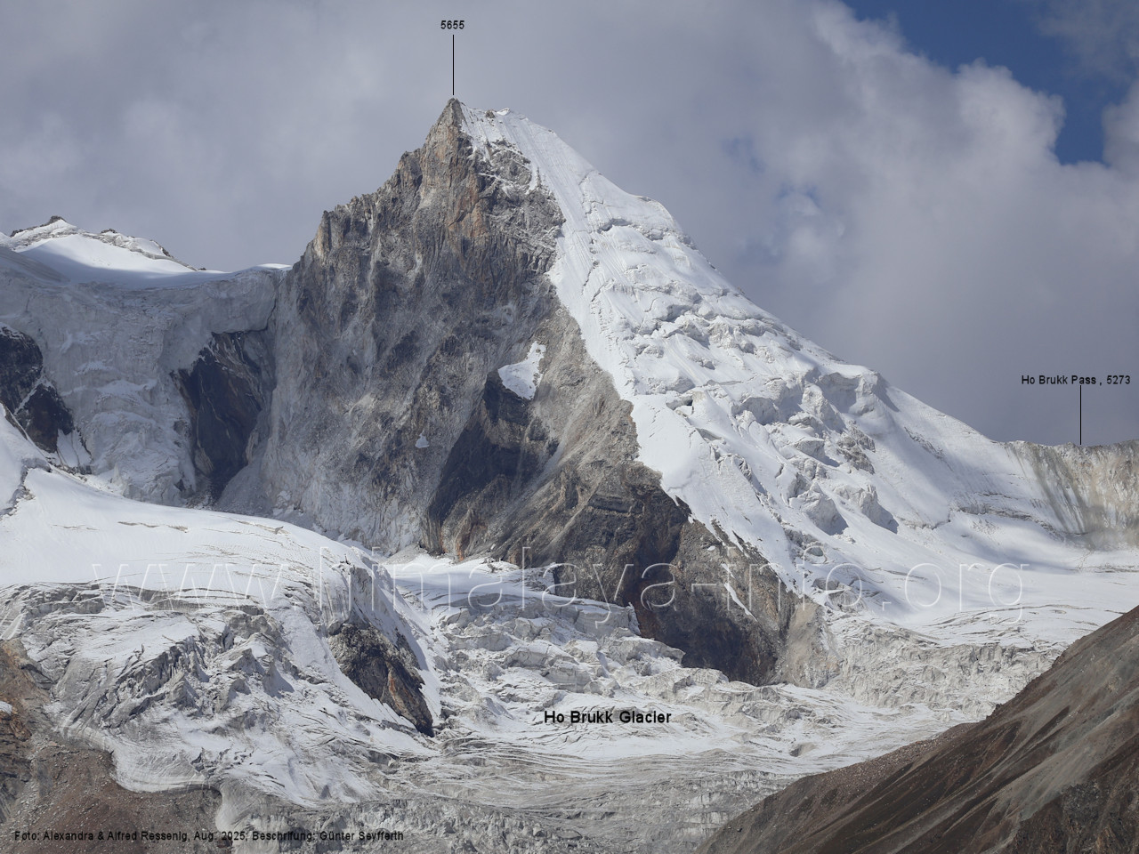 gegenüberstehenden Bergkette. Foto: Alexandra & Alfred Ressenig, Aug. 2025; Beschriftung: Günter Seyfferth (55) Blick vom Camp 4030 am Nordostrand des Biafo-Gletschers nach Südwesten zum Tongo (5904 m) Der Peak 5485 steht am Südrand des Ho Brukk-Gletschers. Foto: Alexandra & Alfred Ressenig, Aug. 2025; Beschriftung: Günter Seyfferth (56) Tele-Blick vom Hang am Nordostrand des Biafo-Gletschers nach Südwesten zum Peak 5655 und Ho Brukk-Pass (5273 m) Foto: Alexandra & Alfred Ressenig, Aug. 2025; Beschriftung: Günter Seyfferth (57) Tele-Blick vom Hang am Nordostrand des Biafo Gletschers nach Westen Diese Gipfel stehen über dem namenlosen Gletscher nördlich des Ho Brukk (5335 m). Foto: Alexandra & Alfred Ressenig, Aug. 2025; Beschriftung: Günter Seyfferth (58) Blick vom Camp 4030 am Nordostrand des Biafo-Gletschers nach Nordwesten zum Sosbun Brakk (6395 m)