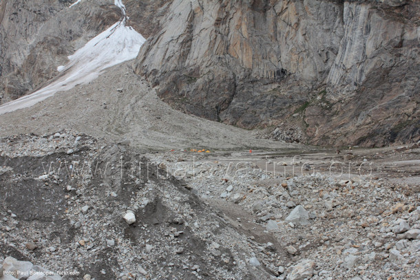 Bildmitte sieht man den Hang über Camp 4030. Foto: Johan Assarsson, flick.com; Juli 2016; Beschriftung: Günter Seyfferth Ein nochmaliger leichter Kamera-Schwenk nach links erfasst auch den Baintha Brakk (7270 m, auch Ogre genannt):