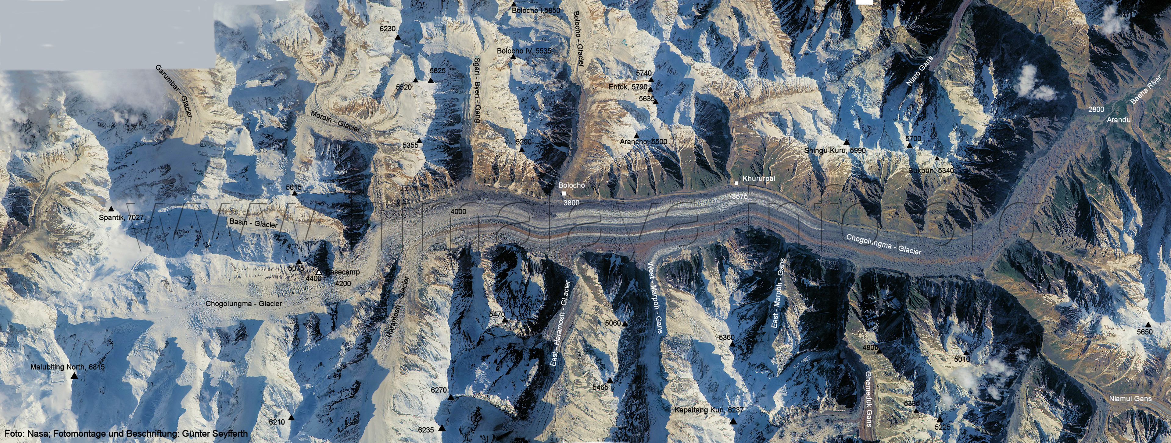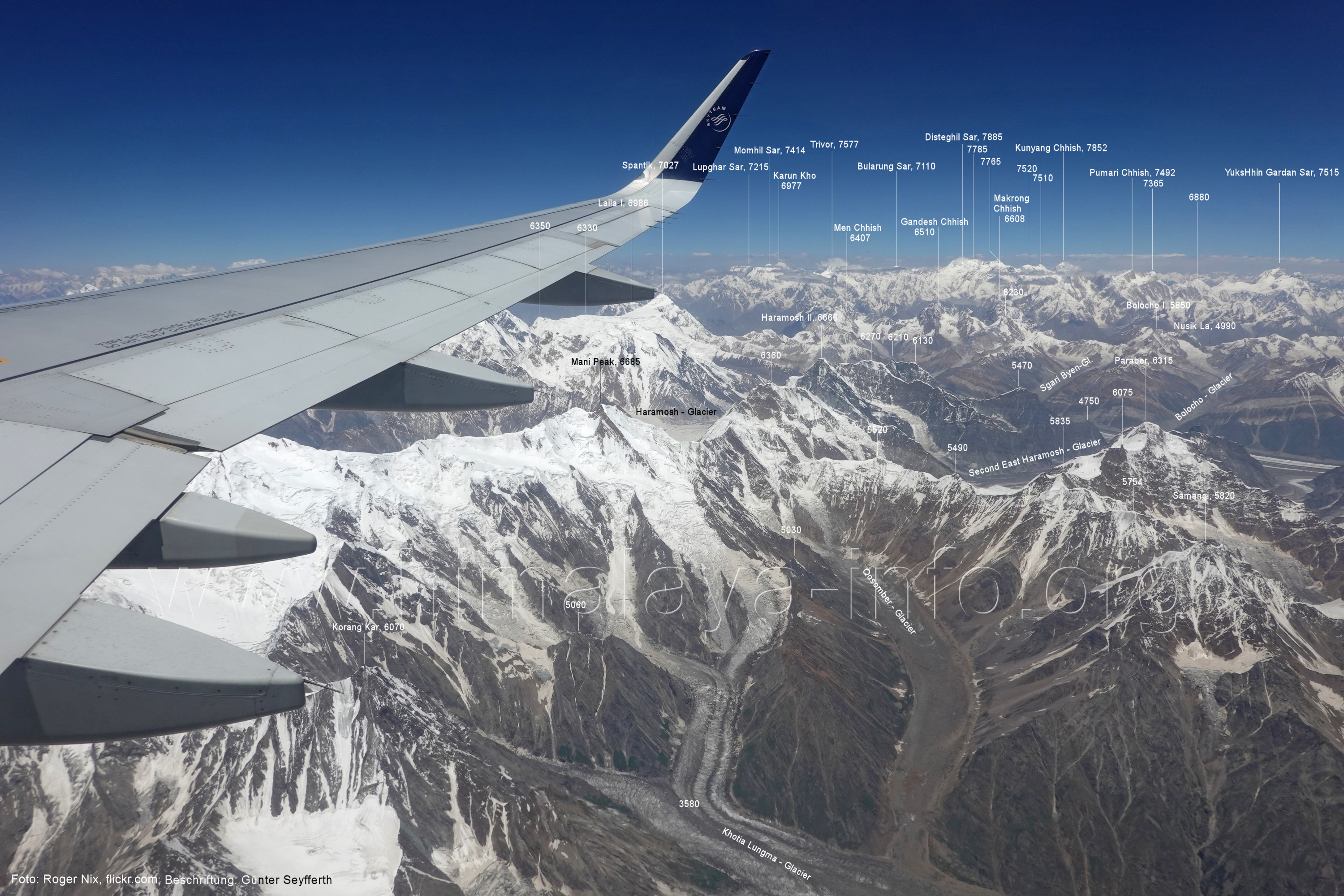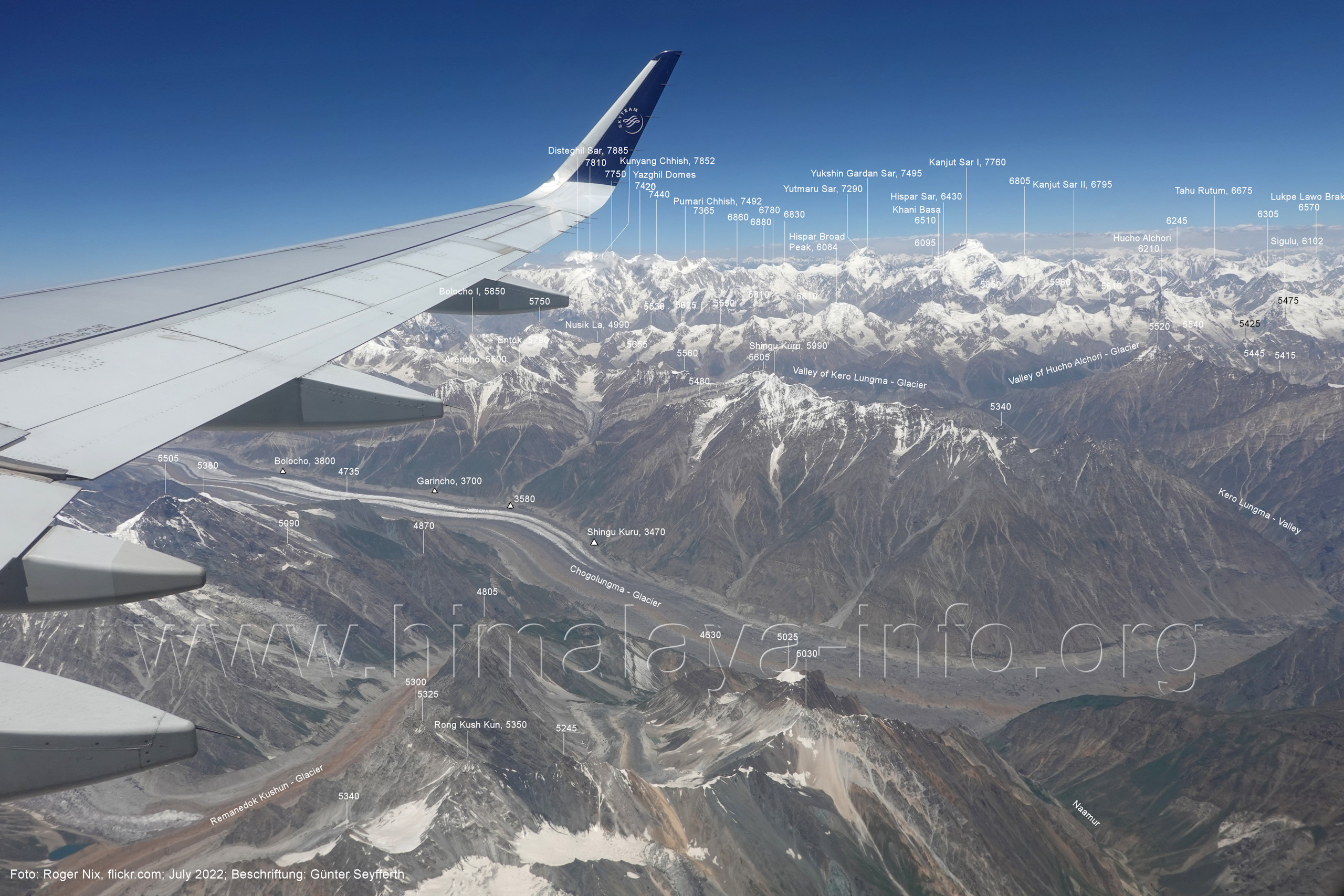 Kero Lungma (Bild Nr. 12); das am Nushik La (Bildmitte) beginnt. Foto: Roger Nix, flickr.com; Beschriftung: Günter Seyfferth (6) Luftbild von Süden zum mittleren Abschnitt des Chogolungma-Gletschers und zum Hispar Muztagh