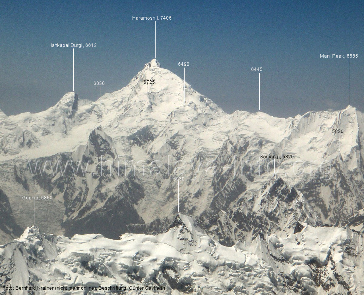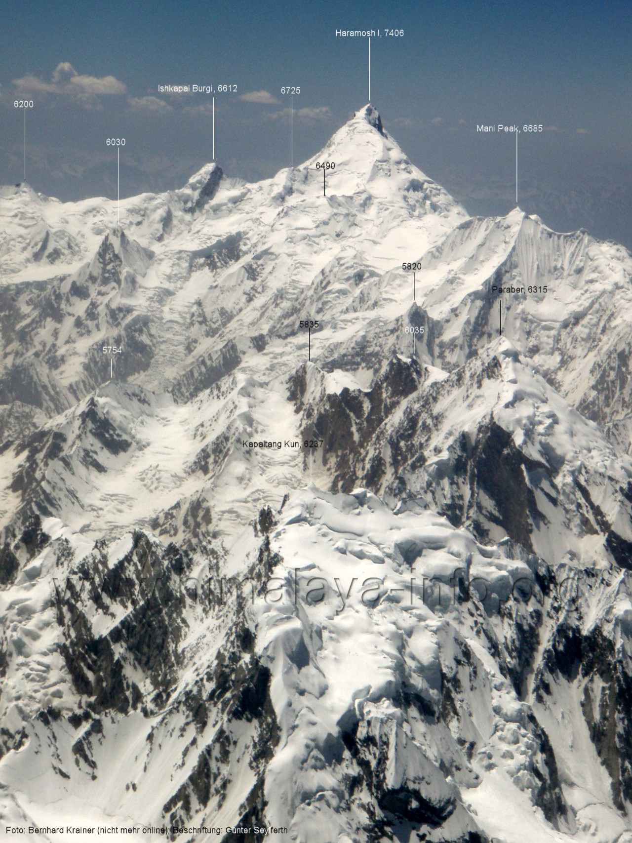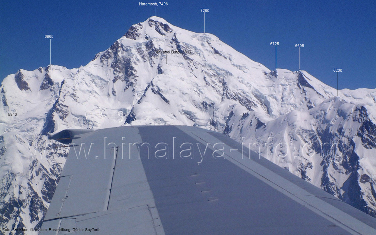 macht die Gipfelbestimmung Foto: Andreas Hammer, Juli 2017; Beschriftung: Günter Seyfferth Das folgende Bild zeigt die Gipfel in der linken Bildhälfte aus einer Position, die etwas weiter östlich ist. (267) Luftbild des Haramosh I (7406 m) von Südosten