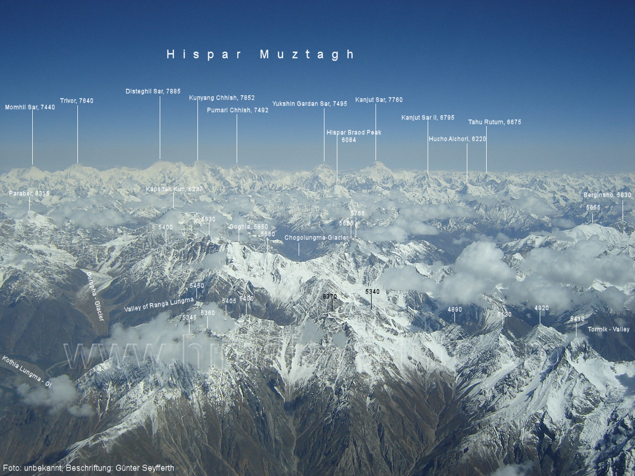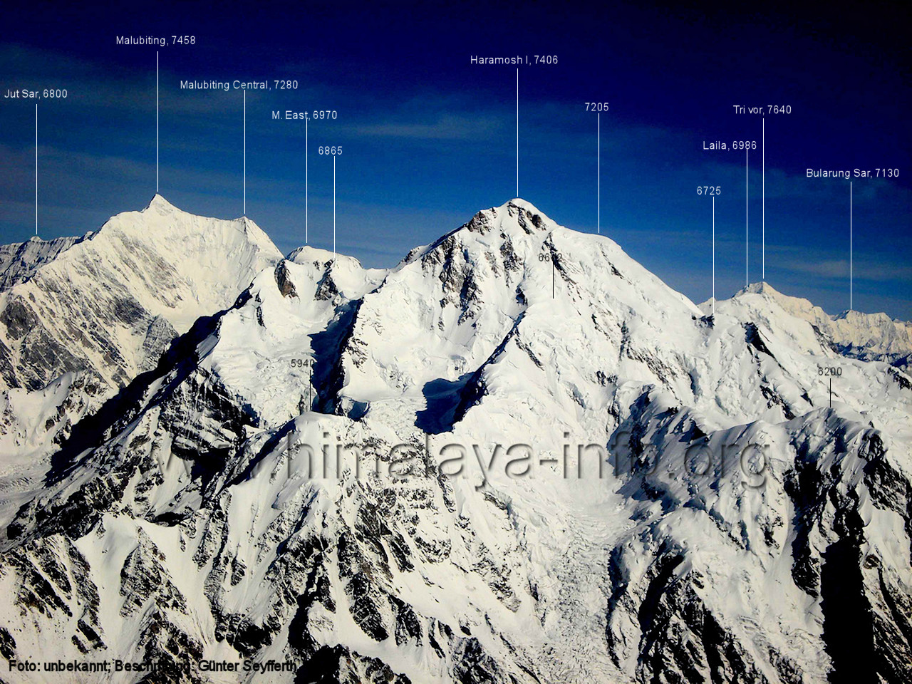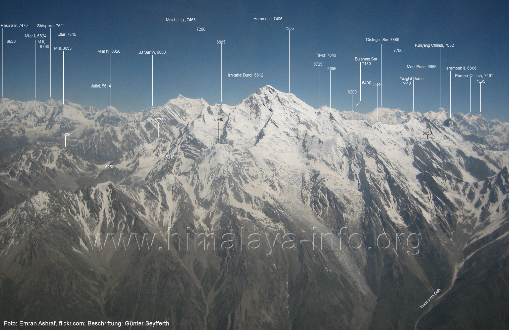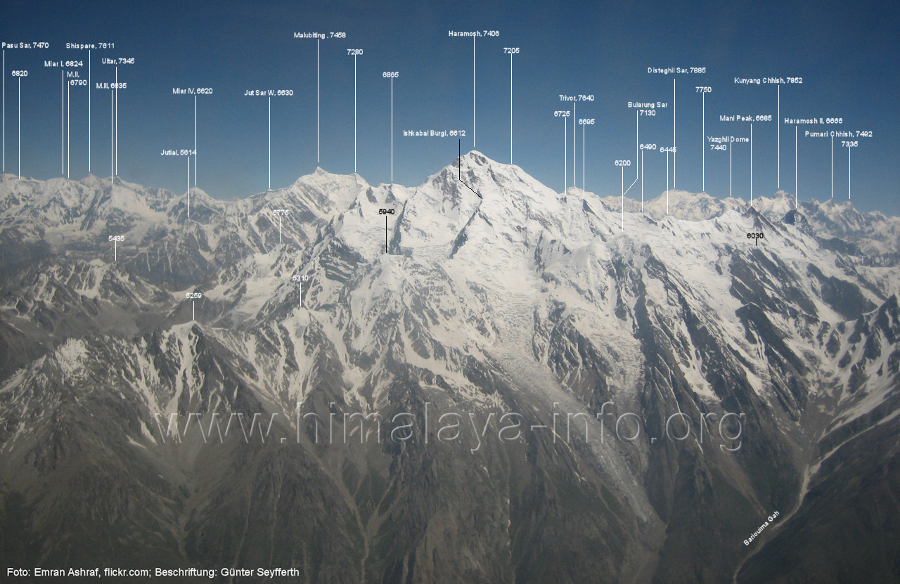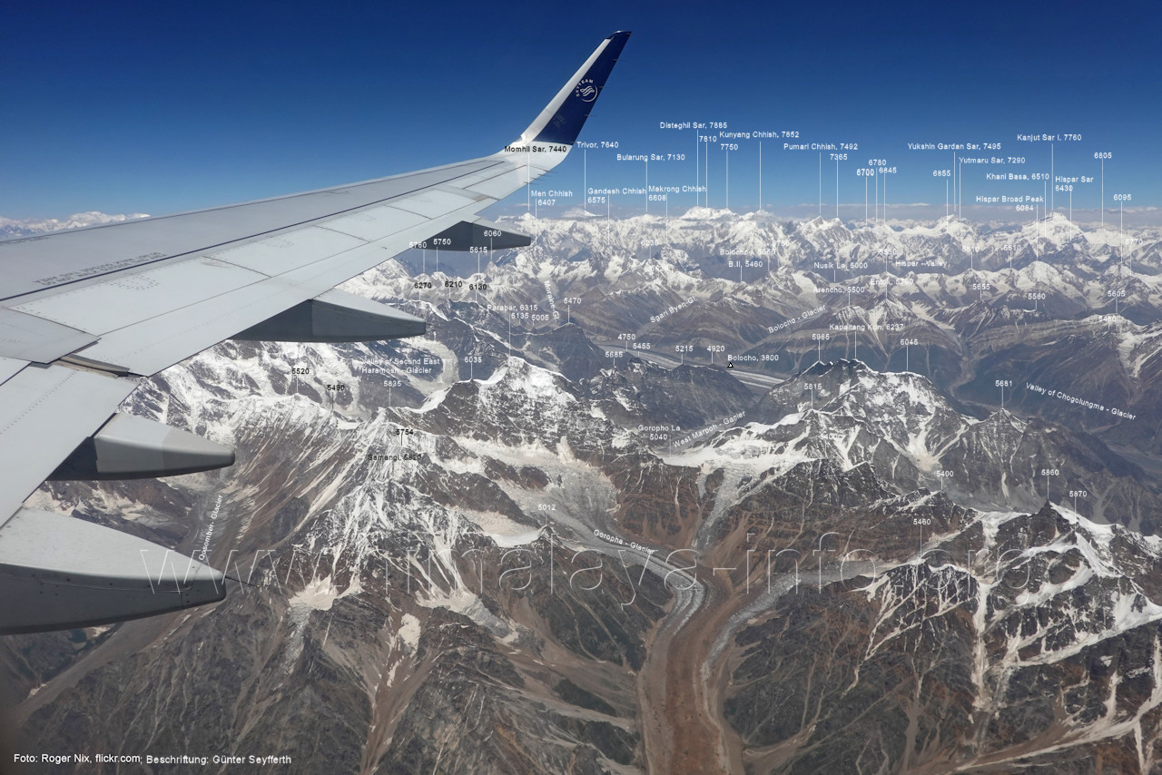 Batura Muztagh. Foto: Emran Ashraf, flickr.com; Beschriftung: Günter Seyfferth Auf derselben Sichtlinie sind die zwei folgenden Luftbilder entstanden: