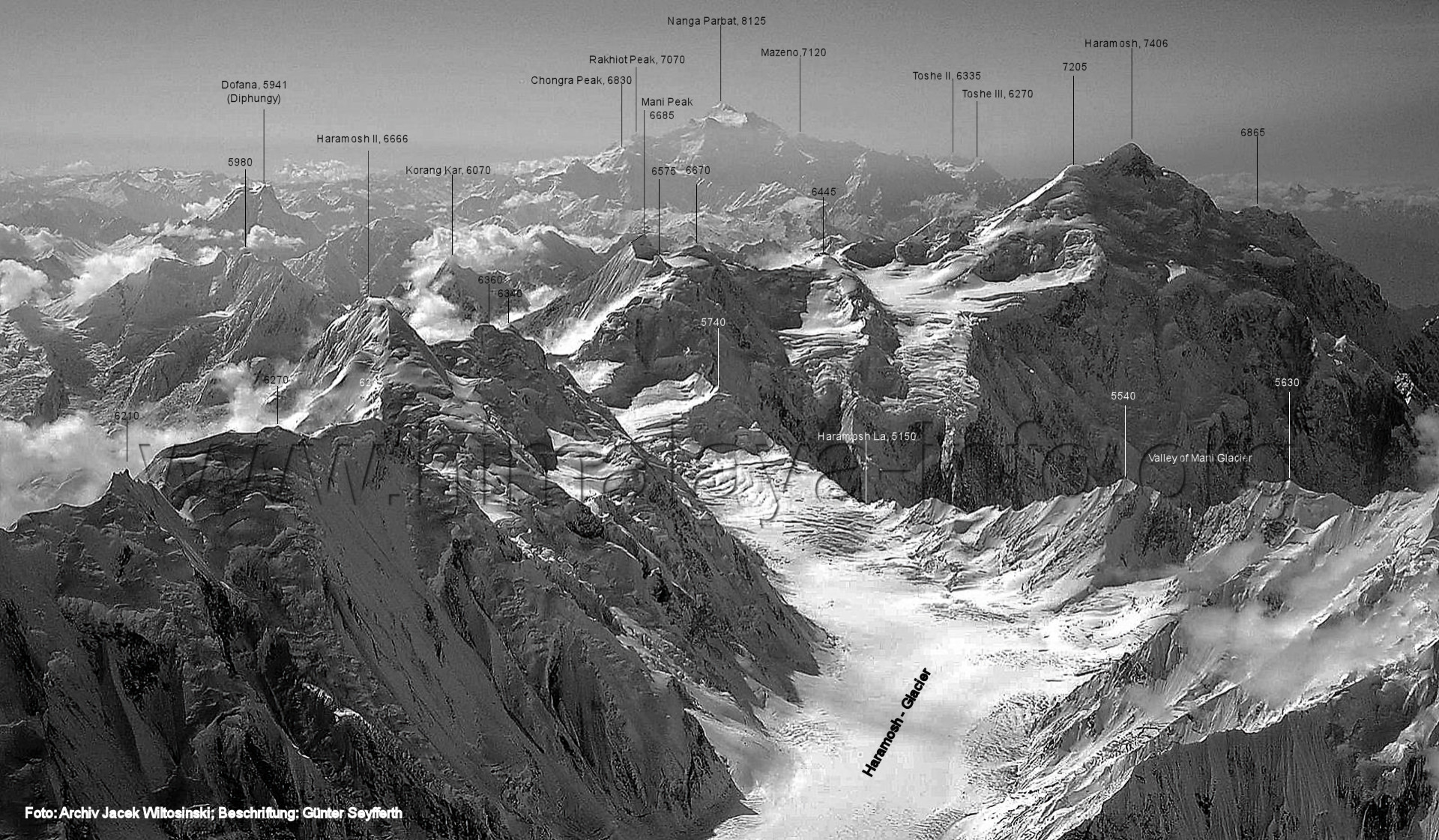 (264) Luftbild des Malubiting (7458 m) und Haramosh I (7406 m) von Süden Foto: unbekannt; Beschriftung: Günter Seyfferth (265) Luftbild des Haramosh I (7406 m) von Süden Foto: Arif Khan, flickr.com; Beschriftung: Günter Seyfferth (266) Luftbild der Haramosh-Mountains von Ost-Südosten