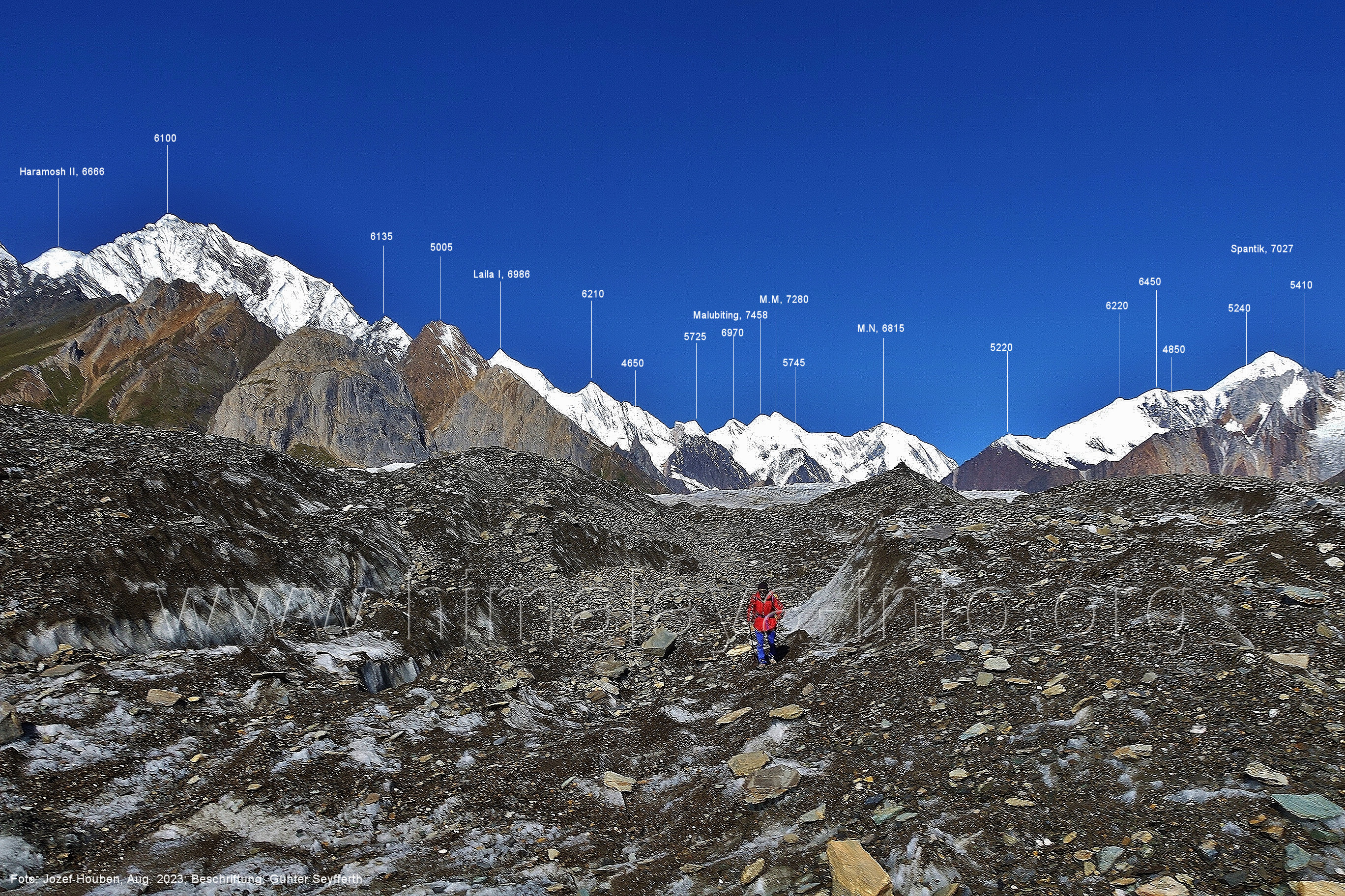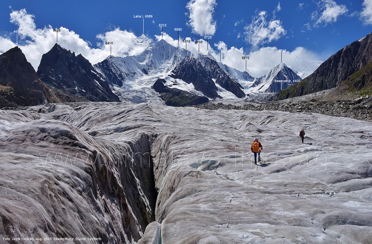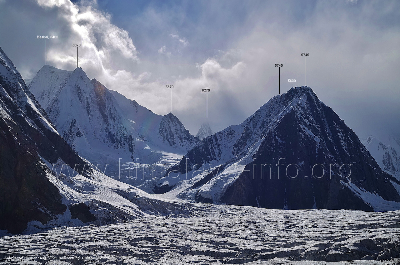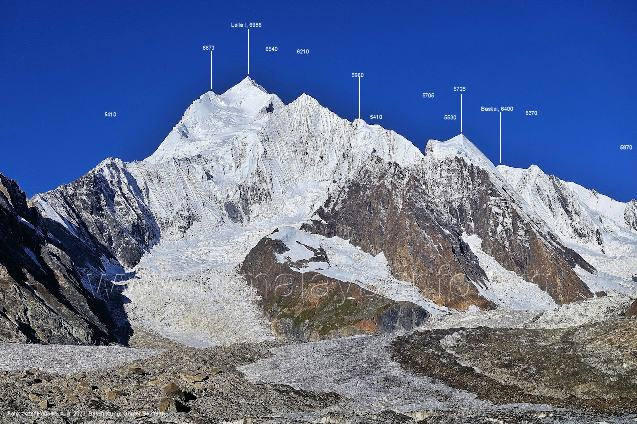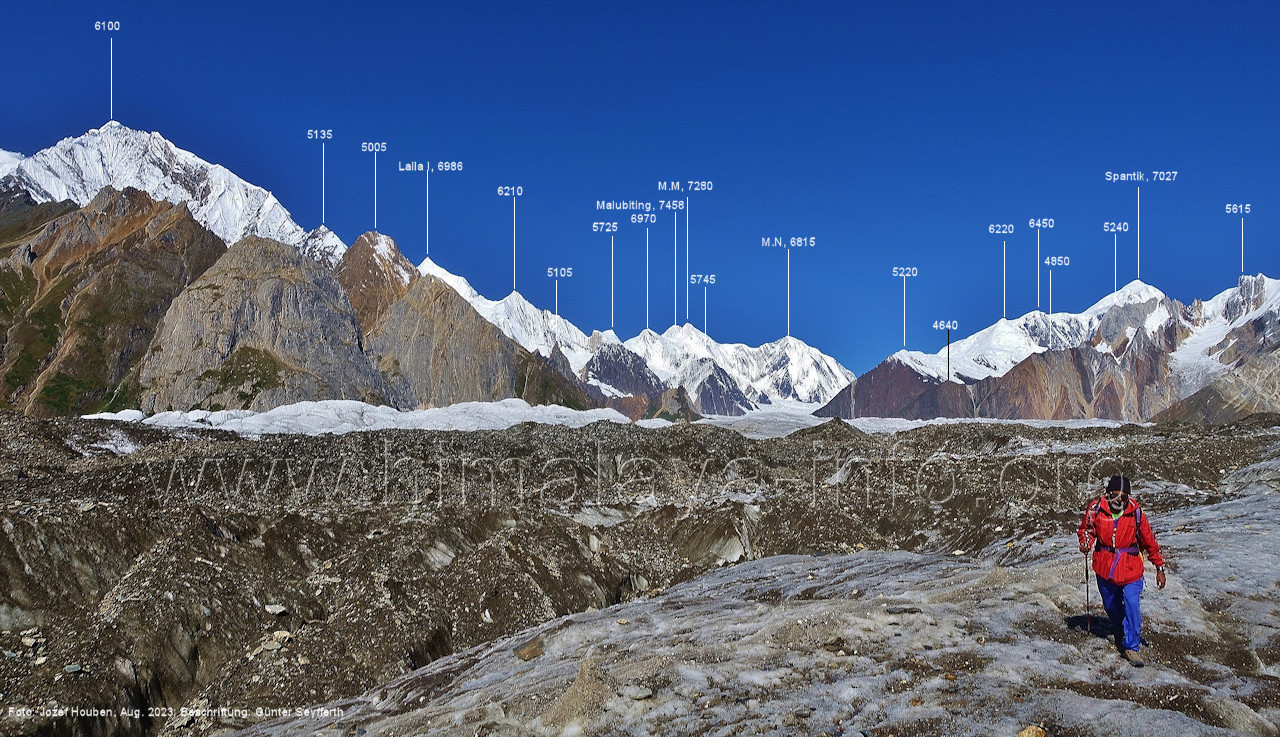 m), Bolocho VII (5290 m), Arencho (5500 m), Der Shel Chapka steht östlich des Basha River und gehört zur Region um den Sosbun-Gletscher. Foto: Jozef Houben, Aug. 2023; Beschriftung: Günter Seyfferth (79) Blick bei 75°03'30" in ca. 4025 m Höhe nach Südwesten mit Laila I (6986 m) und Malubiting (7458 m)