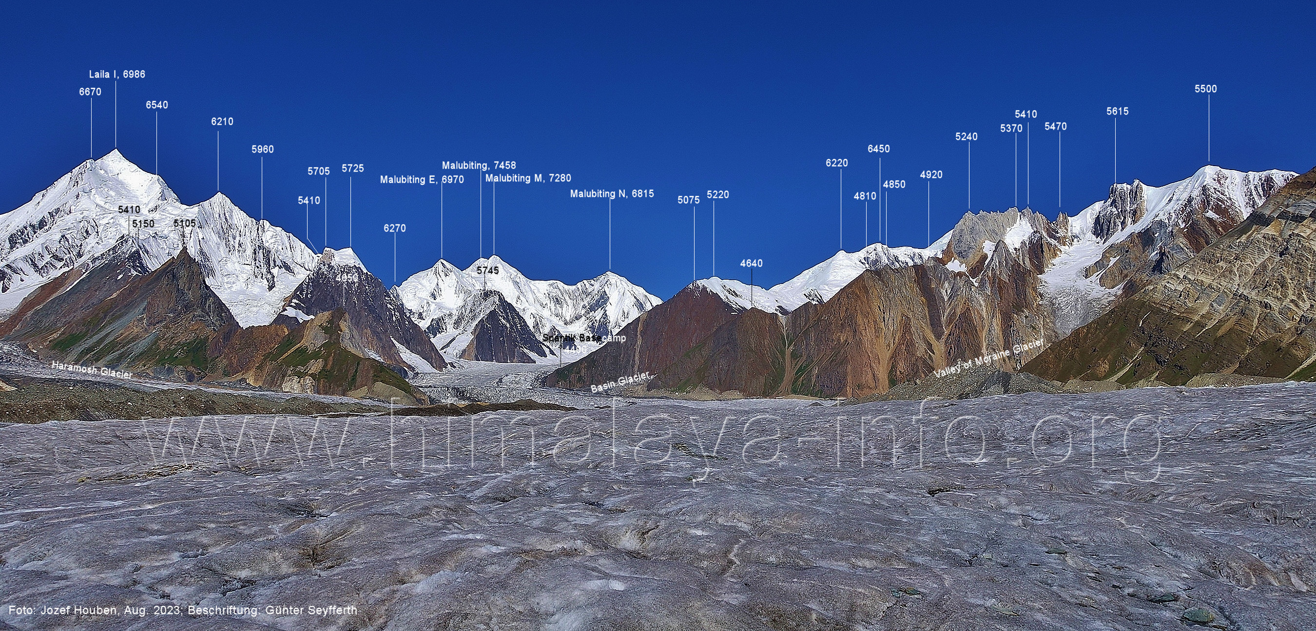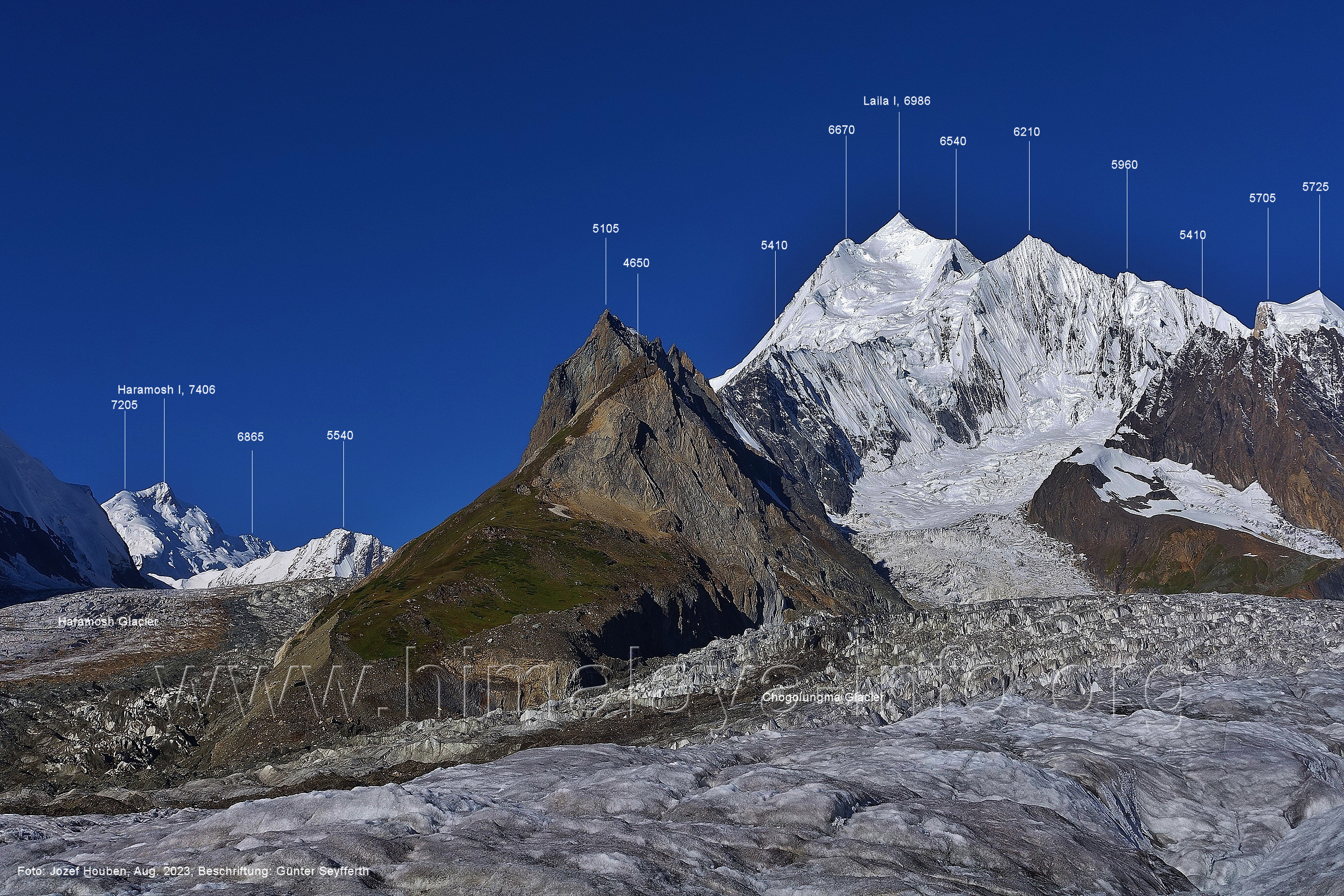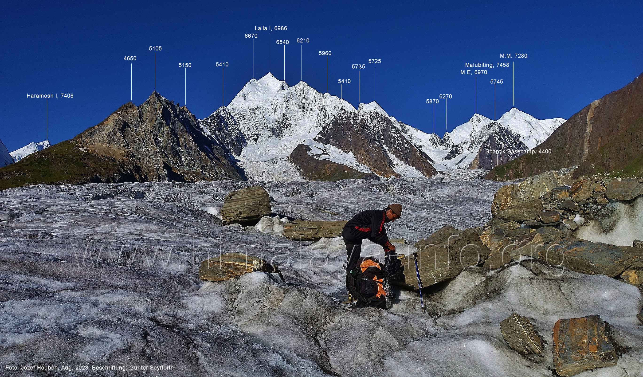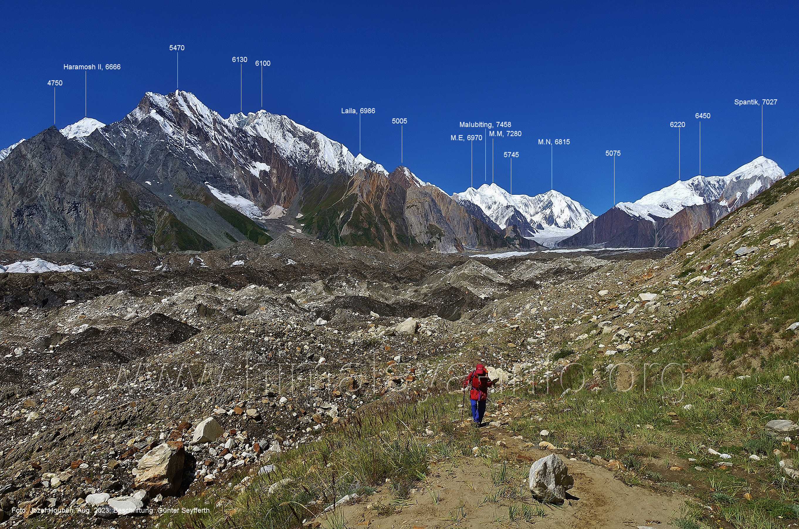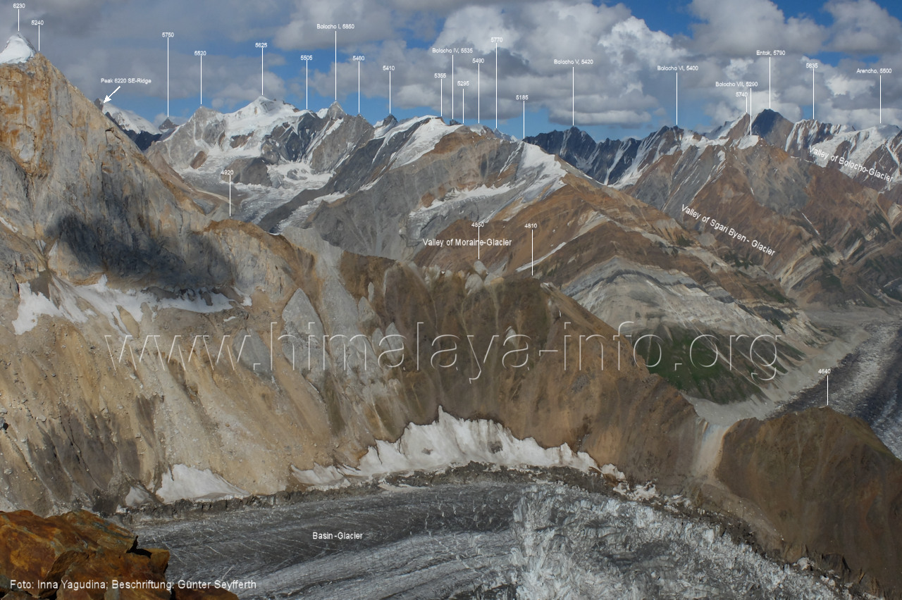 m), Bolocho VII (5290 m), Arencho (5500 m), Der Shel Chapka steht östlich des Basha River und gehört zur Region um den Sosbun-Gletscher. Foto: Jozef Houben, Aug. 2023; Beschriftung: Günter Seyfferth (79) Blick bei 75°03'30" in ca. 4025 m Höhe nach Südwesten mit Laila I (6986 m) und Malubiting (7458 m)