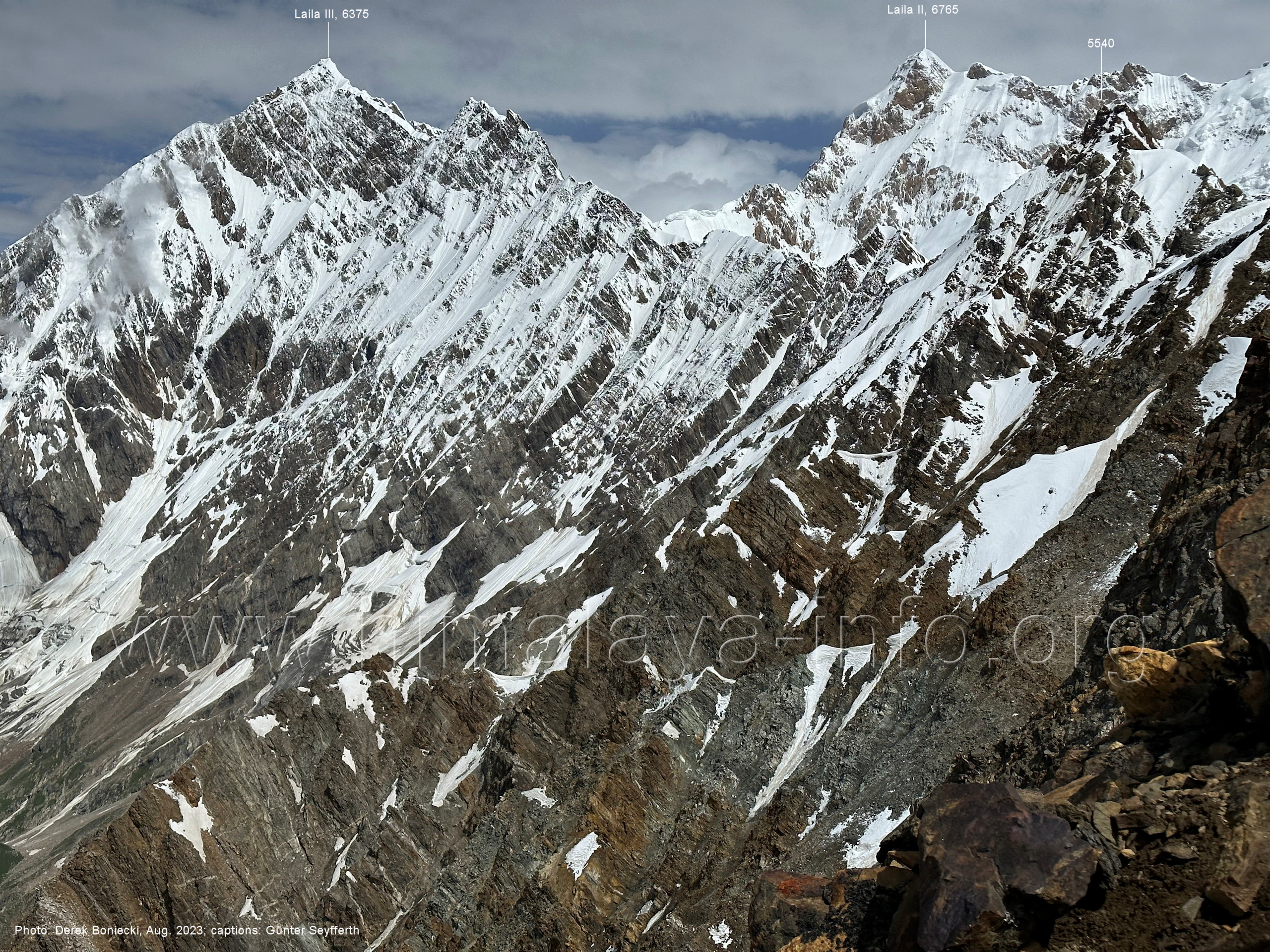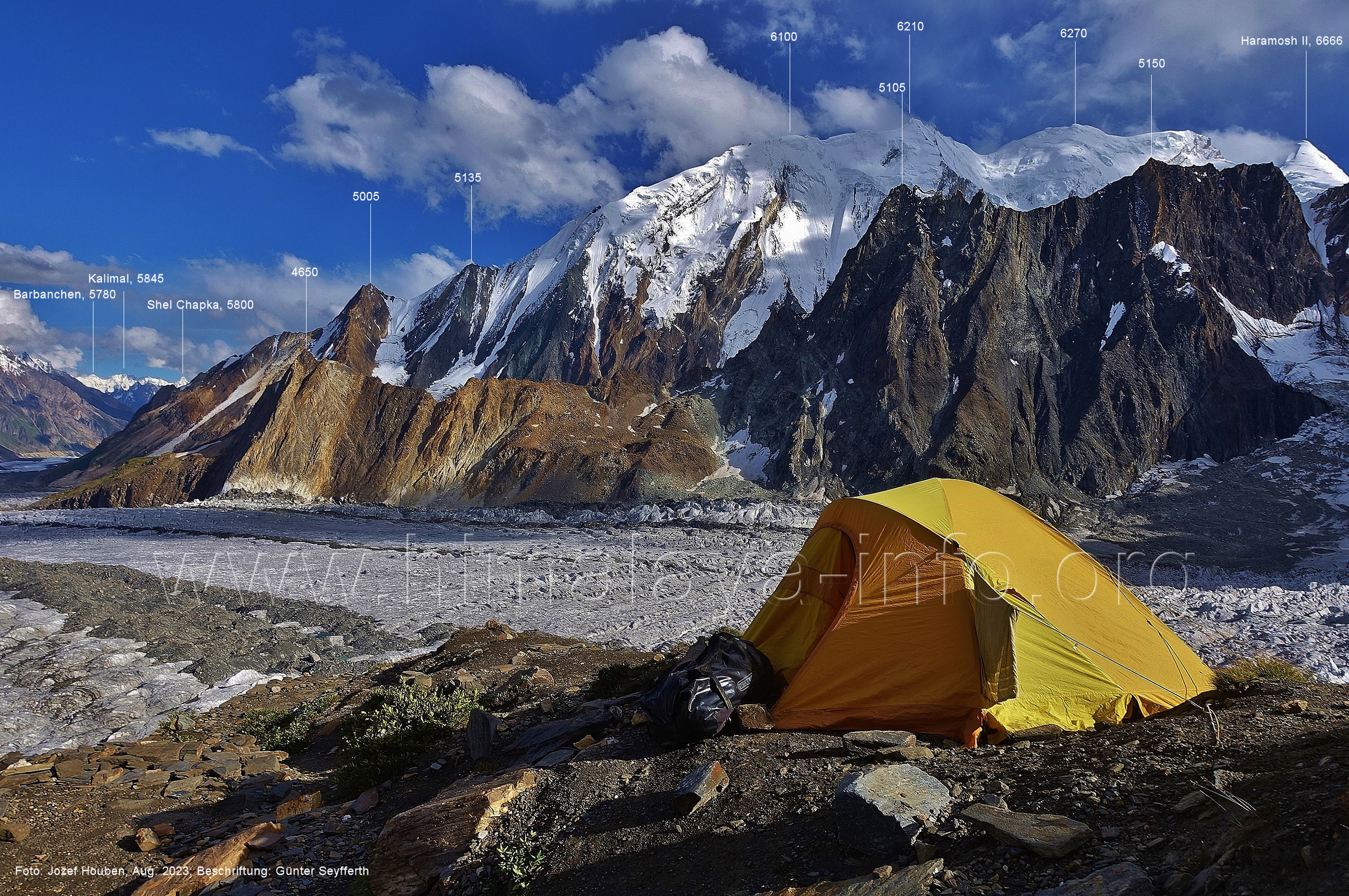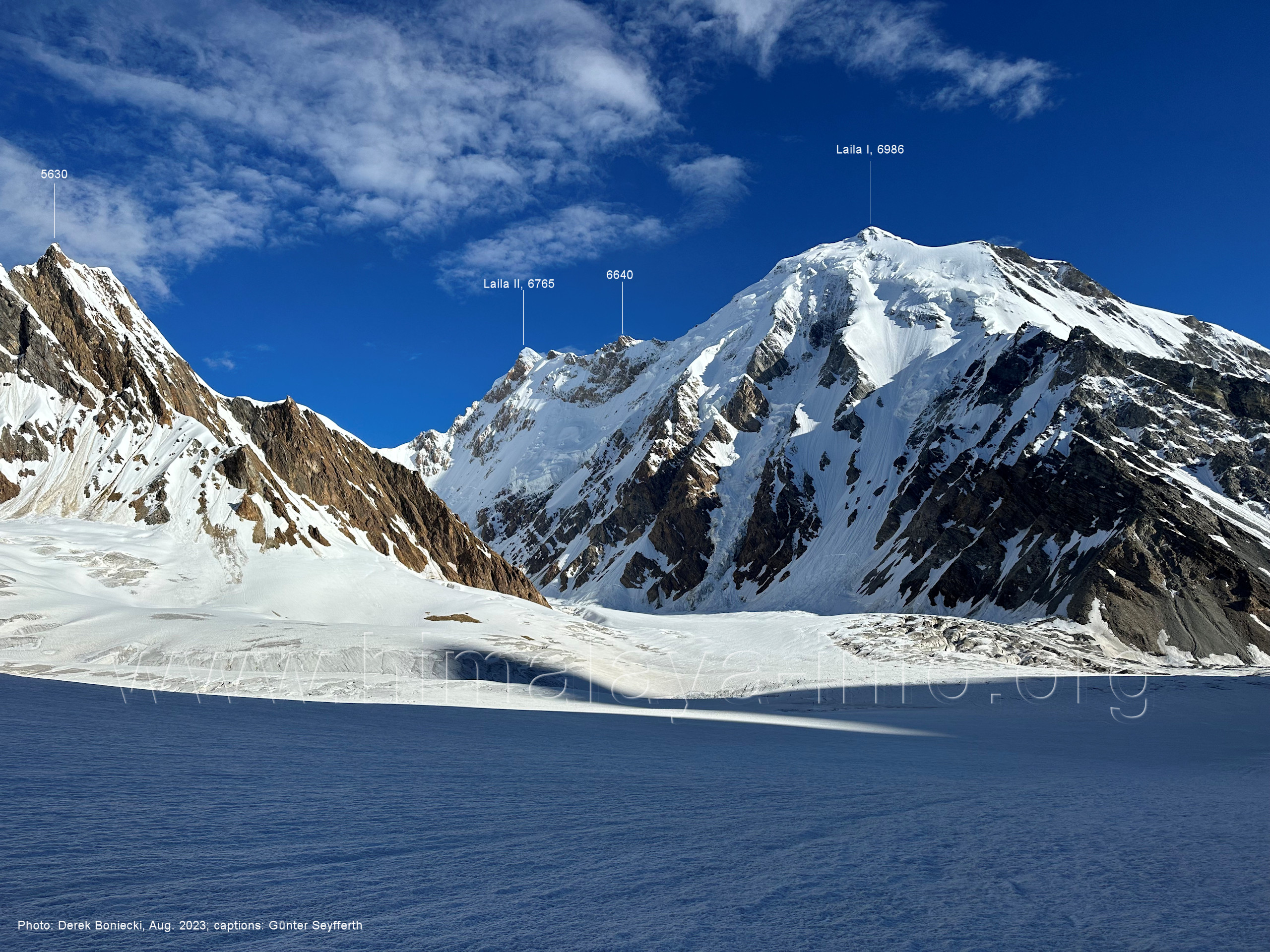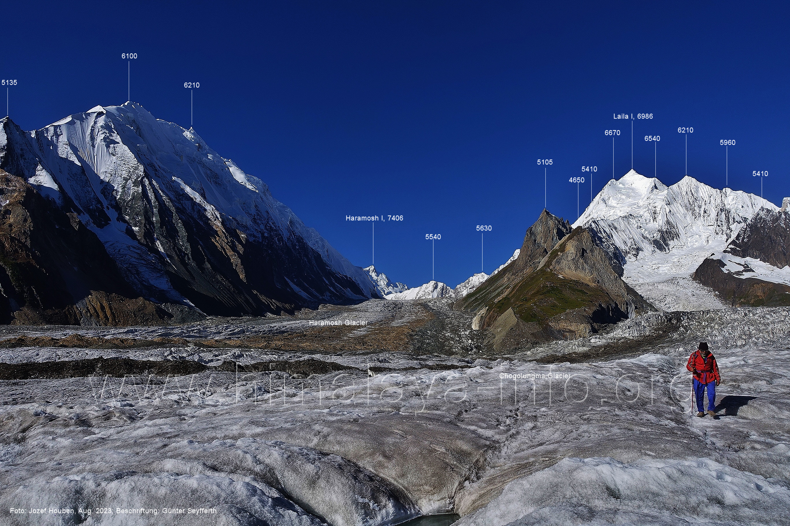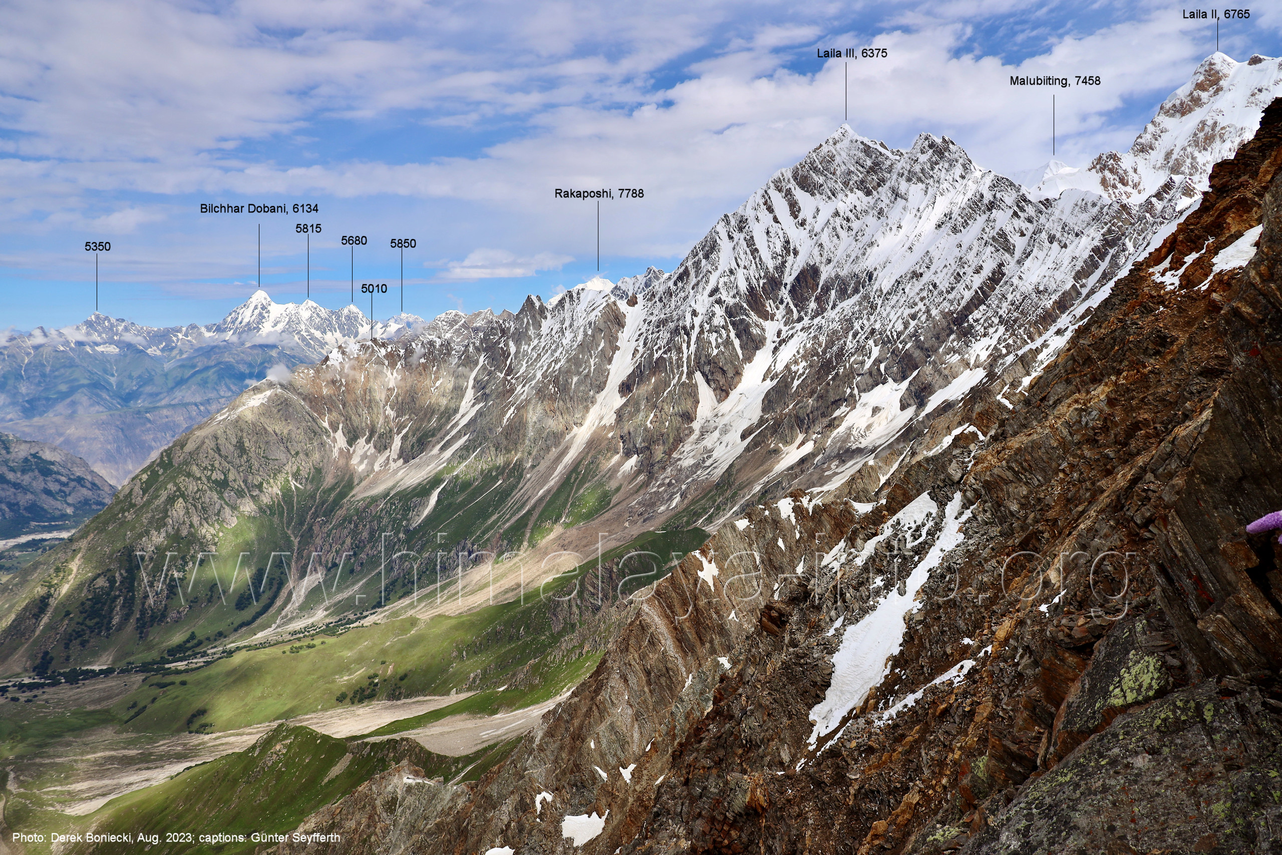 m), Bolocho VII (5290 m), Arencho (5500 m), Der Shel Chapka steht östlich des Basha River und gehört zur Region um den Sosbun-Gletscher. Foto: Jozef Houben, Aug. 2023; Beschriftung: Günter Seyfferth (79) Blick bei 75°03'30" in ca. 4025 m Höhe nach Südwesten mit Laila I (6986 m) und Malubiting (7458 m)