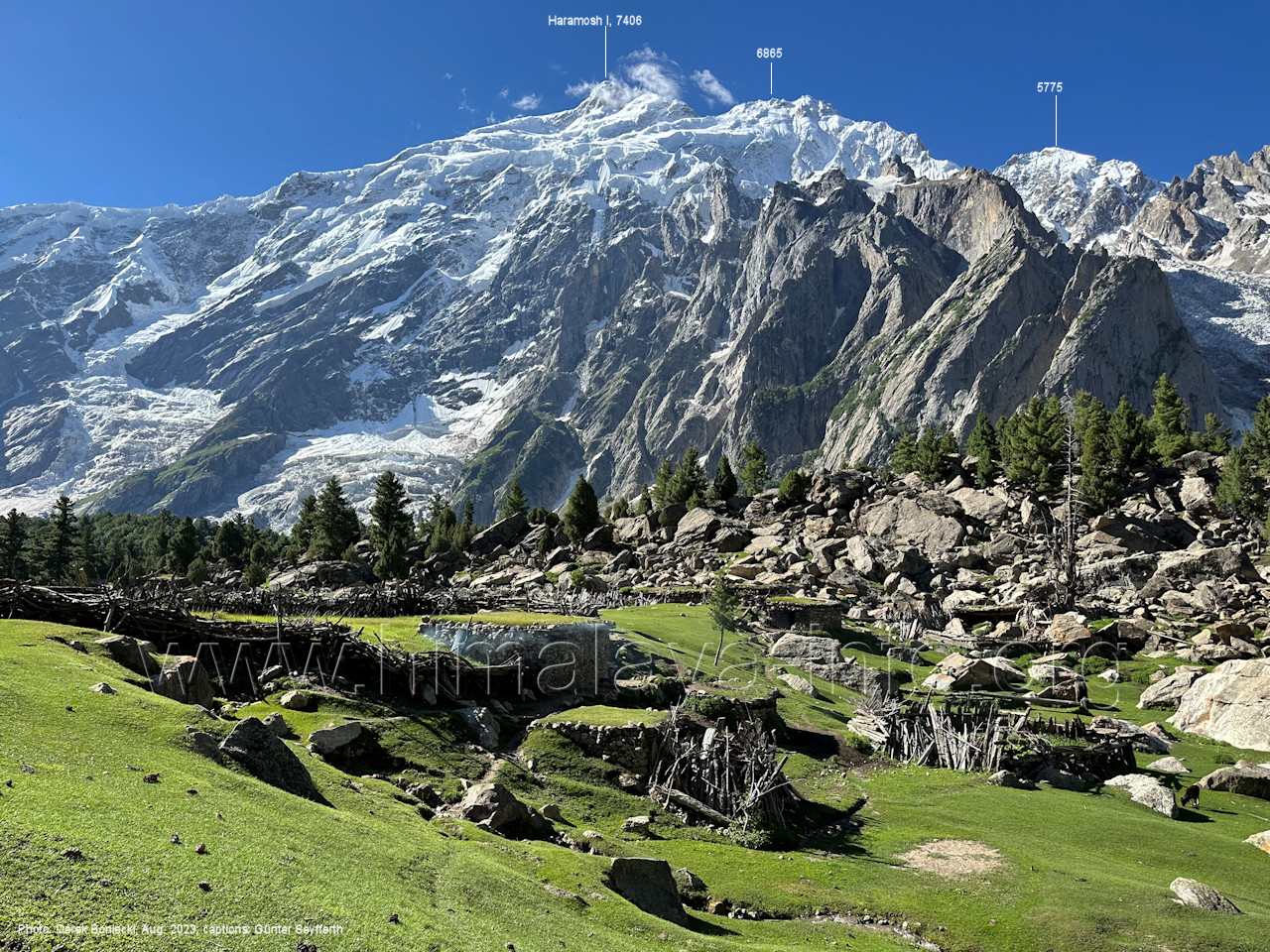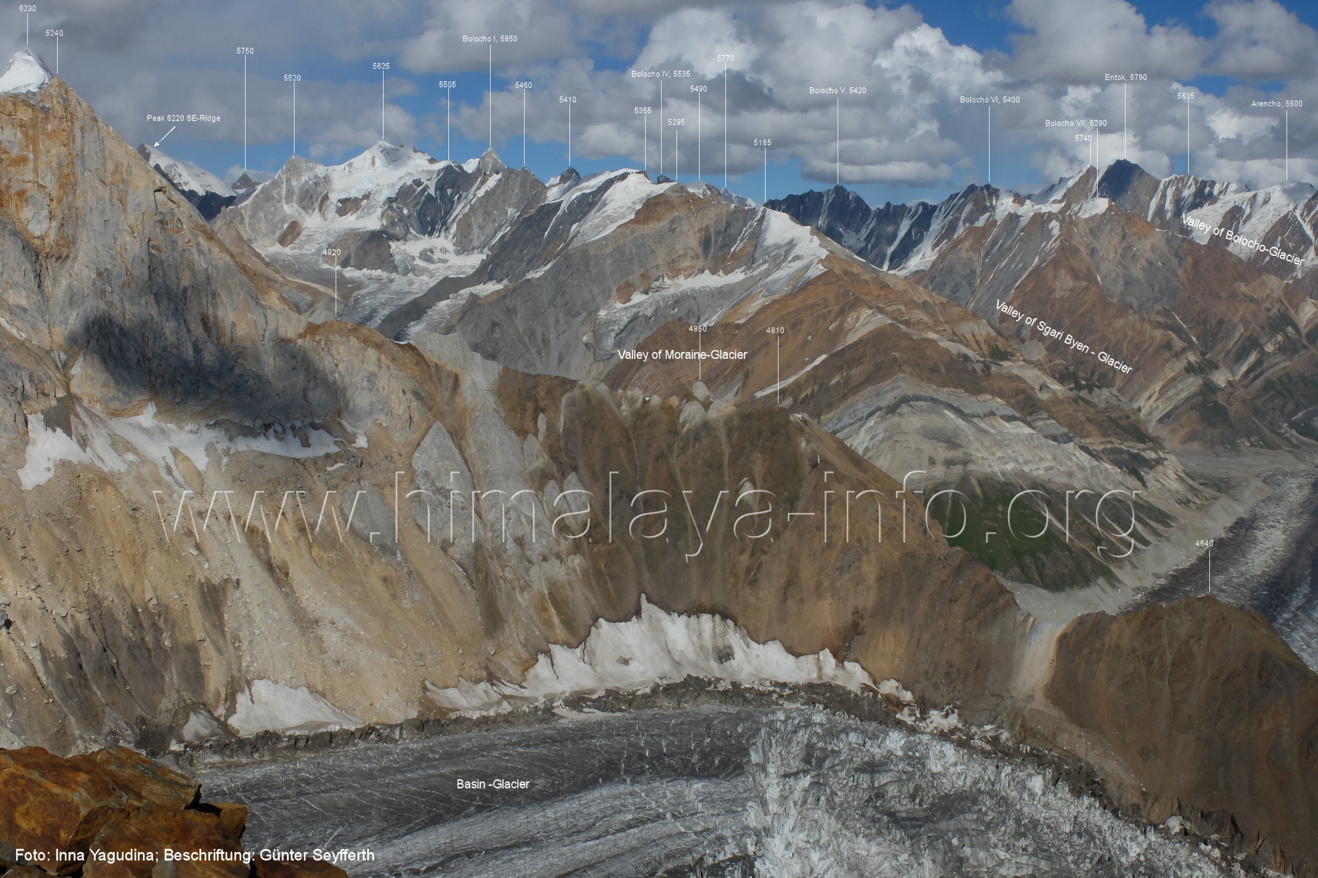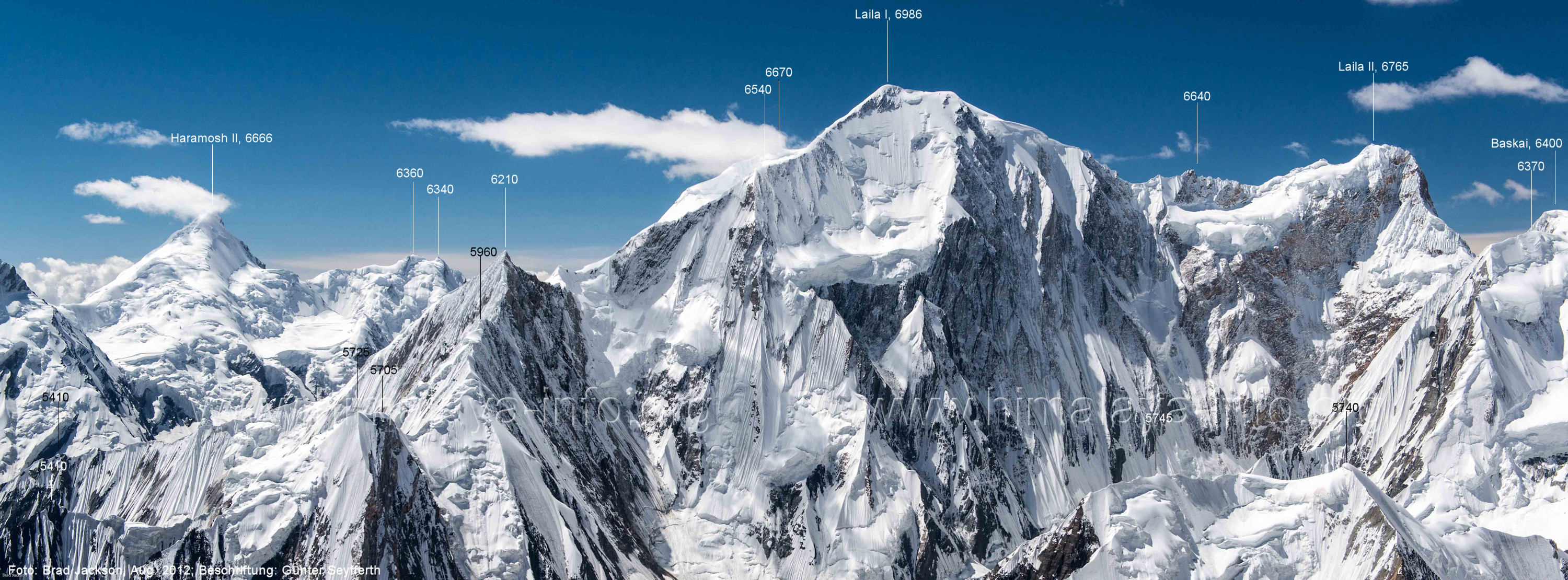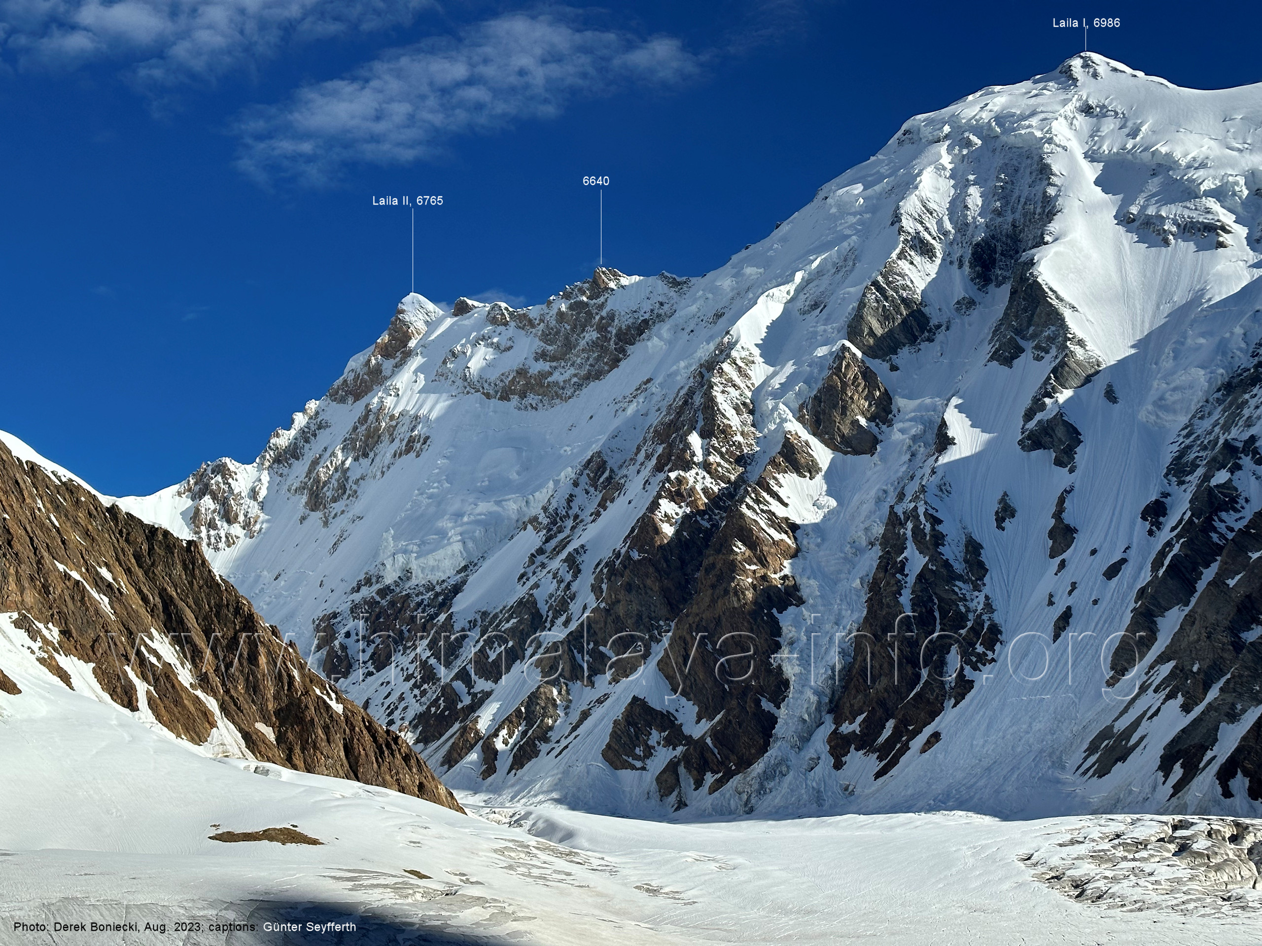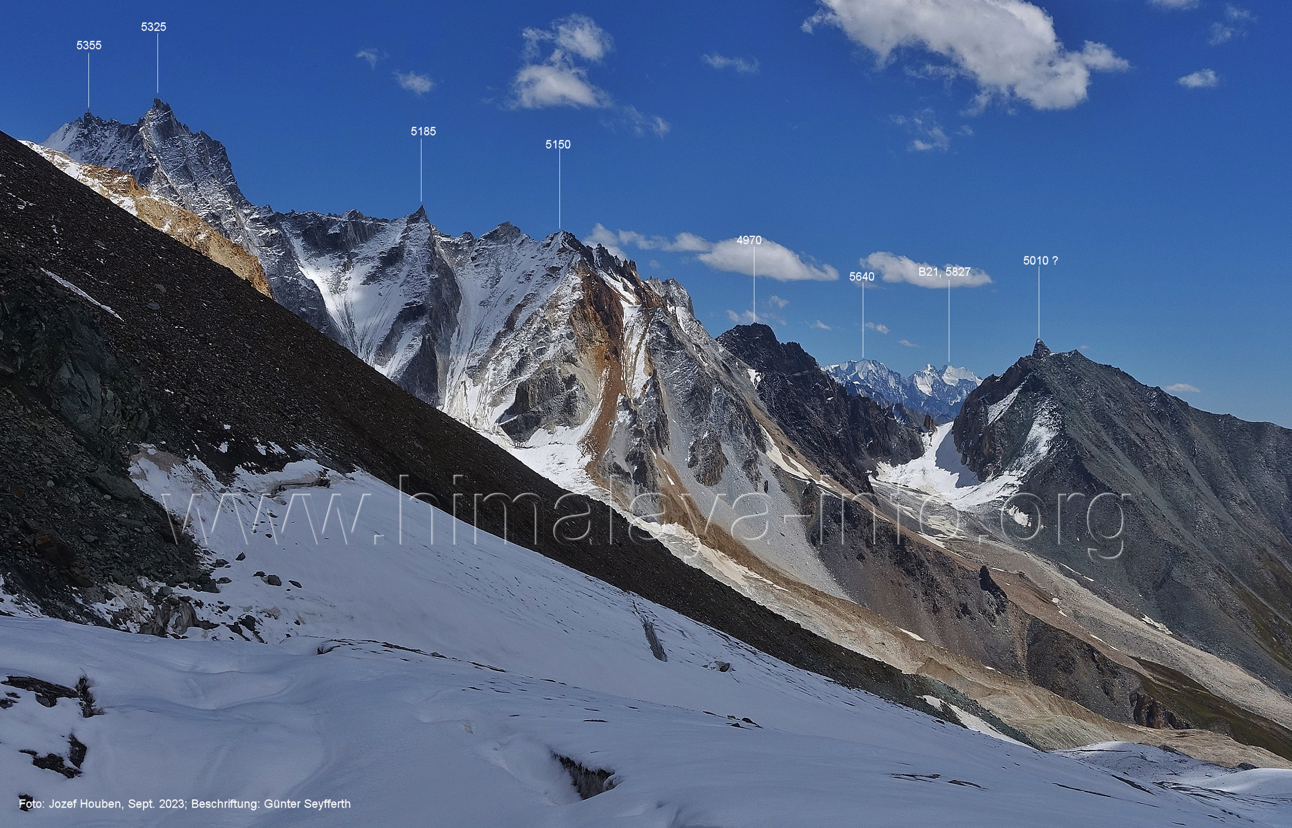 m), Bolocho VII (5290 m), Arencho (5500 m), Der Shel Chapka steht östlich des Basha River und gehört zur Region um den Sosbun-Gletscher. Foto: Jozef Houben, Aug. 2023; Beschriftung: Günter Seyfferth (79) Blick bei 75°03'30" in ca. 4025 m Höhe nach Südwesten mit Laila I (6986 m) und Malubiting (7458 m)