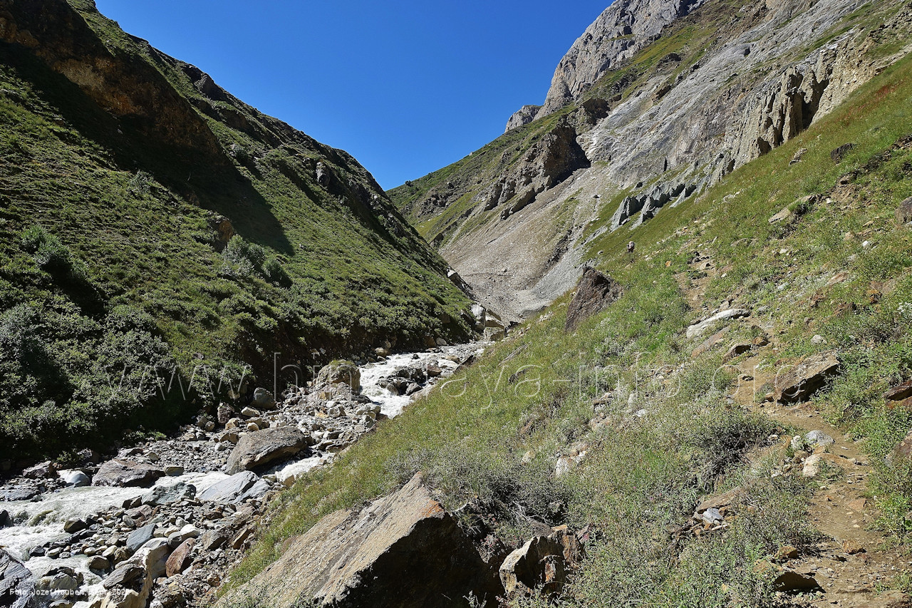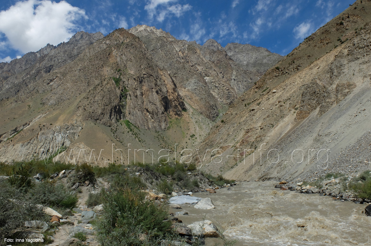 Perspektive nicht zu sehen und auch nicht die vielen anderen Gipfel Foto: Inna Yagudina, Aug. 2018; Beschriftung: Günter Seyfferth Vom Punkt des Richtungswechsels des Haupttals zeigen sich die Seitentäler Sencho und Naamur wie folgt: (16) Blick bei 75°14'30" (H = 3250) nach Südosten zu den Seitentälern des Sencho Nala und des Naamur Nala Foto: Jozef Houben, Aug. 2023; Beschriftung: Günter Seyfferth Nur wenig weiter talufwärts hat ein Bergbach eine