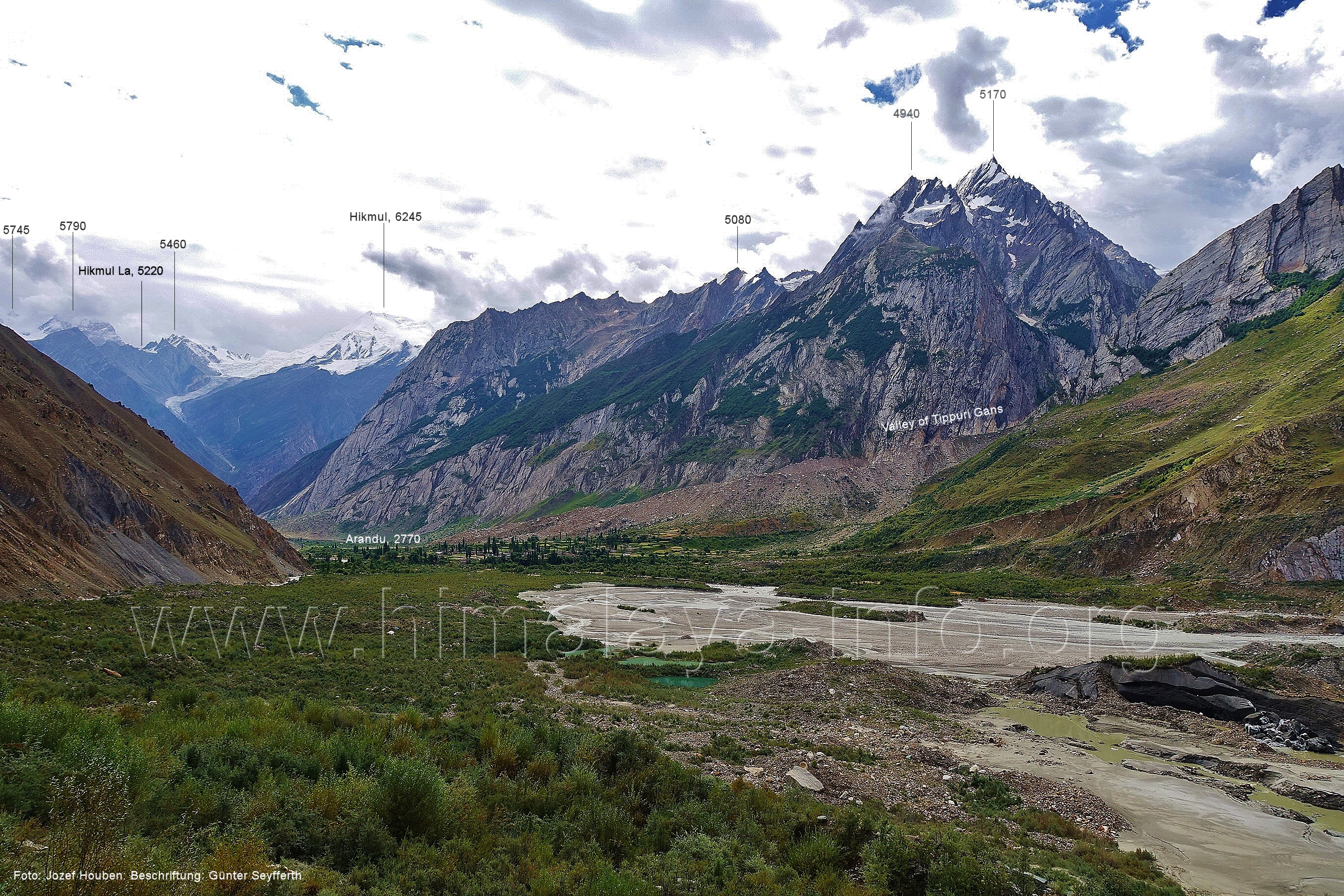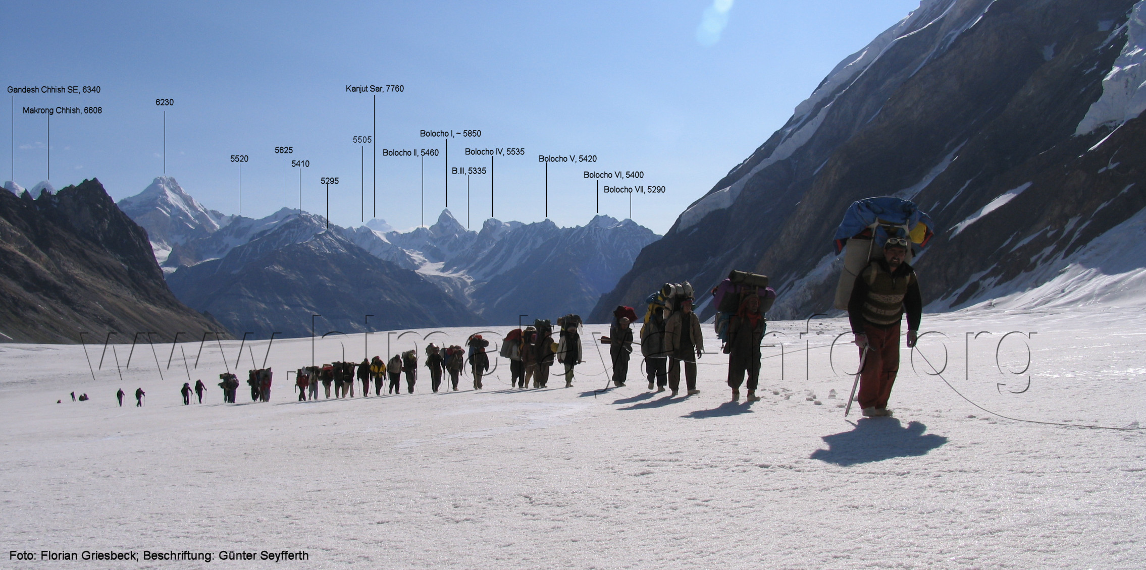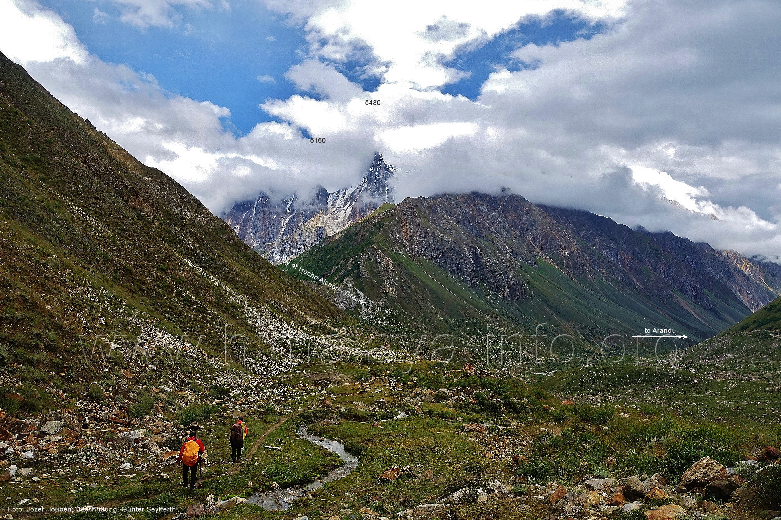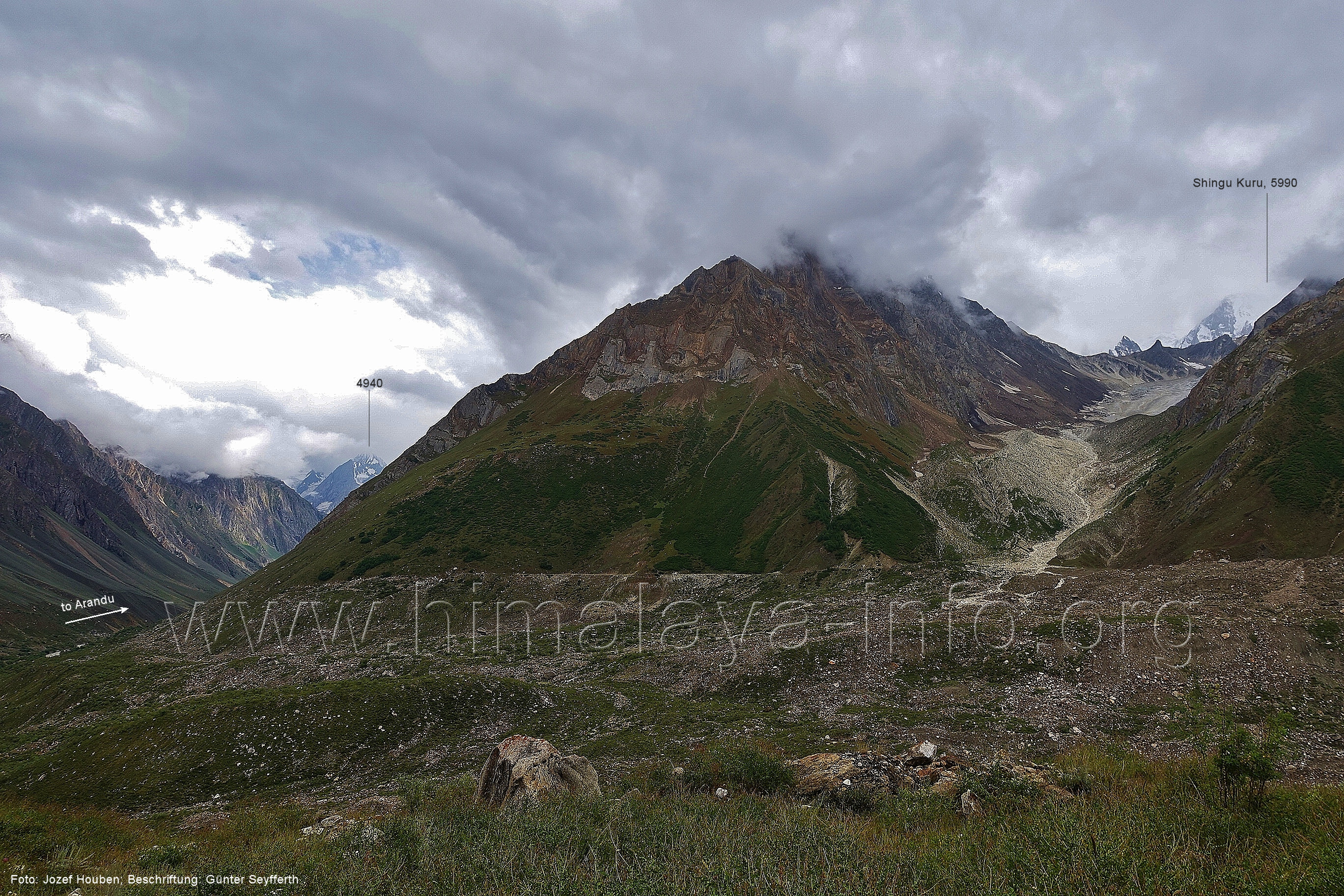 geht in den oberen Bereich des Getschers, Foto: Collin Wells, flickr.com; Beschriftung: Günter Seyfferth Es folgen weitere Fotos von Jozef Houben. Kurz vor der Mündung des Tals des Hucho Alchori-Gletschers stiegen die Wolken auf und machten die folgenden 3 Bilder möglich: (218) Blick aus ca. 3650 m Höhe im Kero Lungma-Tal nach Süden zum Shingu Kuru (5990 m)