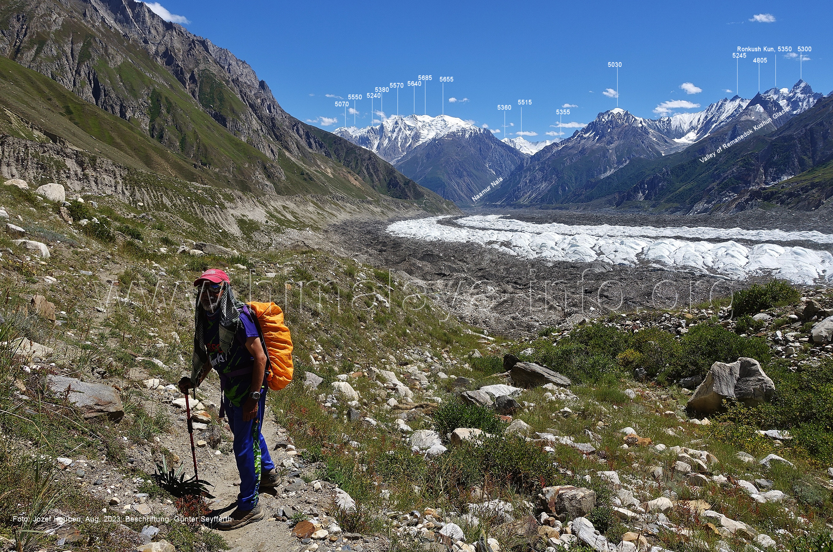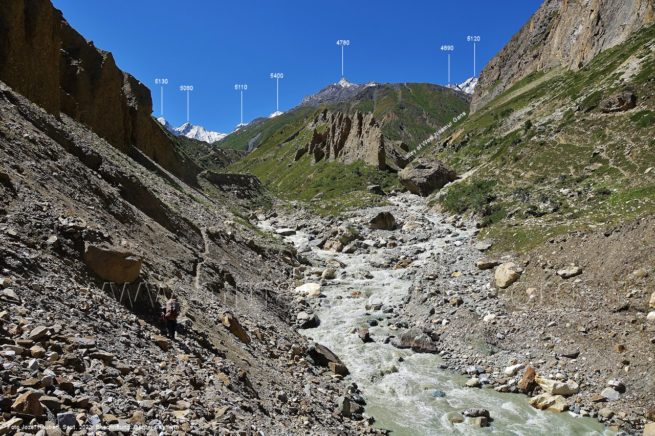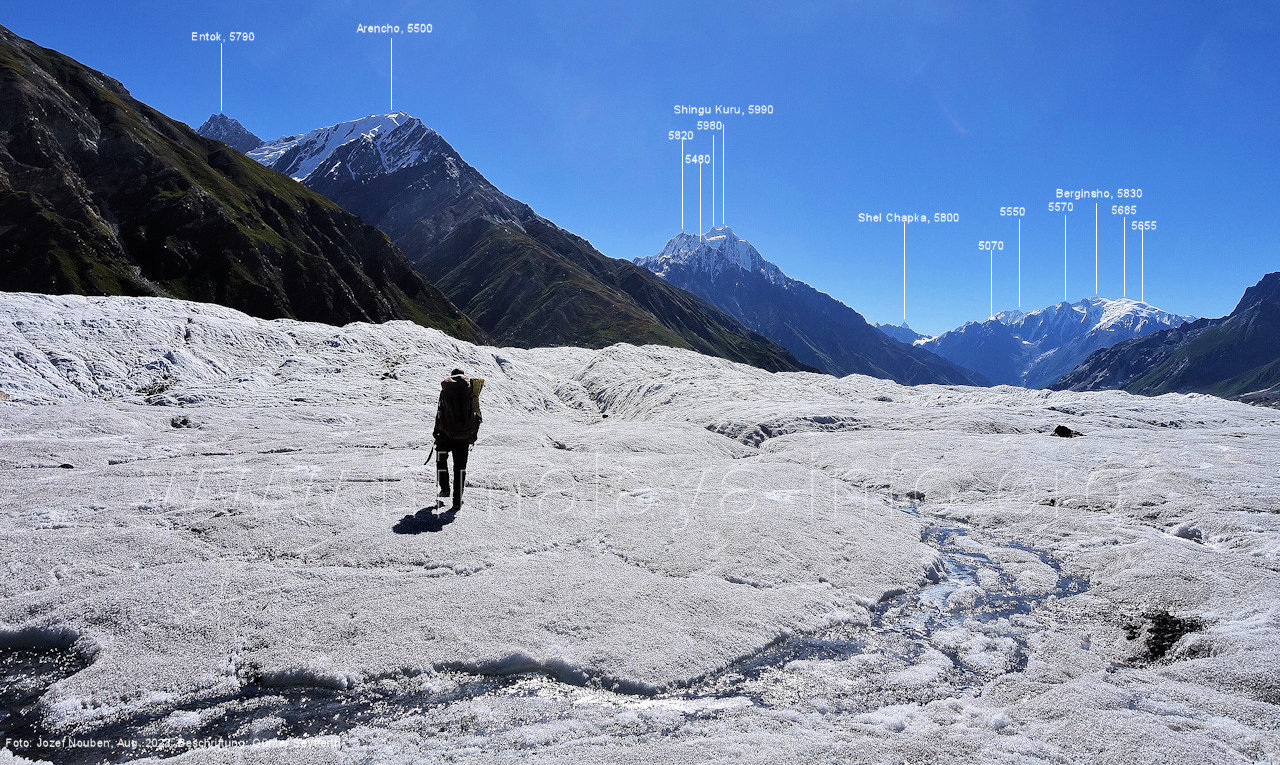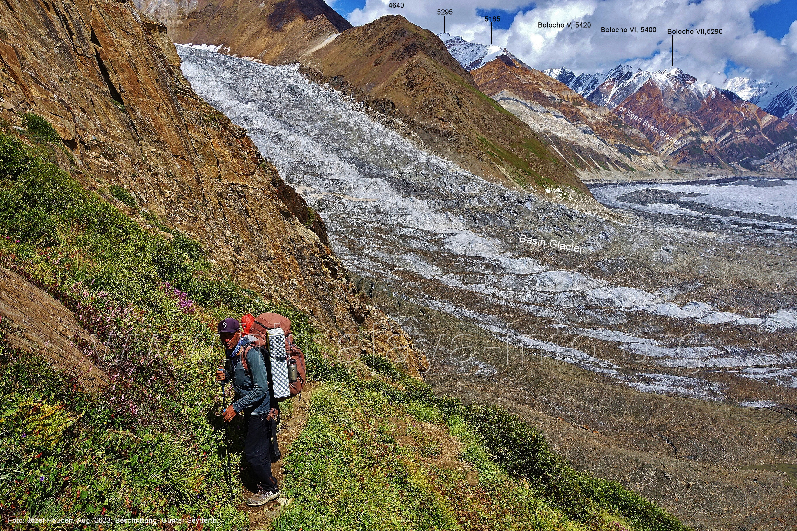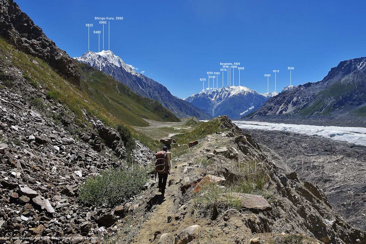 den Gipfeln über dem Trekking-Pfad sieht. Foto: Jozef Houben, Aug. 2023; Beschriftung: Günter Seyfferth (32) Blick bei 75°12'07" (Shing Kuru) nach Süd-Südwesten zum Kapaltang Kun (6237) und dem Marpoh-Gletscher
