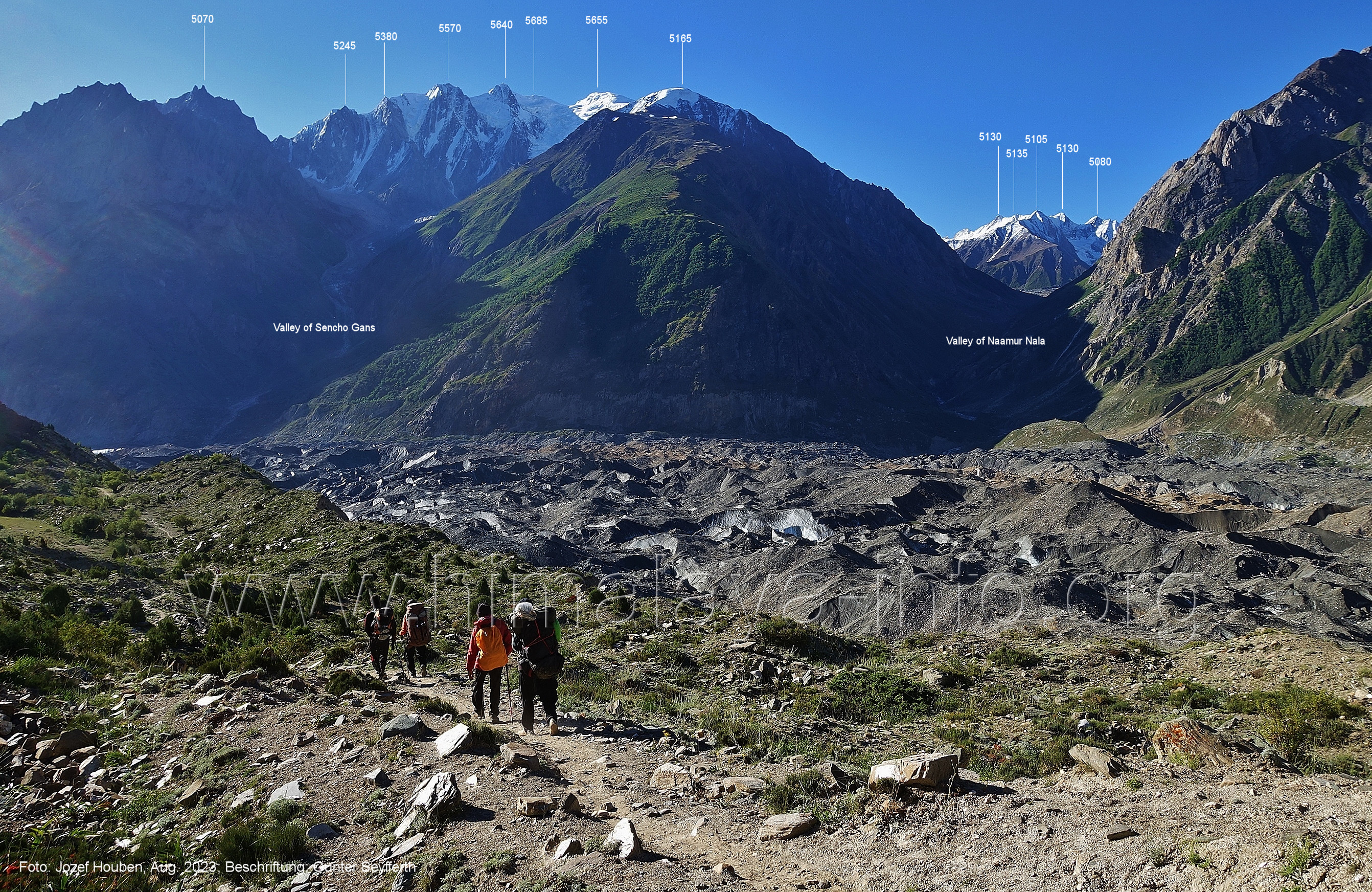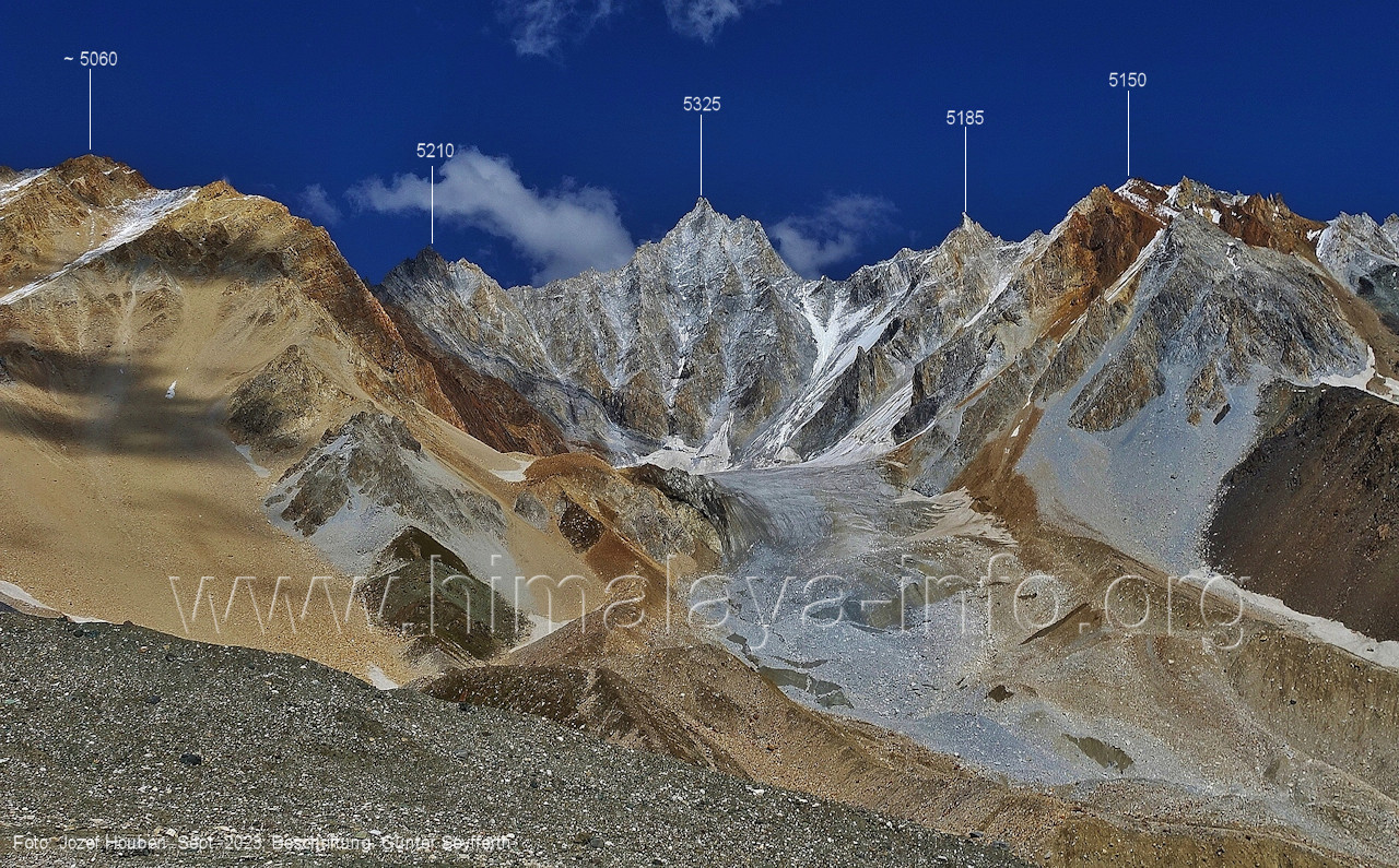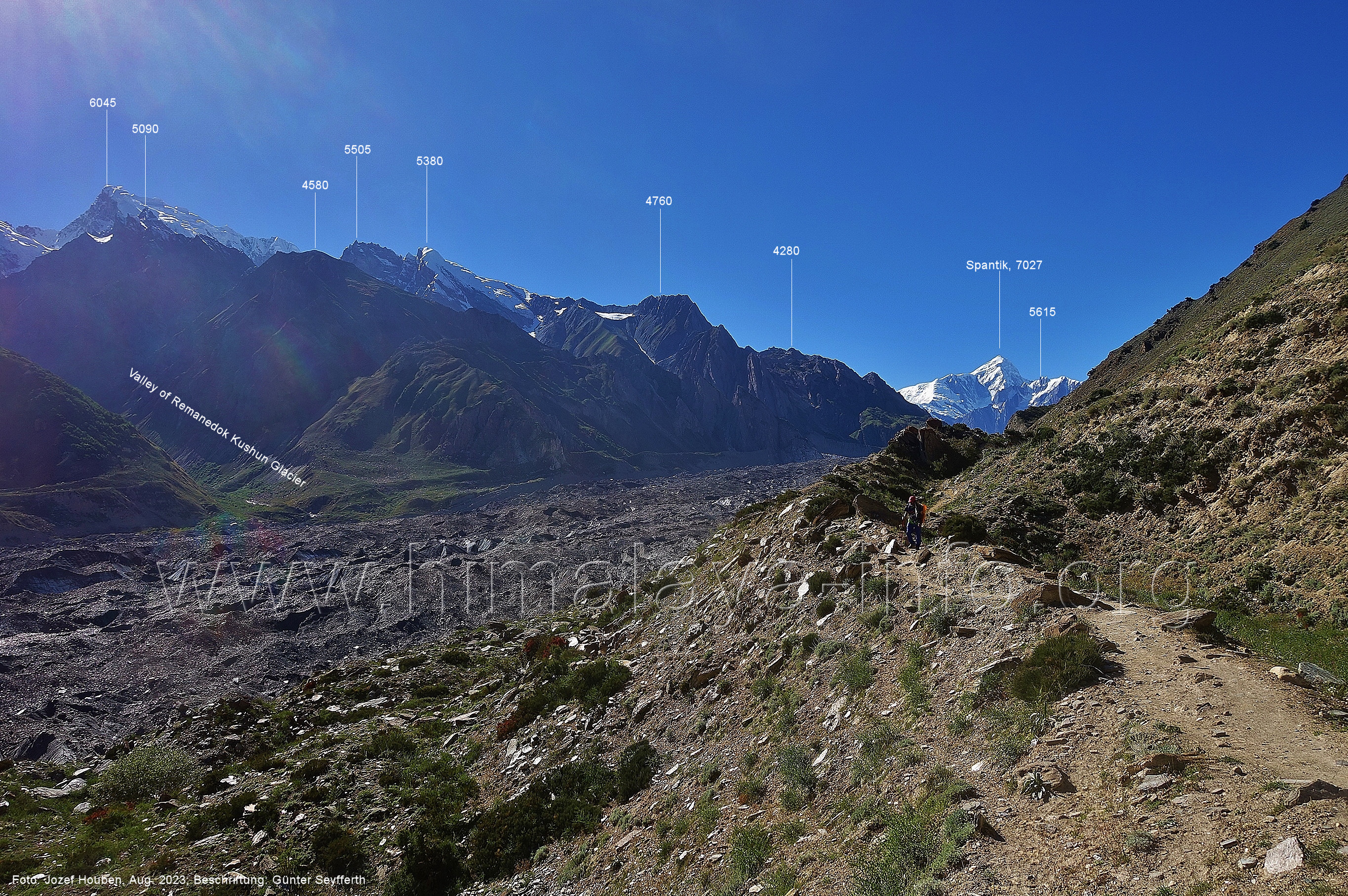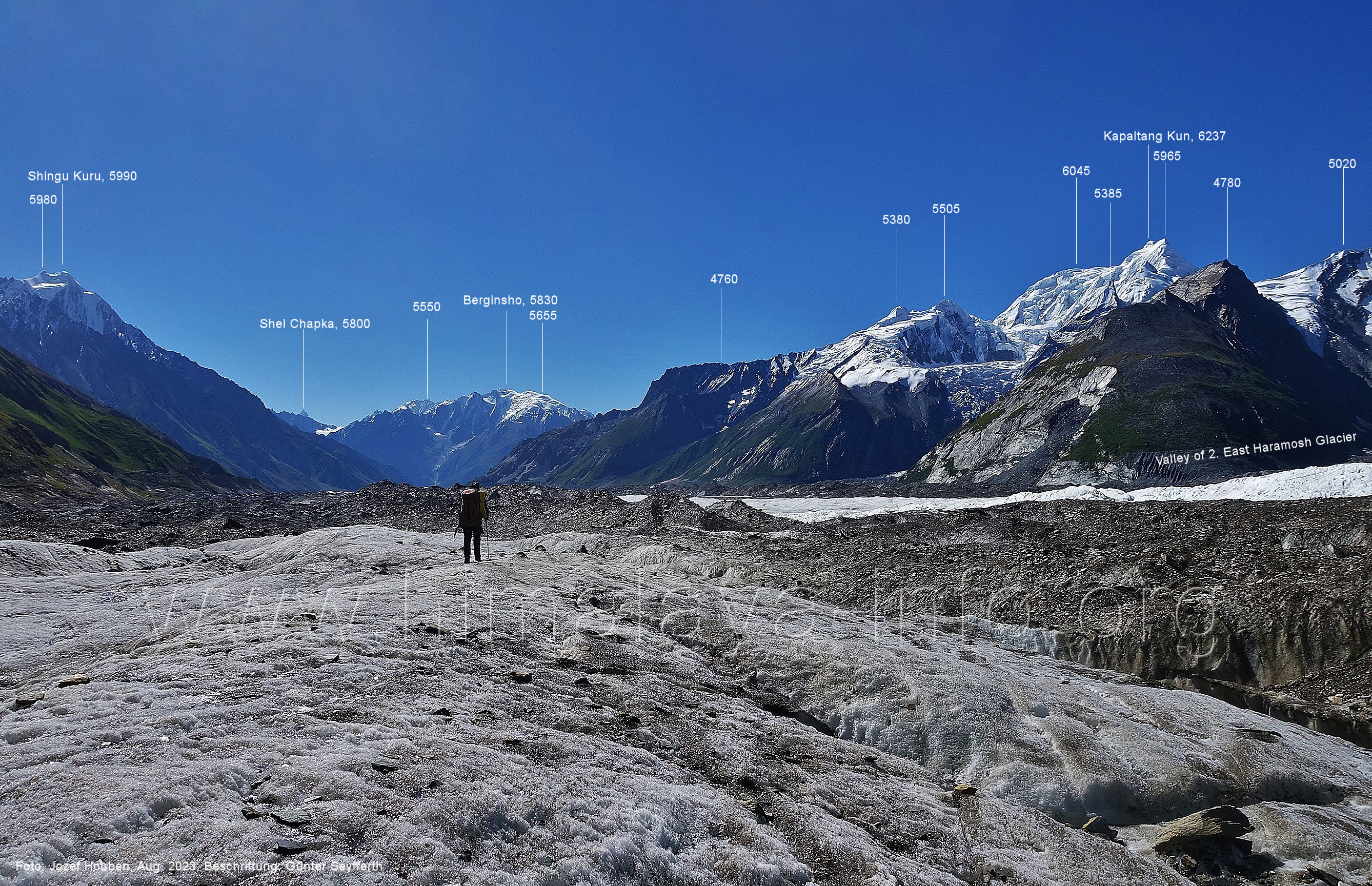 den Gipfeln über dem Trekking-Pfad sieht. Foto: Jozef Houben, Aug. 2023; Beschriftung: Günter Seyfferth (32) Blick bei 75°12'07" (Shing Kuru) nach Süd-Südwesten zum Kapaltang Kun (6237) und dem Marpoh-Gletscher