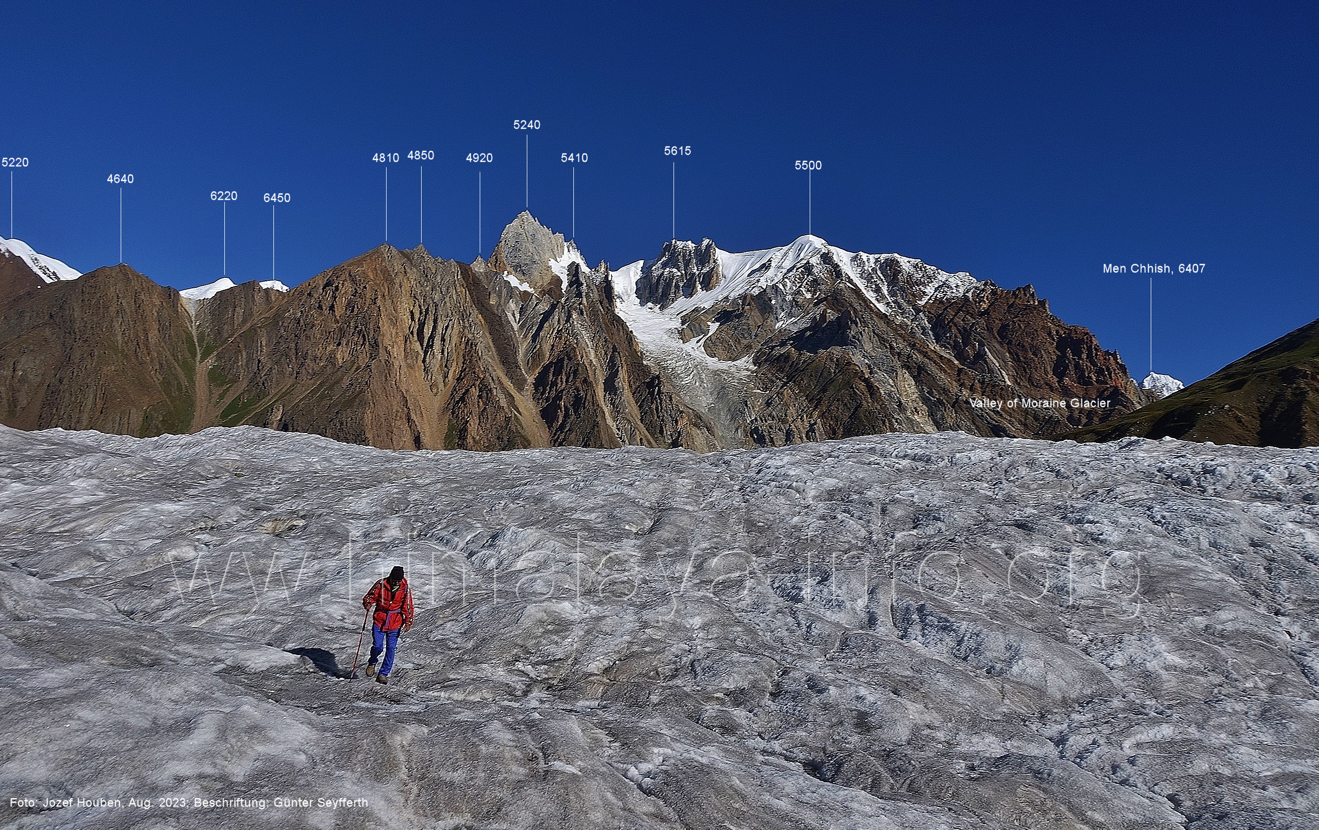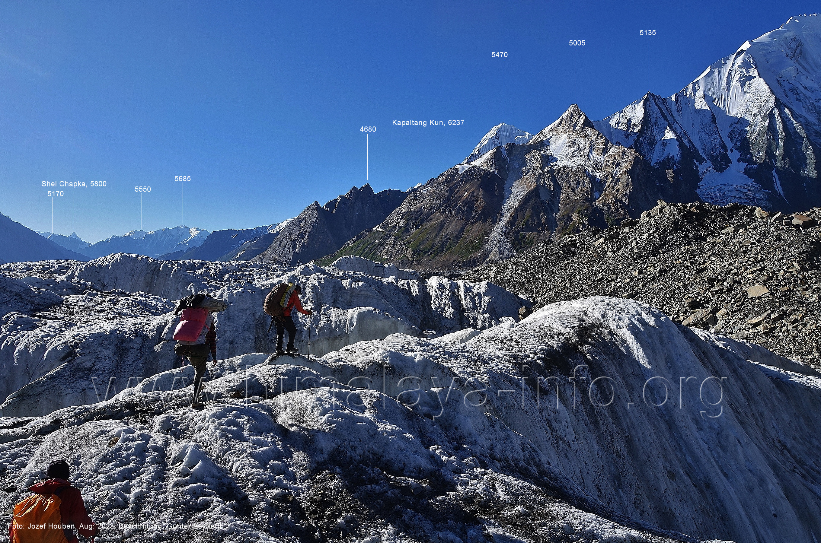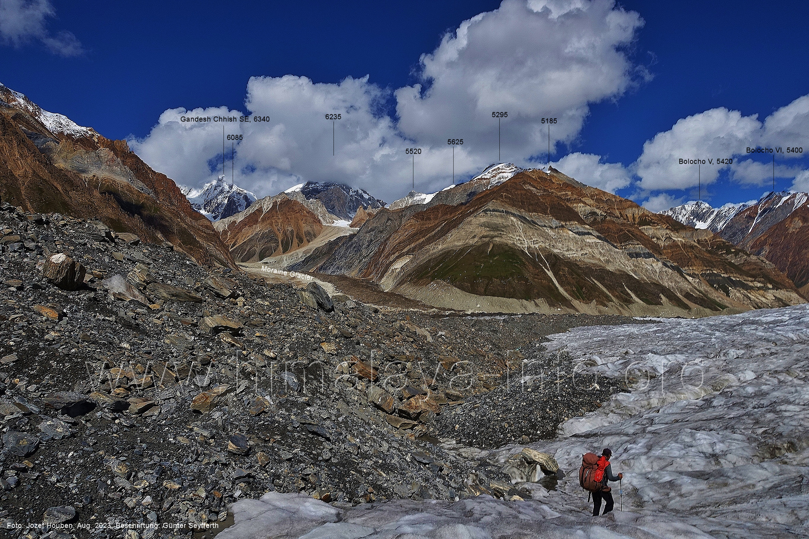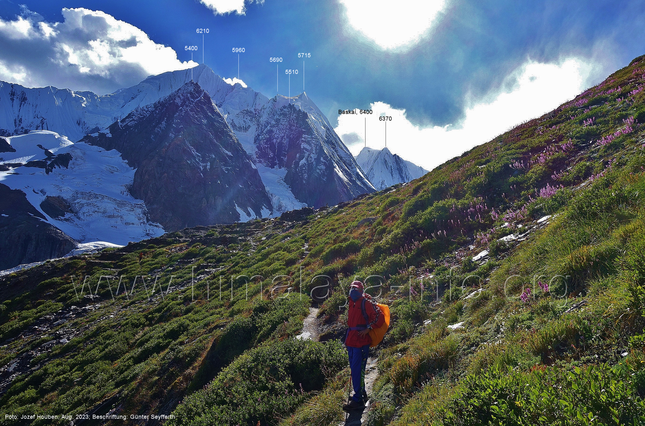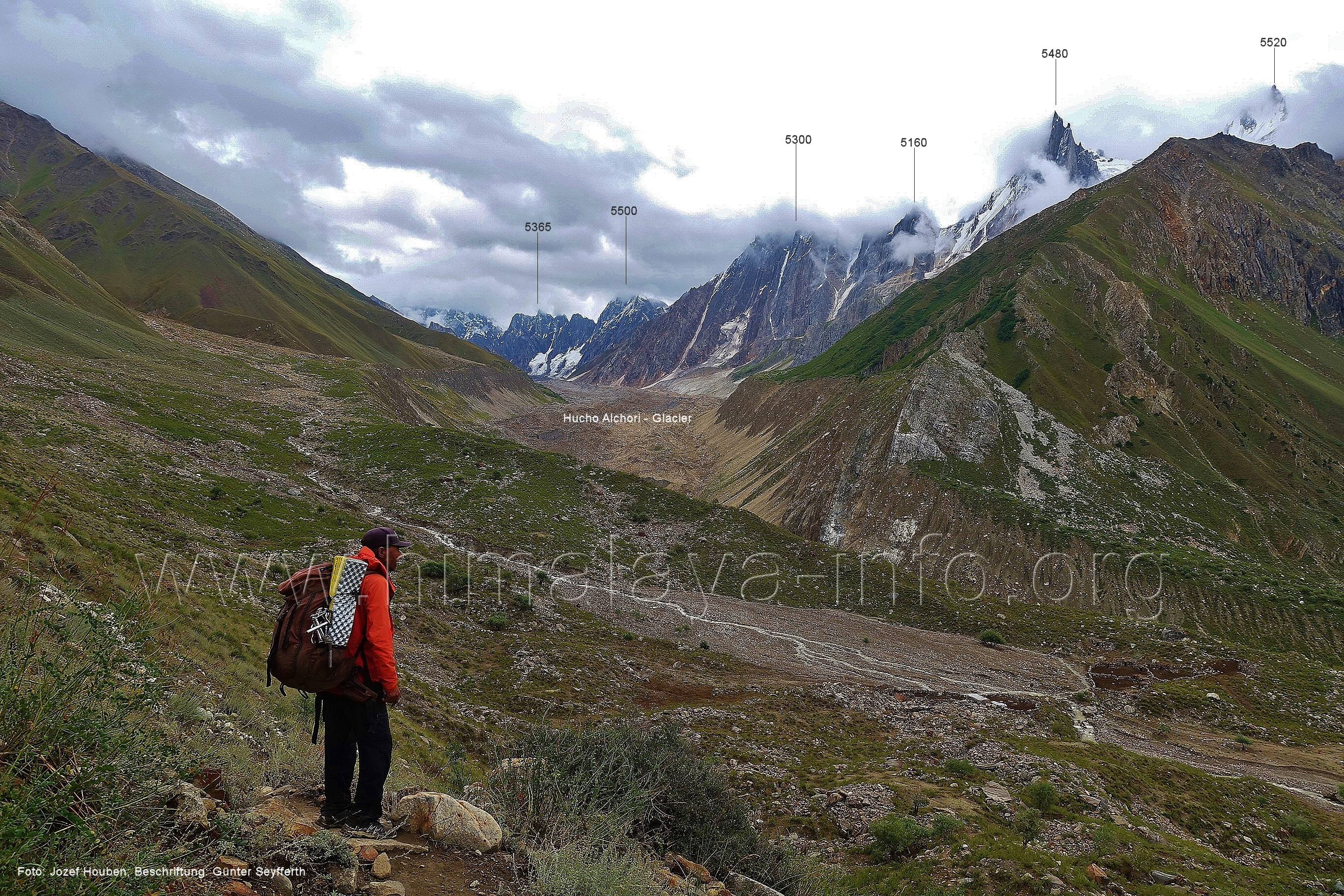 den Gipfeln über dem Trekking-Pfad sieht. Foto: Jozef Houben, Aug. 2023; Beschriftung: Günter Seyfferth (32) Blick bei 75°12'07" (Shing Kuru) nach Süd-Südwesten zum Kapaltang Kun (6237) und dem Marpoh-Gletscher