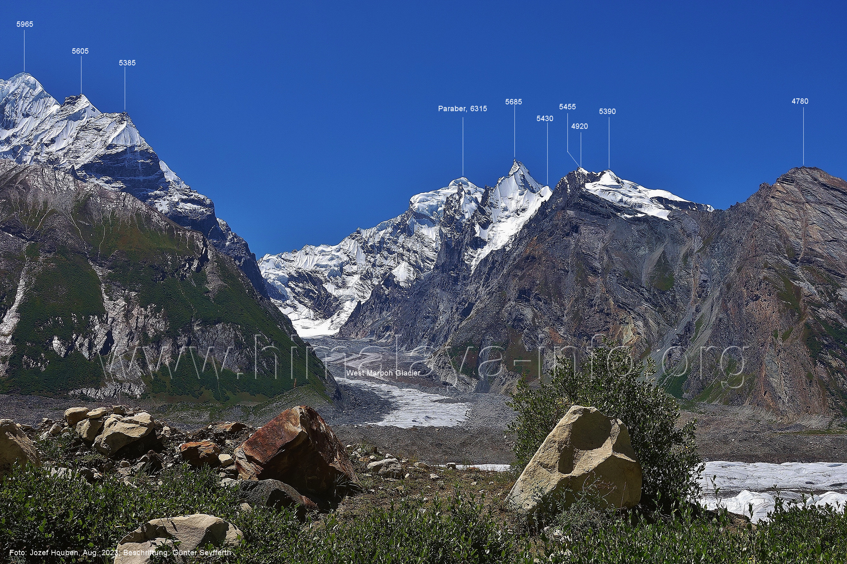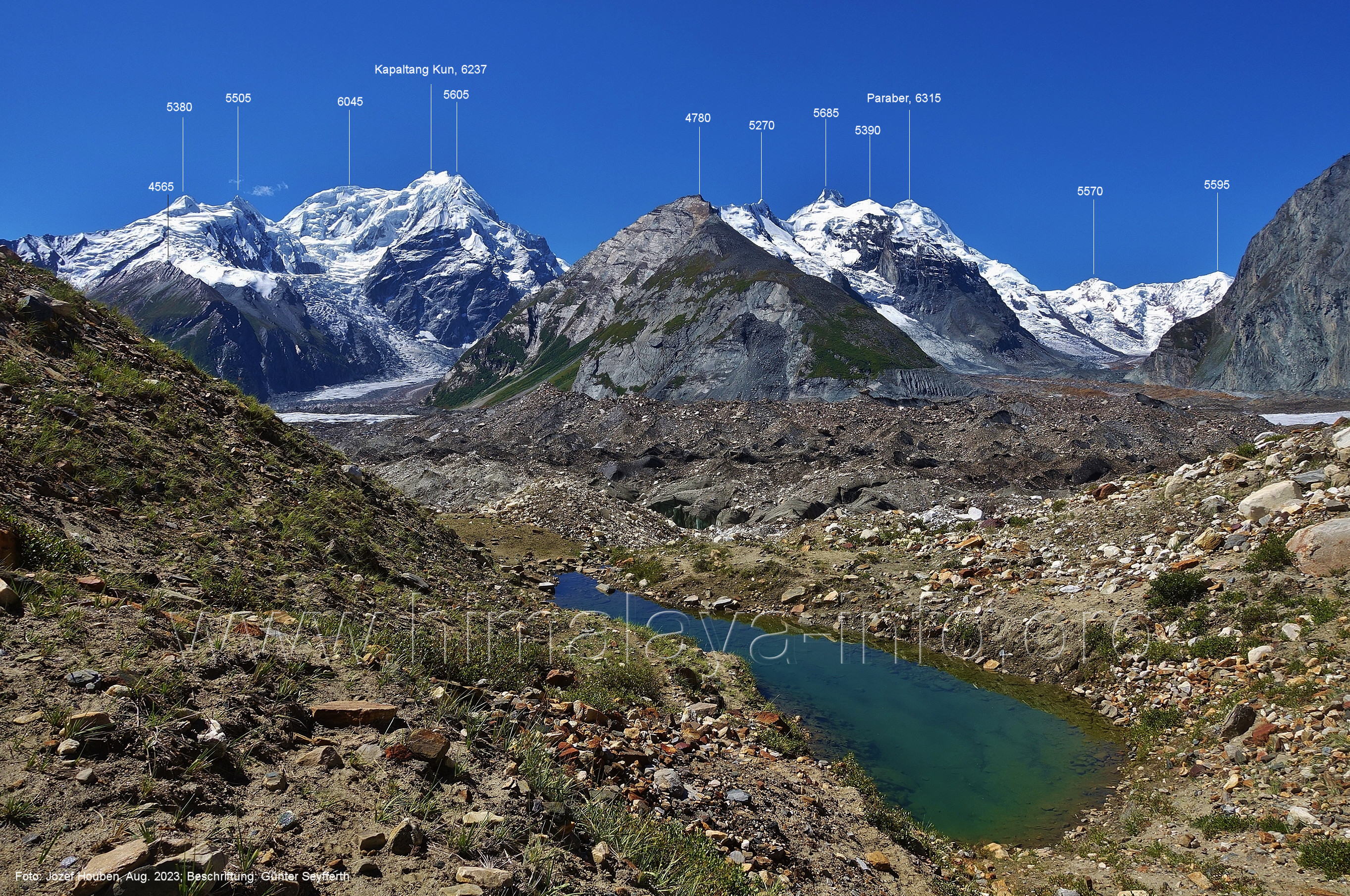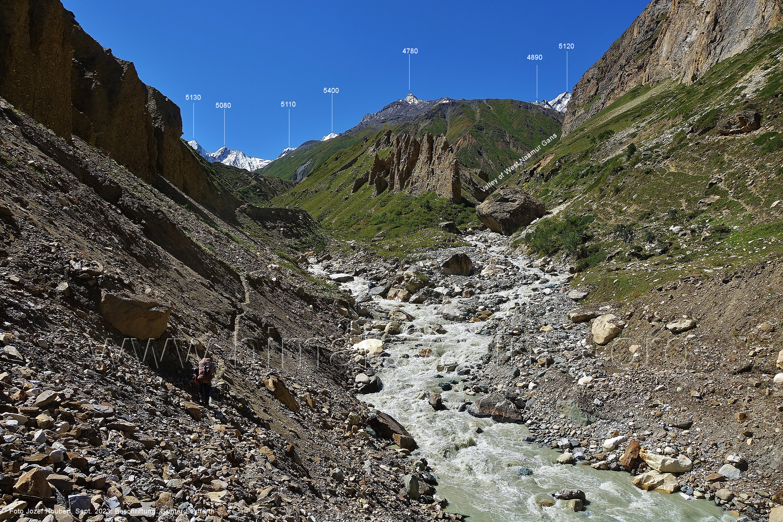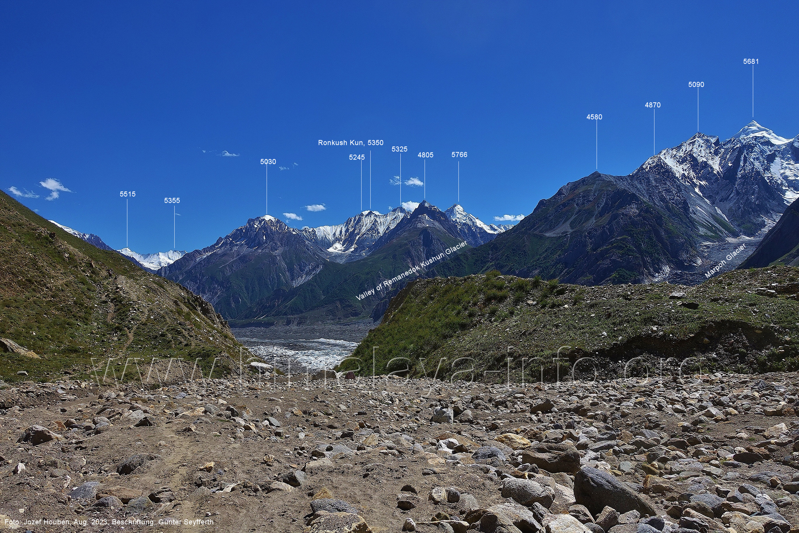 den Gipfeln über dem Trekking-Pfad sieht. Foto: Jozef Houben, Aug. 2023; Beschriftung: Günter Seyfferth (32) Blick bei 75°12'07" (Shing Kuru) nach Süd-Südwesten zum Kapaltang Kun (6237) und dem Marpoh-Gletscher