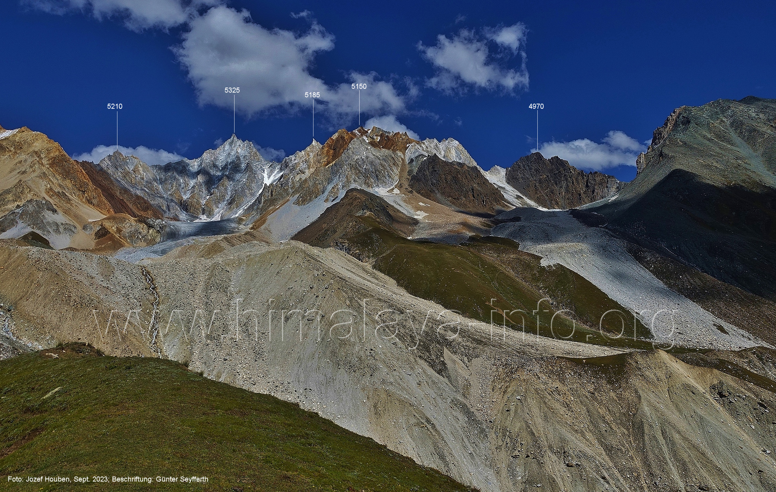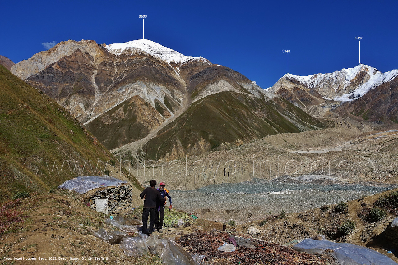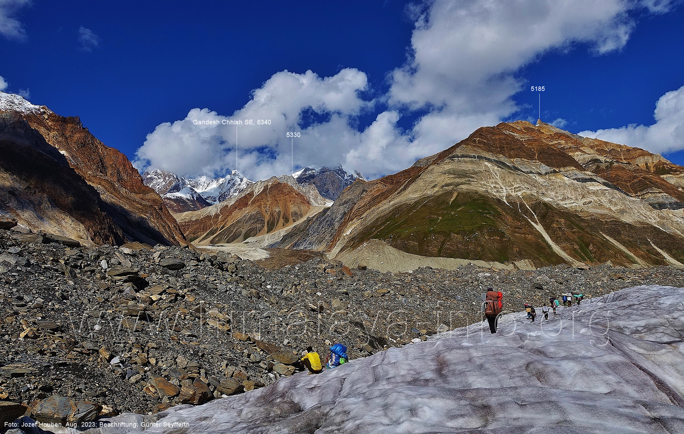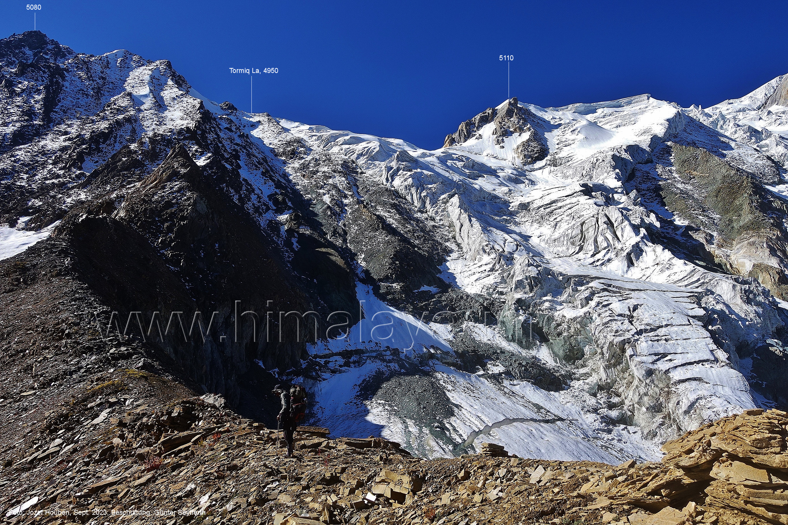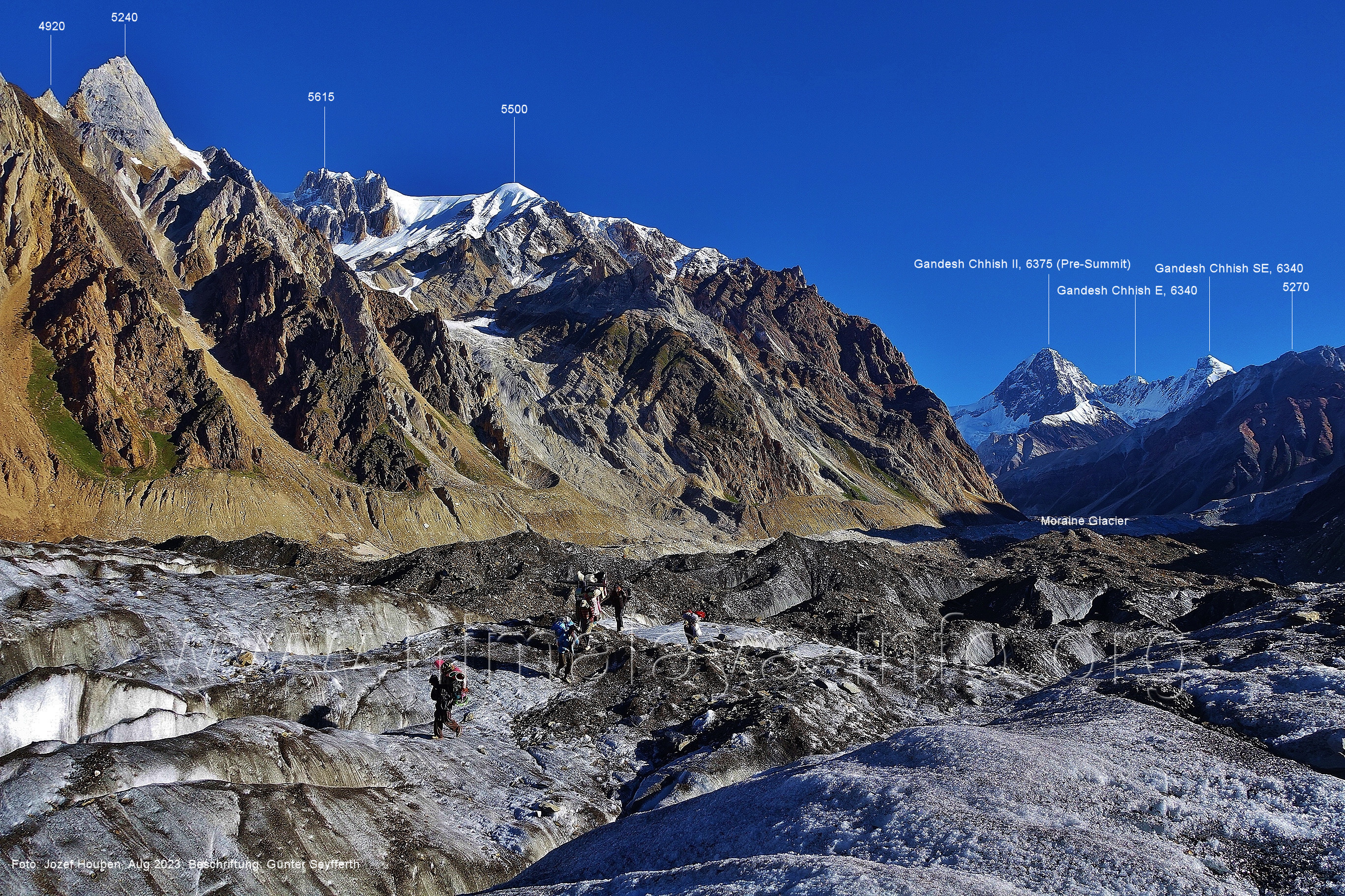 den Gipfeln über dem Trekking-Pfad sieht. Foto: Jozef Houben, Aug. 2023; Beschriftung: Günter Seyfferth (32) Blick bei 75°12'07" (Shing Kuru) nach Süd-Südwesten zum Kapaltang Kun (6237) und dem Marpoh-Gletscher