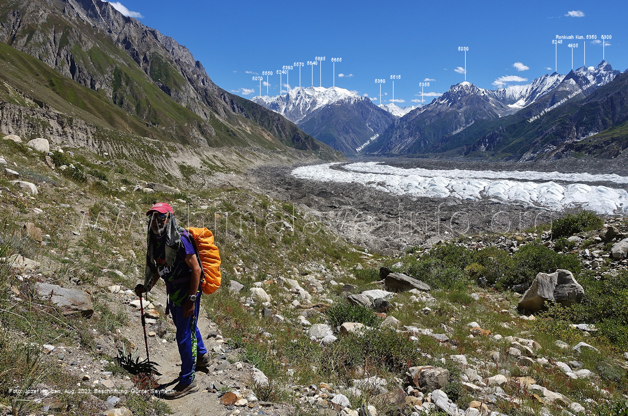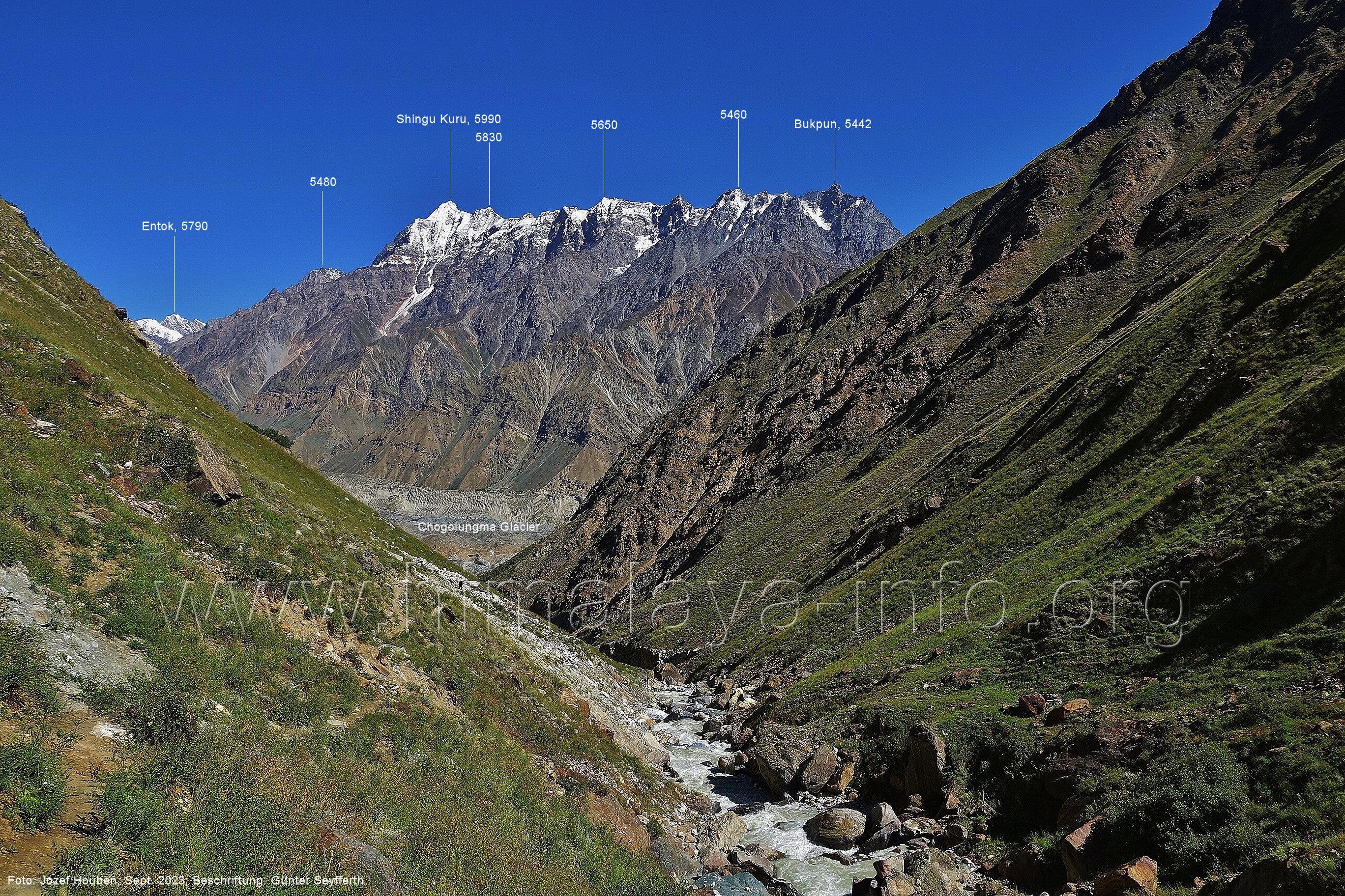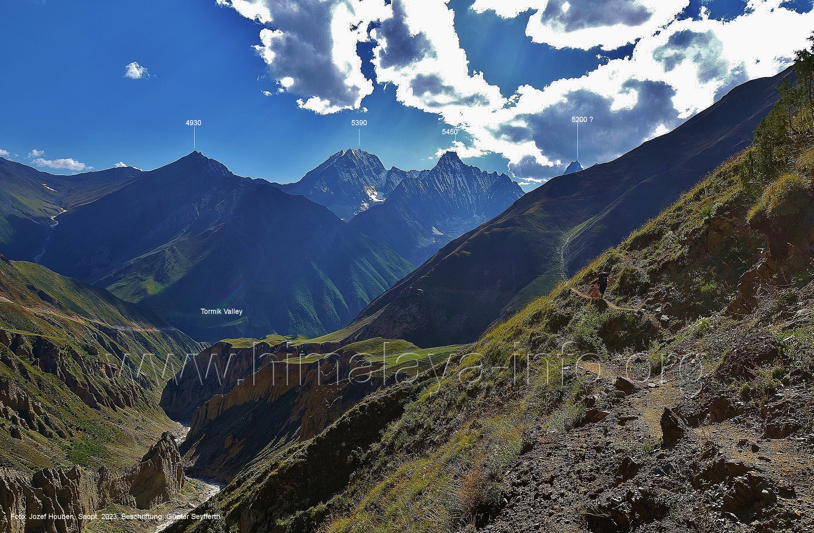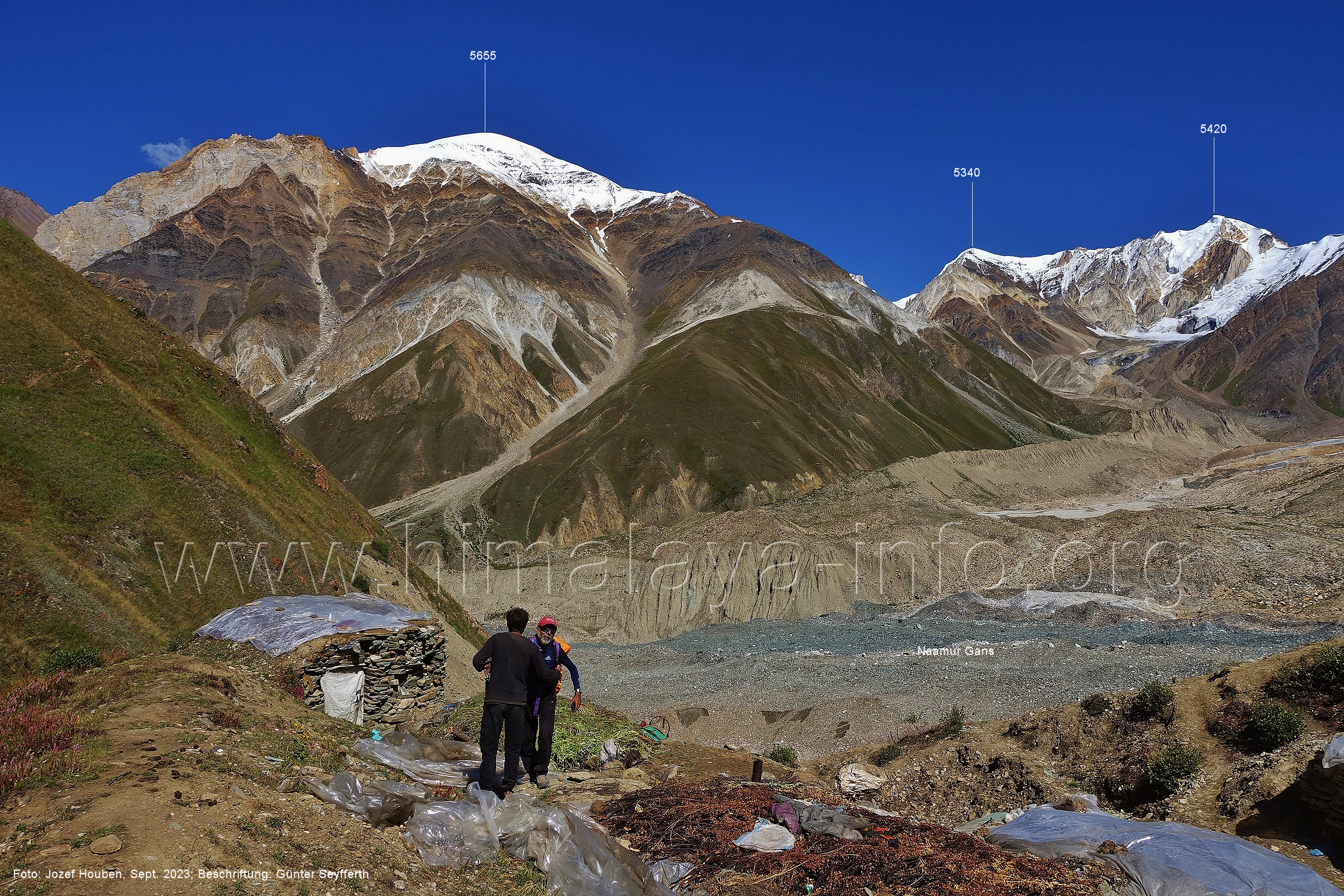 den Gipfeln über dem Trekking-Pfad sieht. Foto: Jozef Houben, Aug. 2023; Beschriftung: Günter Seyfferth (32) Blick bei 75°12'07" (Shing Kuru) nach Süd-Südwesten zum Kapaltang Kun (6237) und dem Marpoh-Gletscher