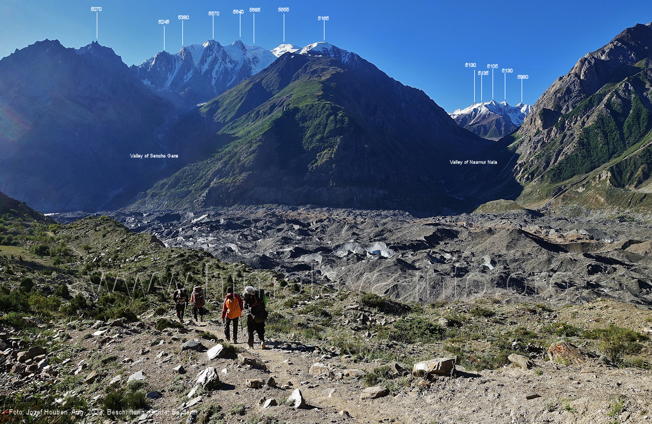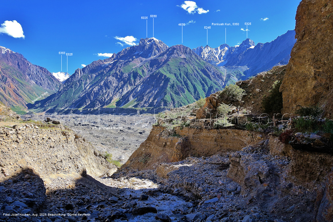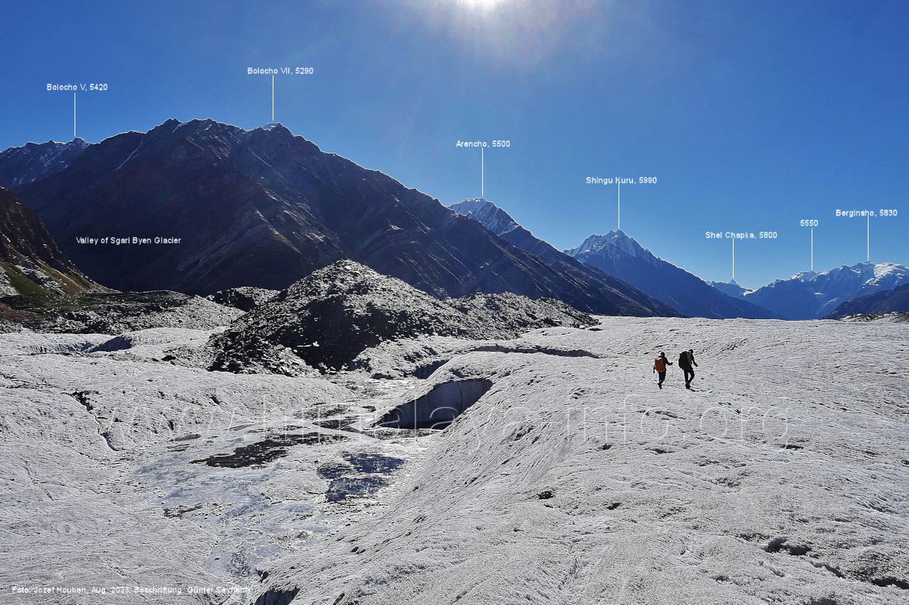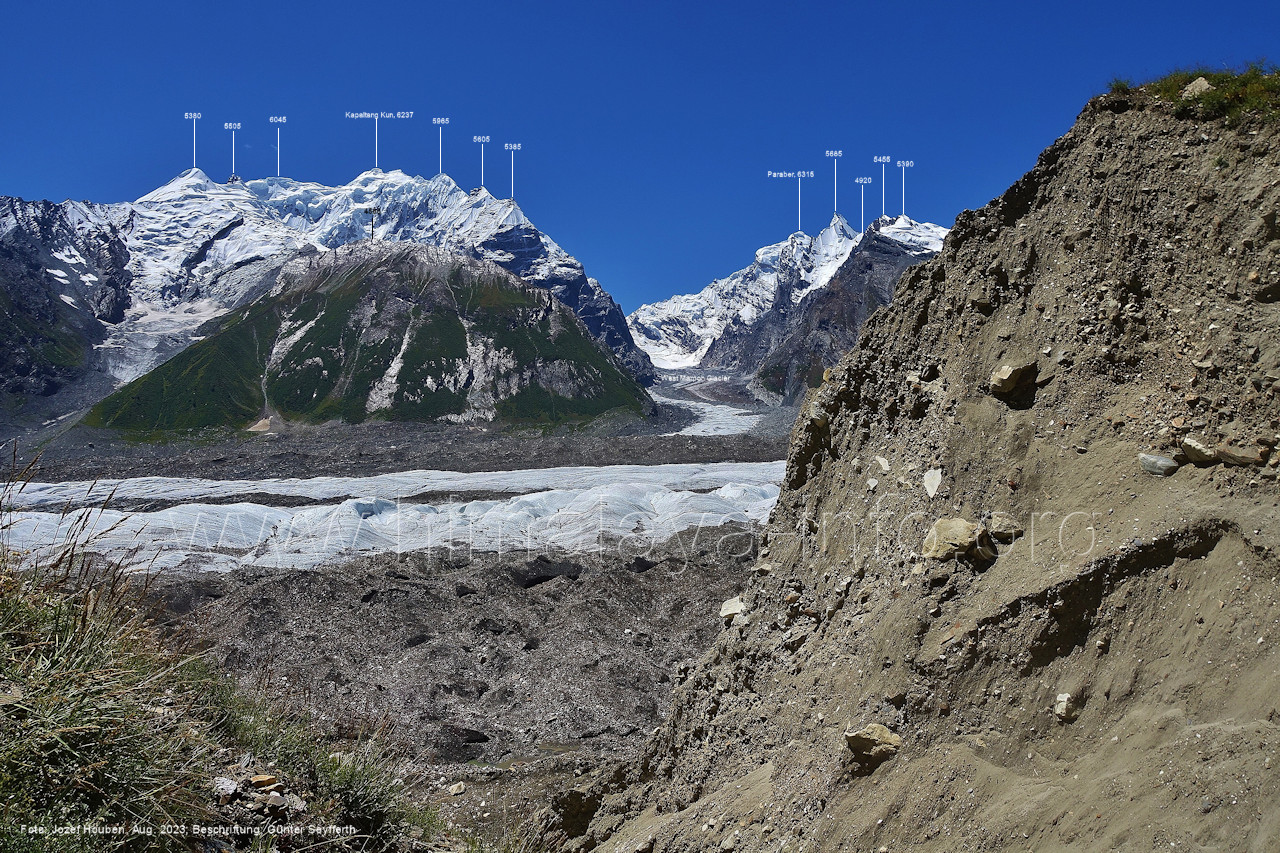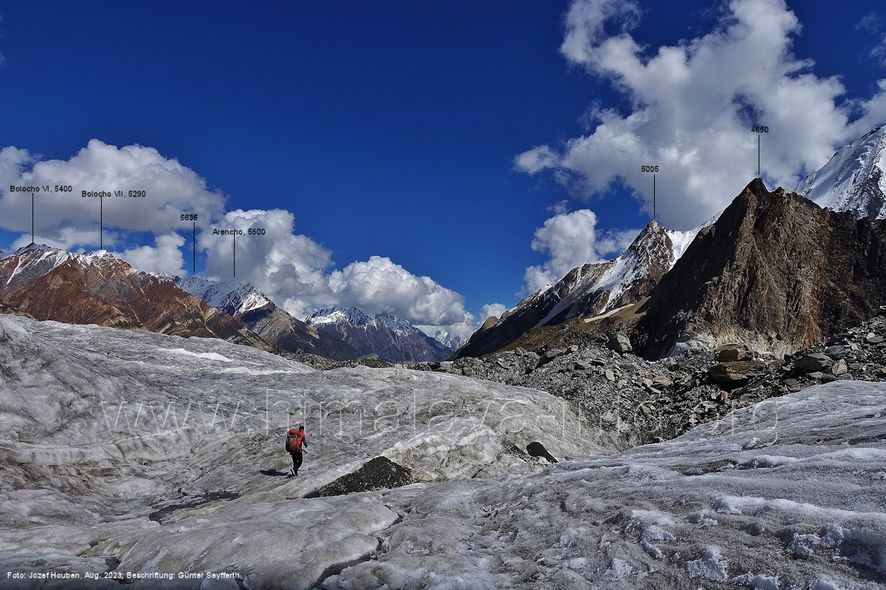 Gletscher herauf. Foto: Jozef Houben, Aug. 2023; Beschriftung: Günter Seyfferth (49) Blick bei 75°07'50" (H = 3820 m) talauswärts Foto: Jozef Houben, Aug. 2023; Beschriftung: Günter Seyfferth (50) Blick bei 75°07°35" nach Westen mit Haramosh II (6666 m), Malubiting (7458 m) und Spantik (7027 m) Noch kann man außerhalb des Gletschers gehen. Foto: Jozef Houben, Aug. 2023; Beschriftung: Günter Seyfferth (51) Blick bei 75°07'50" nach Süden zum Kapaltang Kun (6237 m) Foto: Jozef Houben, Aug. 2023; Beschriftung: Günter Seyfferth (52) Blick bei 75°07'40" nach Südosten mit Berginsho (5830 m) und Kapaltang Kun (6237 m) Foto: Jozef Houben, Aug. 2023; Beschriftung: Günter Seyfferth (53) Blick bei 75°07'35" nach Westen mit Haramosh II (6666 m), Malubiting (7458 m) und Spantik (7027 m) Foto: Jozef Houben, Aug. 2023; Beschriftung: Günter Seyfferth (54) Blick bei 75°07'20" nach West-Nordwesten zum Spantik (7027 m) Der Gipfel des Spantik ist immer noch 17,5 km entfernt. 10 km sind es bis zu den Gipfeln davor. Foto: Jozef Houben, Aug. 2023; Beschriftung: Günter Seyfferth (55) Blick bei 75°07'15" nach Nordosten ins Bolocho-Tal