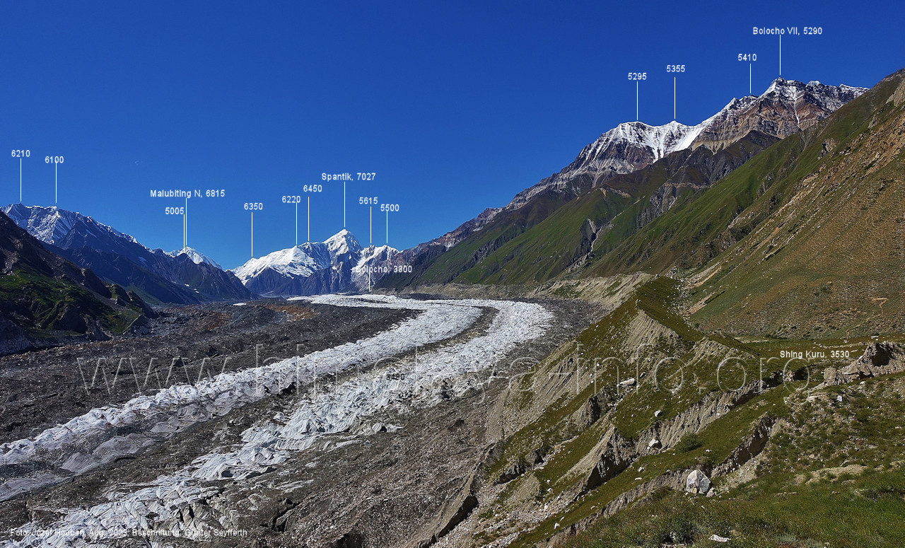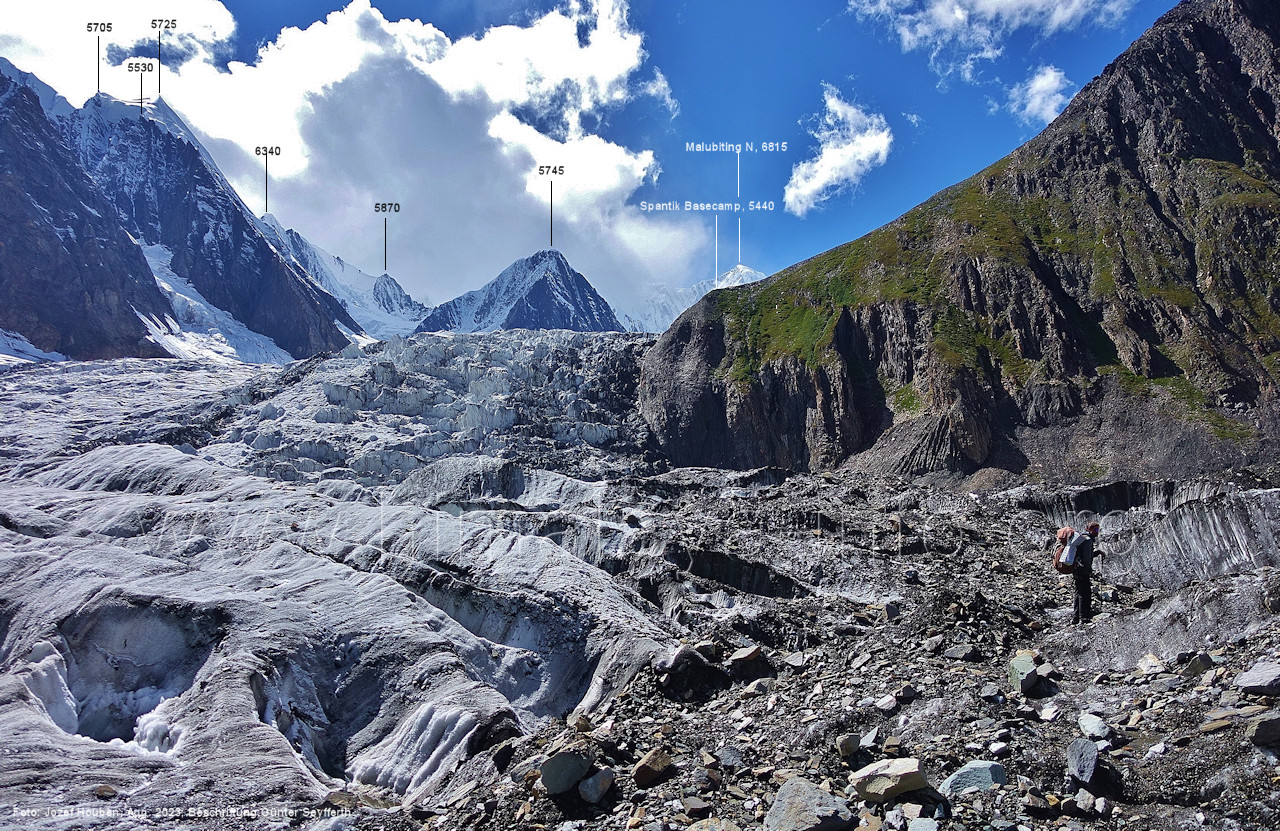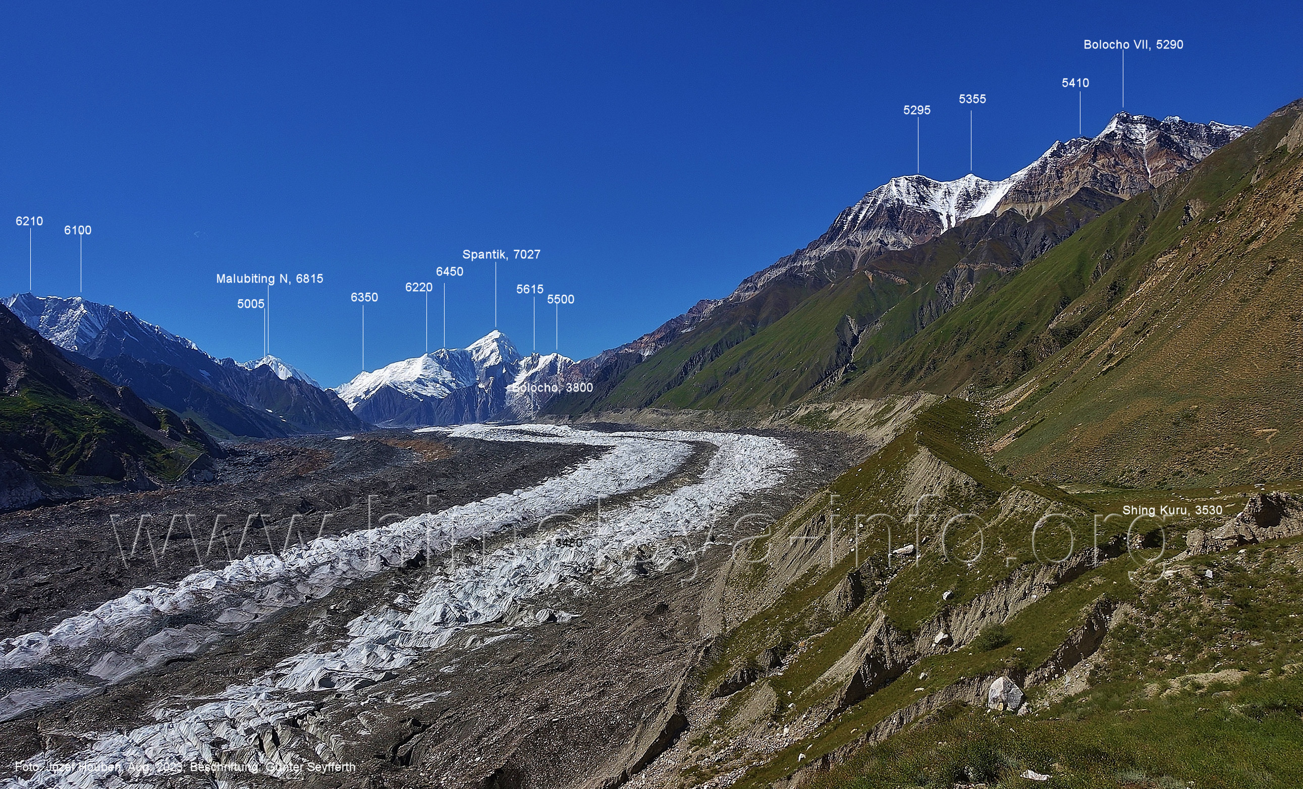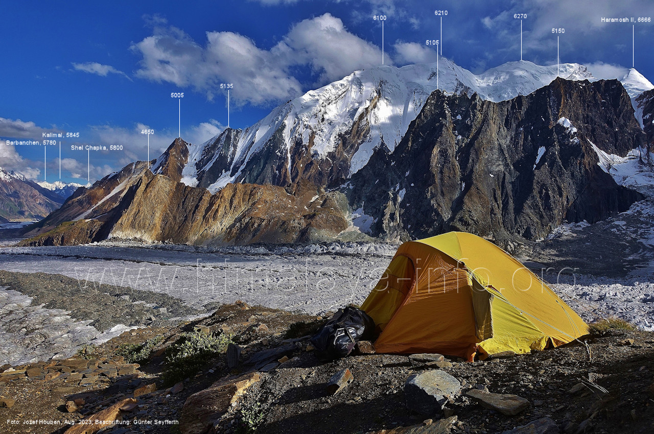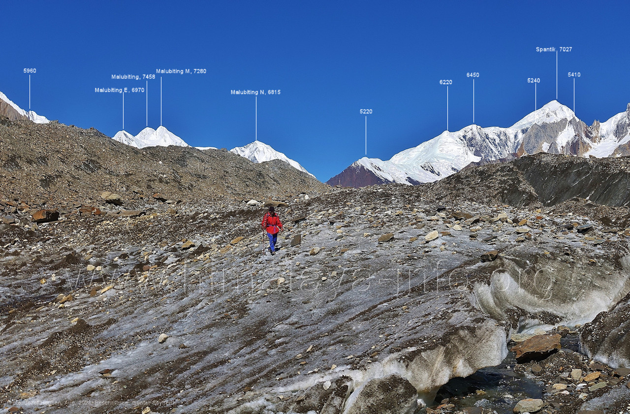 Gletscher herauf. Foto: Jozef Houben, Aug. 2023; Beschriftung: Günter Seyfferth (49) Blick bei 75°07'50" (H = 3820 m) talauswärts Foto: Jozef Houben, Aug. 2023; Beschriftung: Günter Seyfferth (50) Blick bei 75°07°35" nach Westen mit Haramosh II (6666 m), Malubiting (7458 m) und Spantik (7027 m) Noch kann man außerhalb des Gletschers gehen. Foto: Jozef Houben, Aug. 2023; Beschriftung: Günter Seyfferth (51) Blick bei 75°07'50" nach Süden zum Kapaltang Kun (6237 m) Foto: Jozef Houben, Aug. 2023; Beschriftung: Günter Seyfferth (52) Blick bei 75°07'40" nach Südosten mit Berginsho (5830 m) und Kapaltang Kun (6237 m) Foto: Jozef Houben, Aug. 2023; Beschriftung: Günter Seyfferth (53) Blick bei 75°07'35" nach Westen mit Haramosh II (6666 m), Malubiting (7458 m) und Spantik (7027 m) Foto: Jozef Houben, Aug. 2023; Beschriftung: Günter Seyfferth (54) Blick bei 75°07'20" nach West-Nordwesten zum Spantik (7027 m) Der Gipfel des Spantik ist immer noch 17,5 km entfernt. 10 km sind es bis zu den Gipfeln davor. Foto: Jozef Houben, Aug. 2023; Beschriftung: Günter Seyfferth (55) Blick bei 75°07'15" nach Nordosten ins Bolocho-Tal