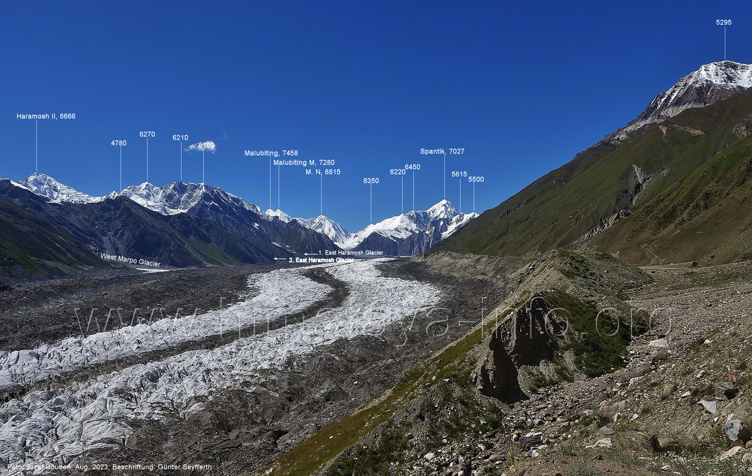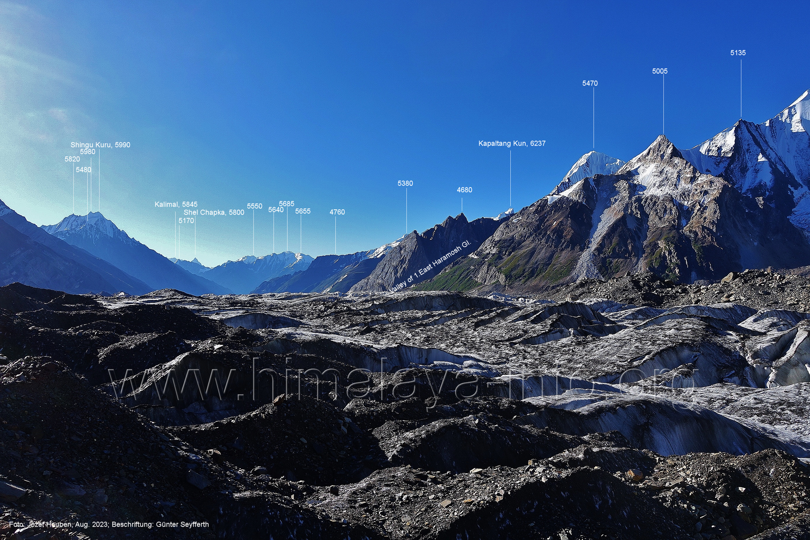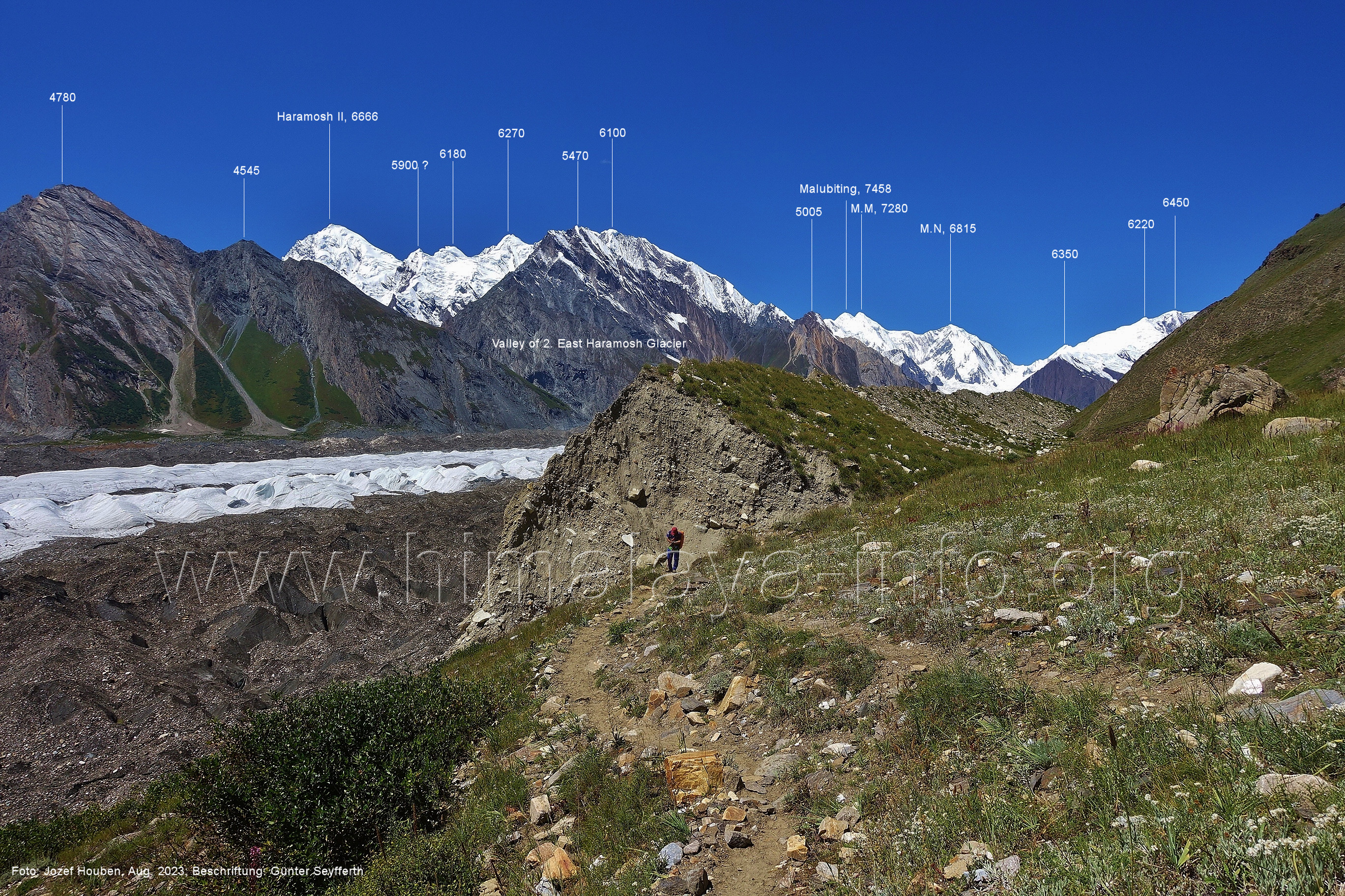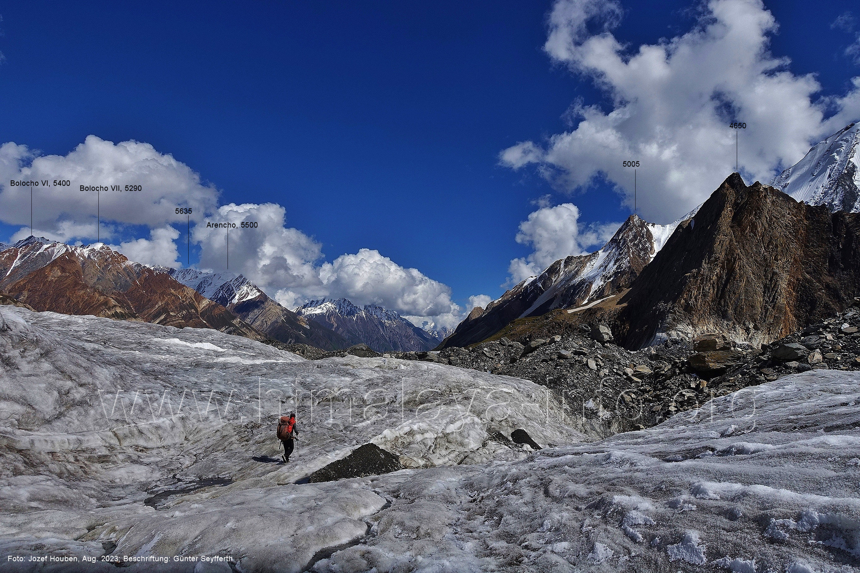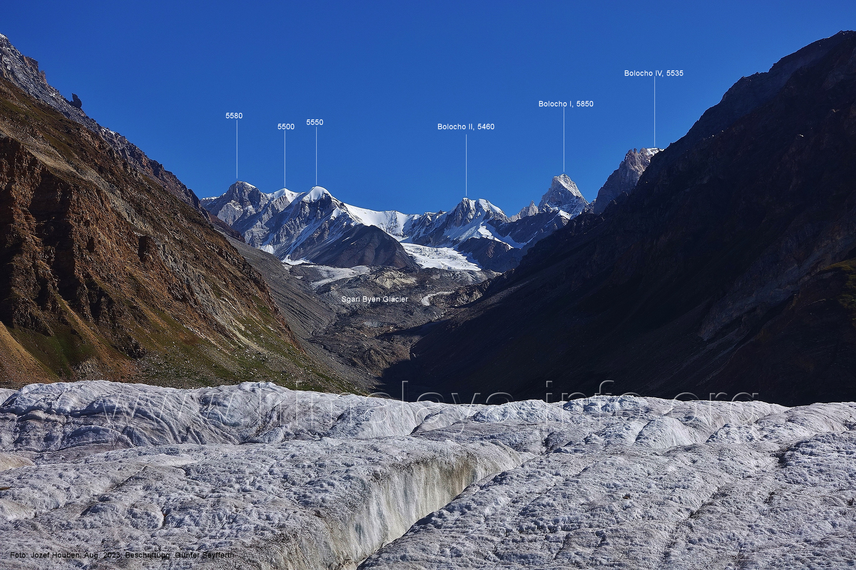 Gletscher herauf. Foto: Jozef Houben, Aug. 2023; Beschriftung: Günter Seyfferth (49) Blick bei 75°07'50" (H = 3820 m) talauswärts Foto: Jozef Houben, Aug. 2023; Beschriftung: Günter Seyfferth (50) Blick bei 75°07°35" nach Westen mit Haramosh II (6666 m), Malubiting (7458 m) und Spantik (7027 m) Noch kann man außerhalb des Gletschers gehen. Foto: Jozef Houben, Aug. 2023; Beschriftung: Günter Seyfferth (51) Blick bei 75°07'50" nach Süden zum Kapaltang Kun (6237 m) Foto: Jozef Houben, Aug. 2023; Beschriftung: Günter Seyfferth (52) Blick bei 75°07'40" nach Südosten mit Berginsho (5830 m) und Kapaltang Kun (6237 m) Foto: Jozef Houben, Aug. 2023; Beschriftung: Günter Seyfferth (53) Blick bei 75°07'35" nach Westen mit Haramosh II (6666 m), Malubiting (7458 m) und Spantik (7027 m) Foto: Jozef Houben, Aug. 2023; Beschriftung: Günter Seyfferth (54) Blick bei 75°07'20" nach West-Nordwesten zum Spantik (7027 m) Der Gipfel des Spantik ist immer noch 17,5 km entfernt. 10 km sind es bis zu den Gipfeln davor. Foto: Jozef Houben, Aug. 2023; Beschriftung: Günter Seyfferth (55) Blick bei 75°07'15" nach Nordosten ins Bolocho-Tal