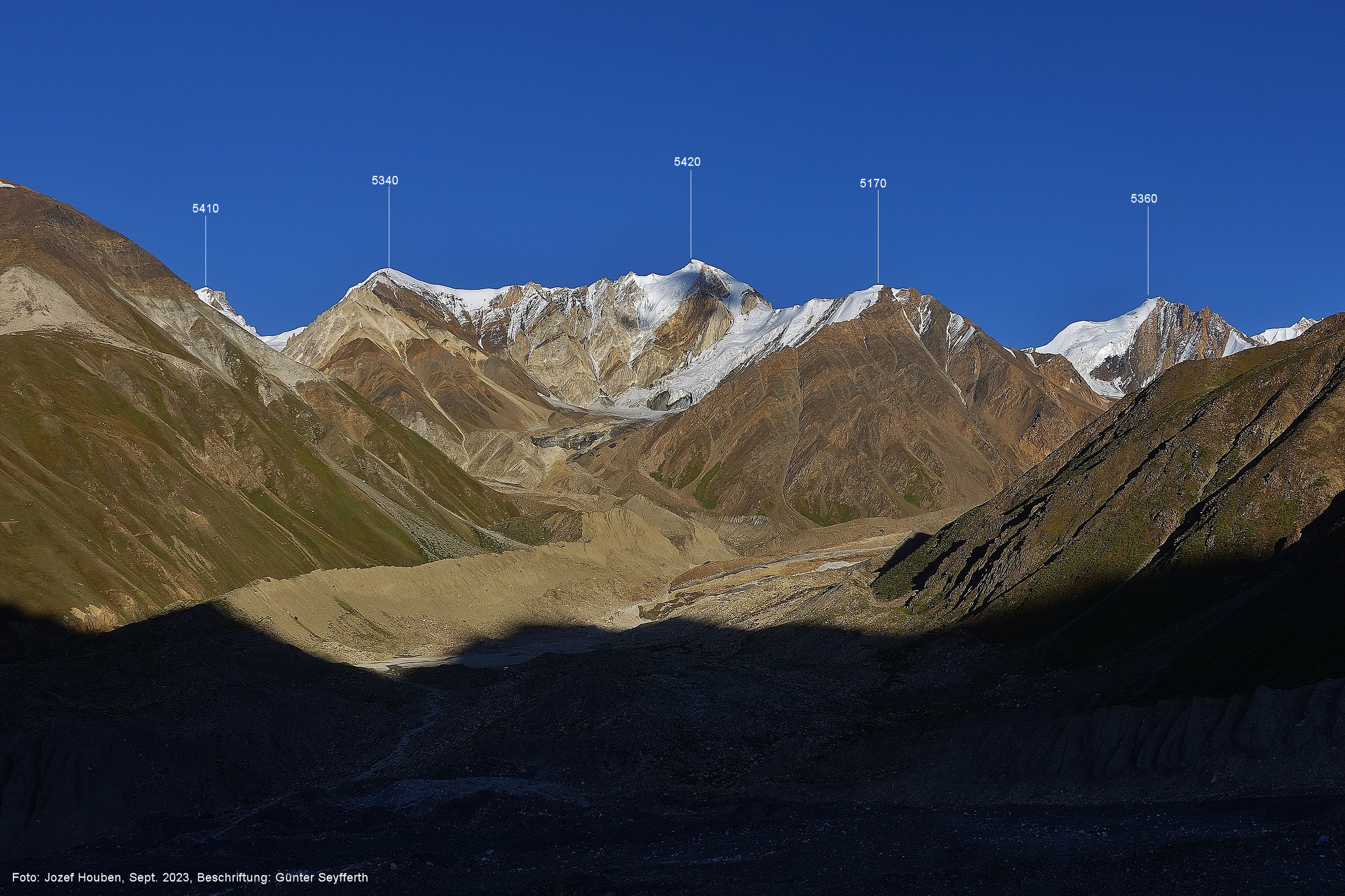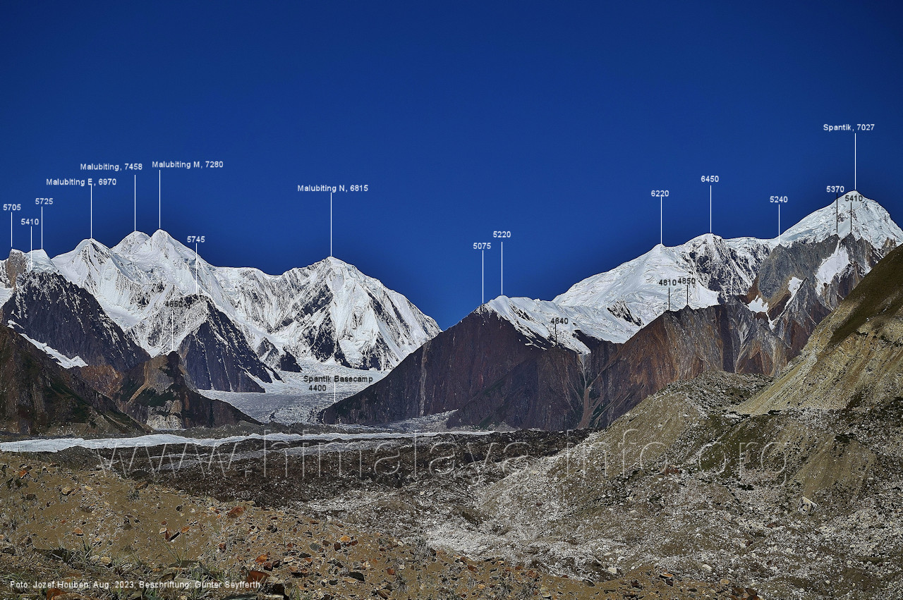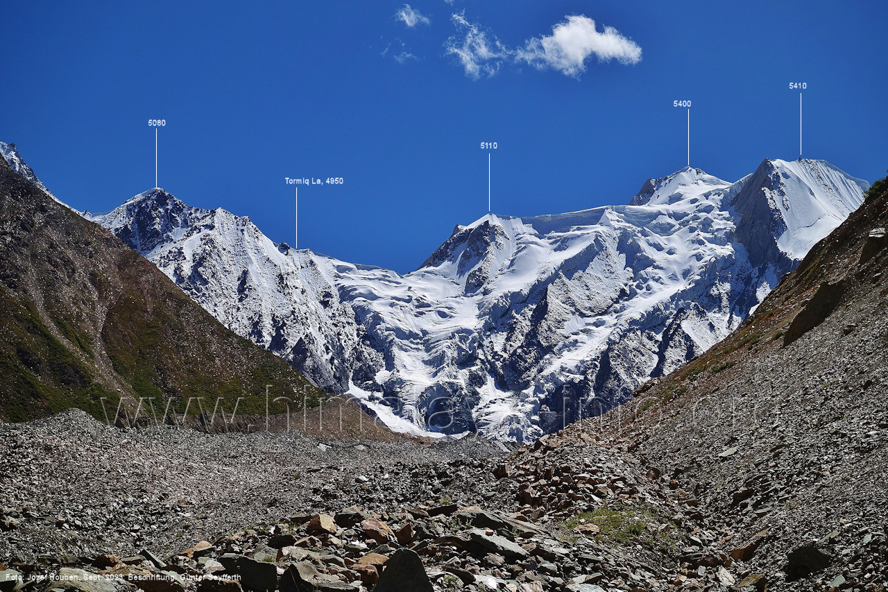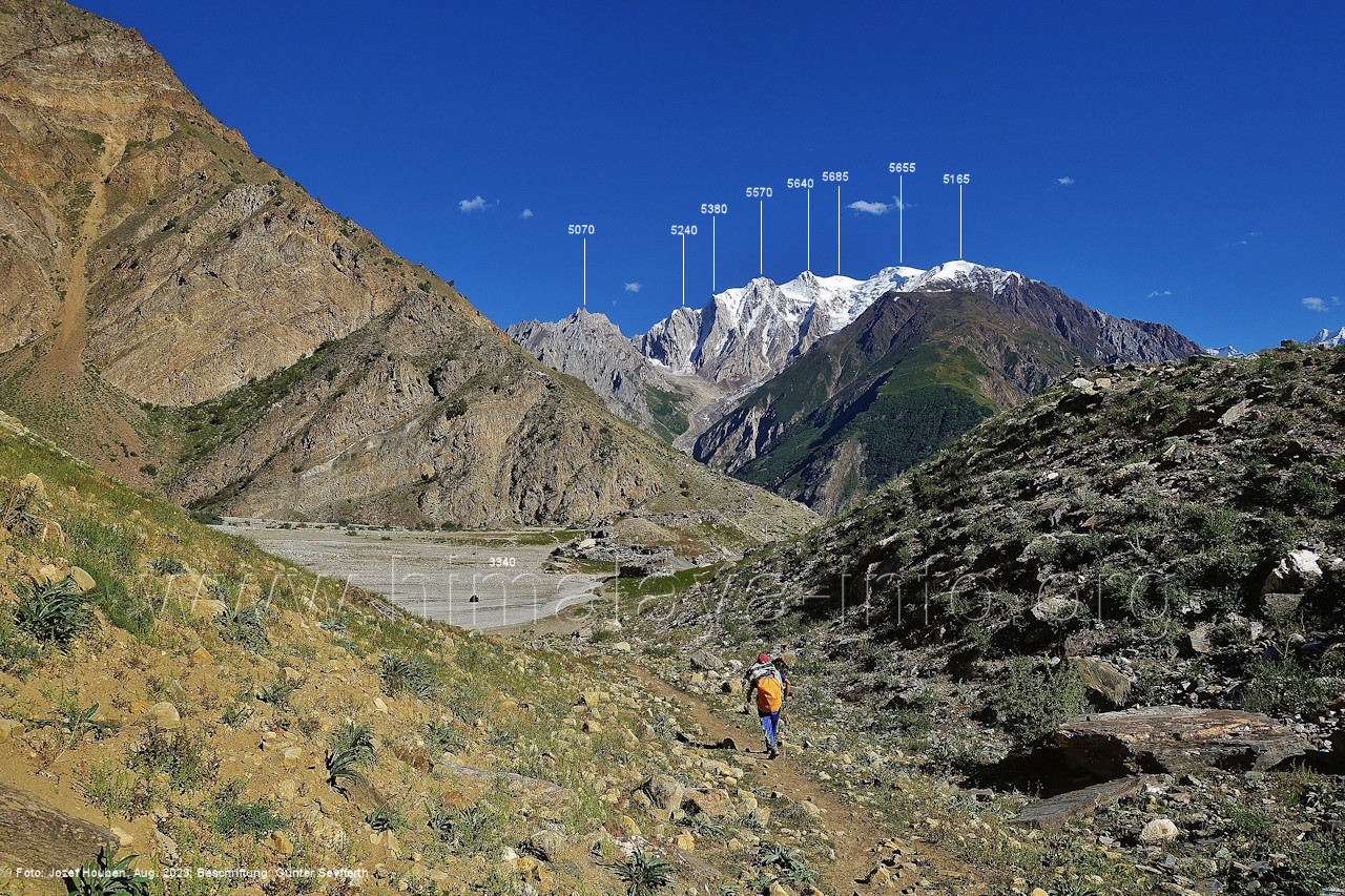 Peak (5500 m) und Entok (5790 m). Foto: Jozef Houben, Aug. 2023; Beschriftung: Günter Seyfferth (56) Blick bei 75°07'15" an der Mündung des Bolocho-Tals nach Süden zu Kapaltang Kun (6237 m) und Paraber (6315 m) Foto: Jozef Houben, Aug. 2023; Beschriftung: Günter Seyfferth (57) Blick bei 75°07'05" in ca. 3840 m Höhe nach Südwesten mit Laila I (6986 m), Malubiting (7458 m) und Spantik (7027 m).