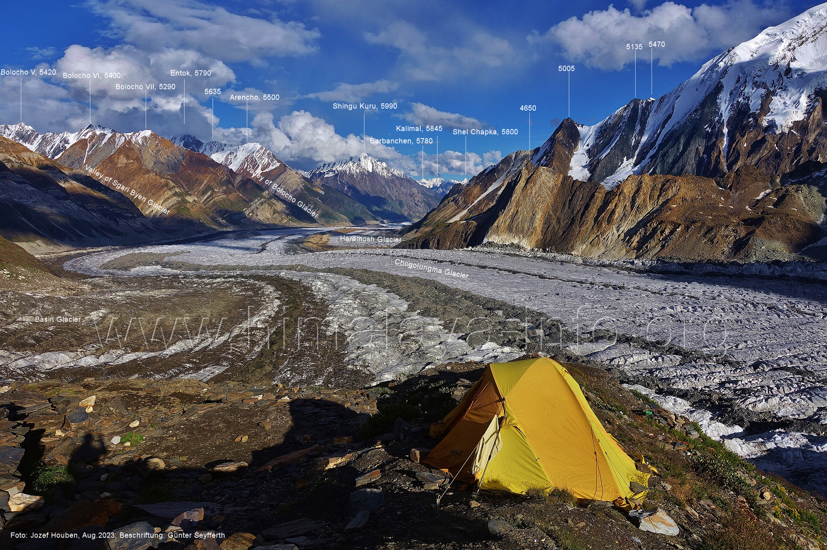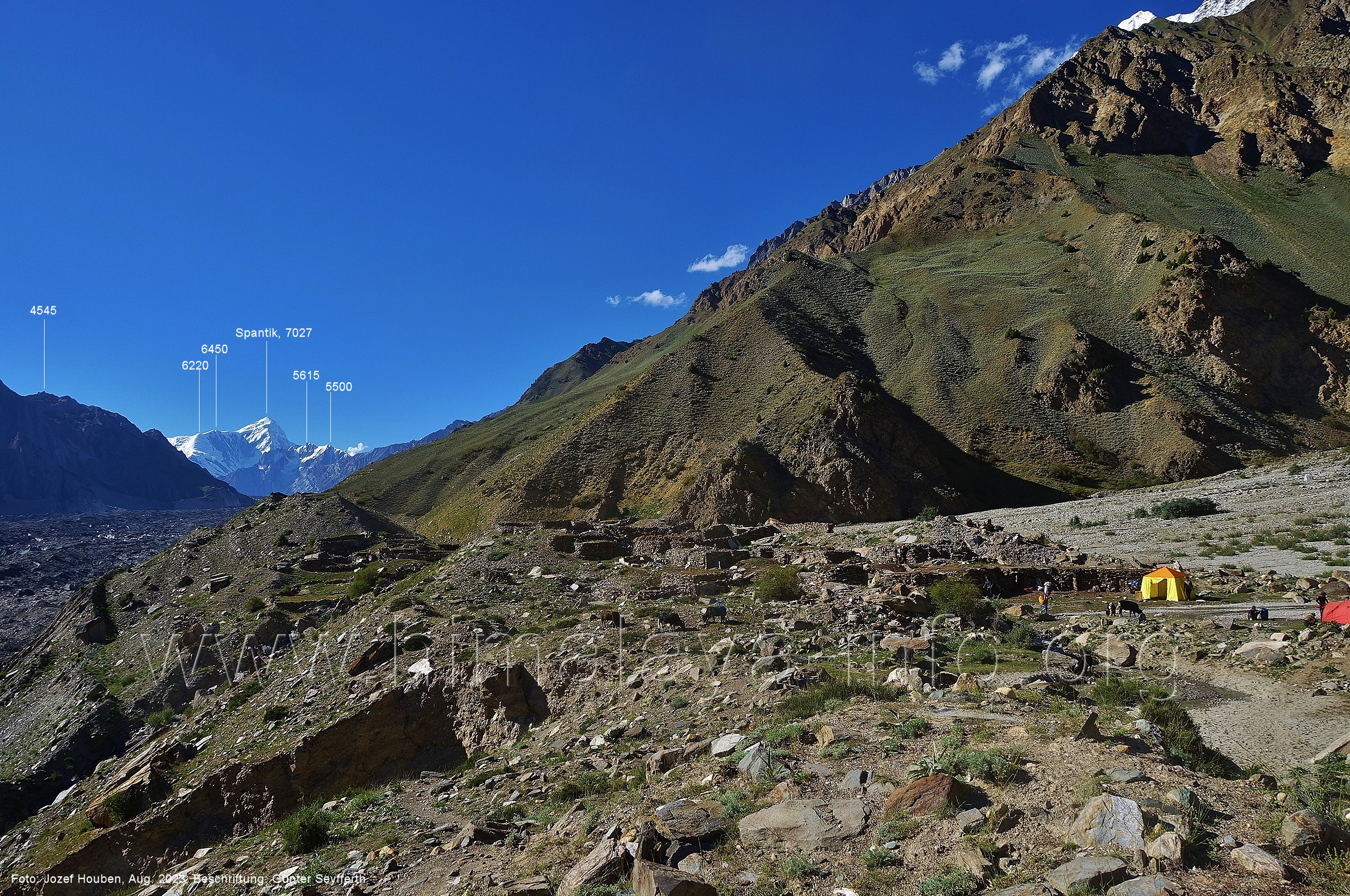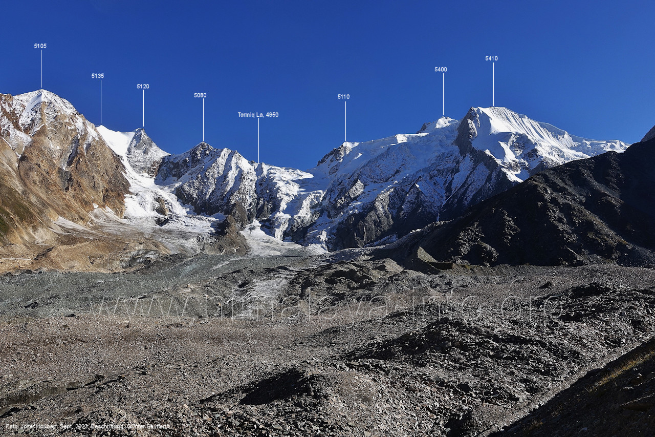 Peak (5500 m) und Entok (5790 m). Foto: Jozef Houben, Aug. 2023; Beschriftung: Günter Seyfferth (56) Blick bei 75°07'15" an der Mündung des Bolocho-Tals nach Süden zu Kapaltang Kun (6237 m) und Paraber (6315 m) Foto: Jozef Houben, Aug. 2023; Beschriftung: Günter Seyfferth (57) Blick bei 75°07'05" in ca. 3840 m Höhe nach Südwesten mit Laila I (6986 m), Malubiting (7458 m) und Spantik (7027 m).