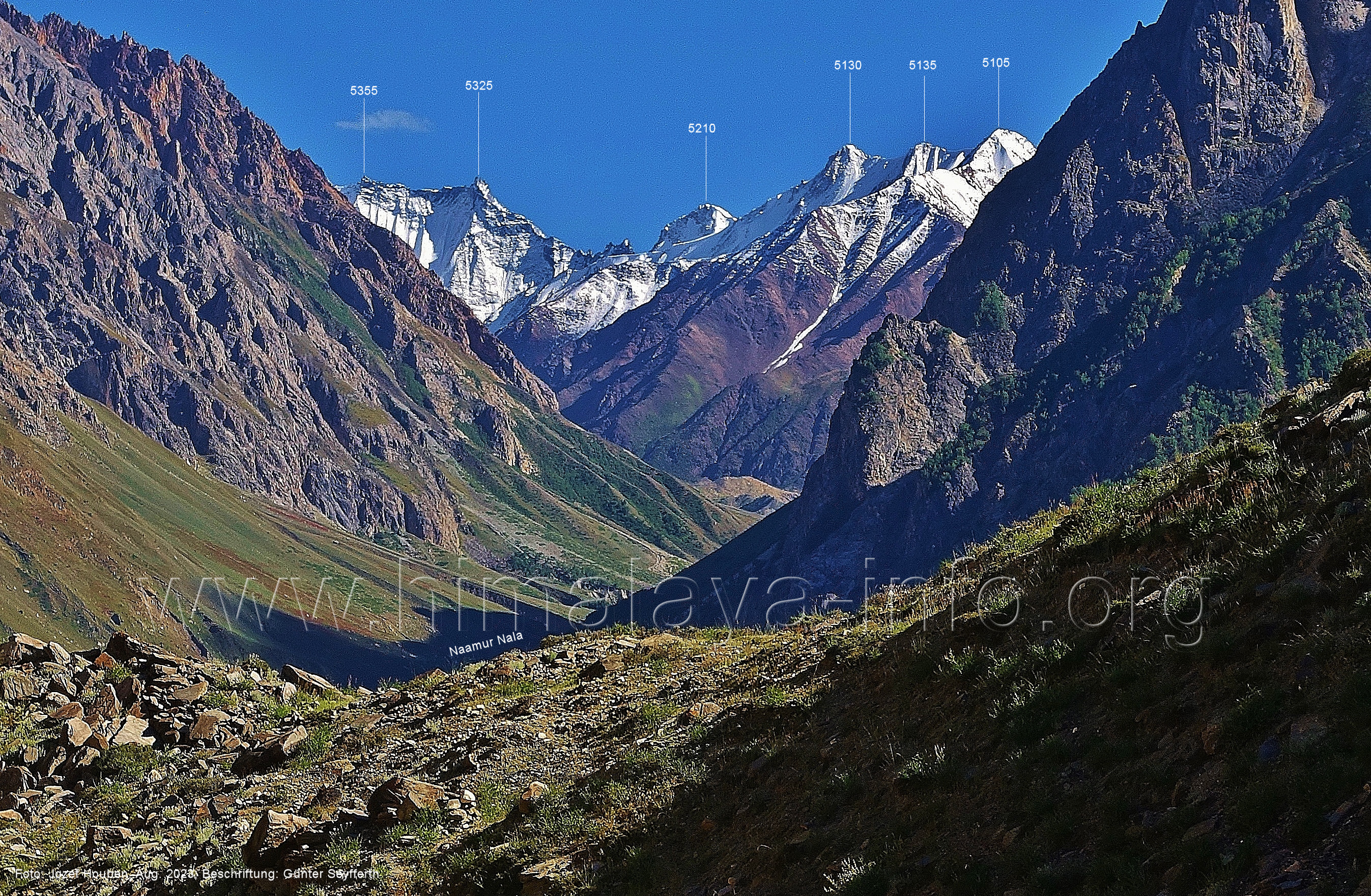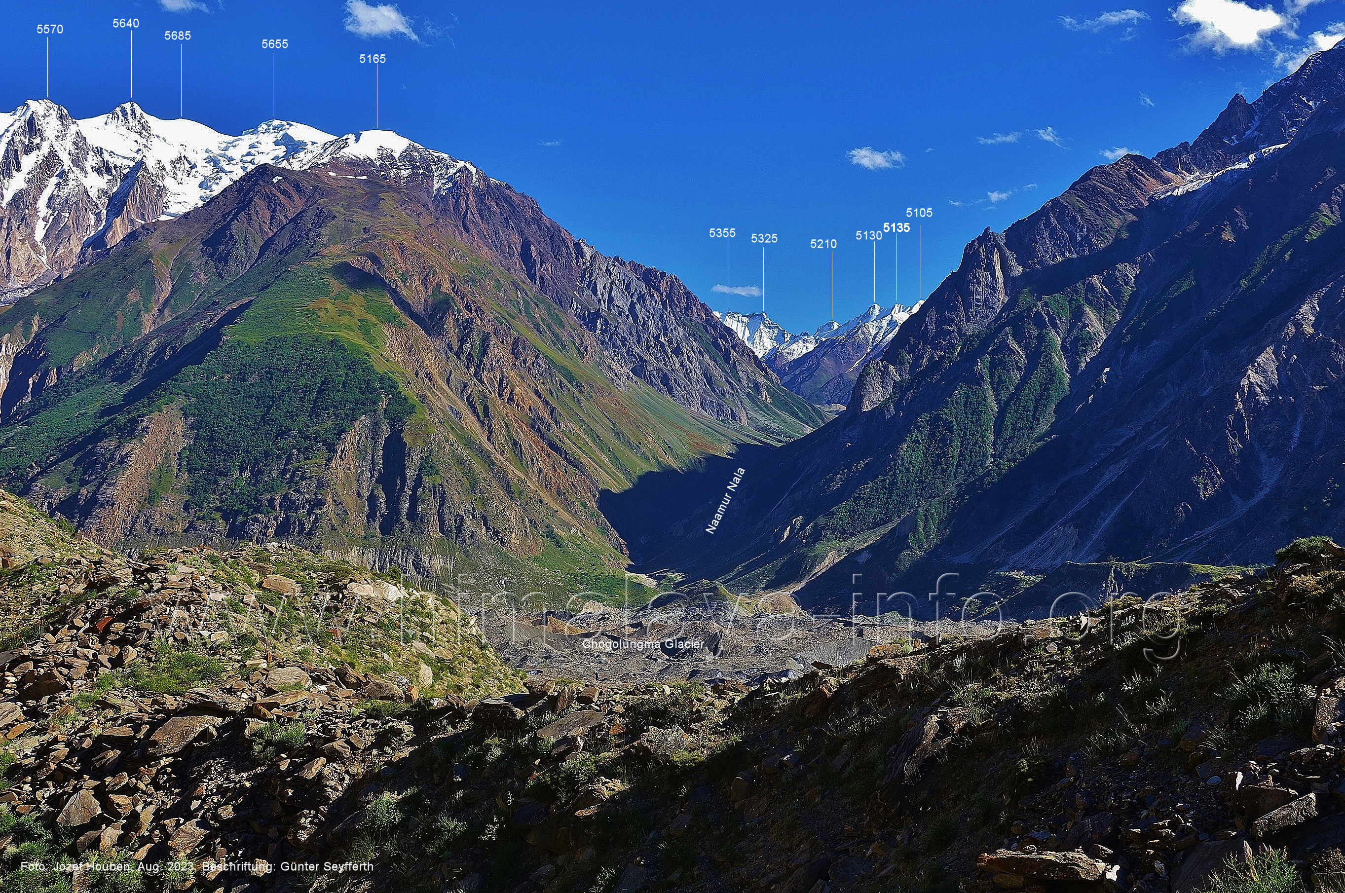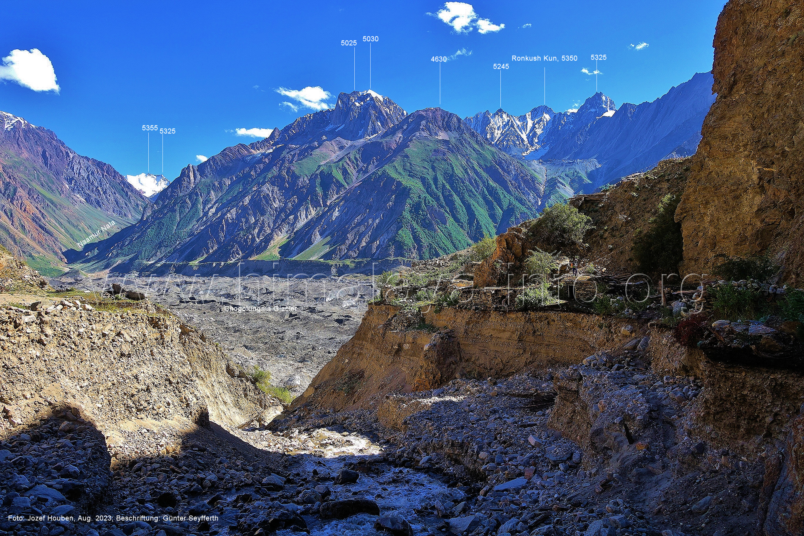 Chogolungma.Gletschers. Foto: Jozef Houben, Aug. 2023; Beschriftung: Günter Seyfferth (18) Tele-Blick bei 75°14'00" nach Nordwesten zum Spantik (7027 m) Der Gletscher liegt hier ca. 50 m tiefer als der Trekking-Pfad. Foto: Jozef Houben, Aug. 2023; Beschriftung: Günter Seyfferth (19) Blick bei 75°14'00" nach Süden zu den Bergen zwischen den Seitentälern Naamur und Remanedok Kushun Foto: Derek Boniecki, Juli 2023; Beschriftung: Günter Seyfferth (20) Rückblick bei 75°13'55" nach Südosten zu den Gipfeln am Ostrand des Naamur-Tals Man blickt auf die Schwemmebene, von der die Bilder Nr. 17 bis 19 aufgenommen wurden. Foto: Jozef Houben, Aug. 2023; Beschriftung: Günter Seyfferth (21) Blick bei 75°13'55" nach Südosten ins Tal des Naamur Nala Foto: Jozef Houben, Aug. 2023; Beschriftung: Günter Seyfferth (22) Tele-Blick bei 75°13'55" nach Südosten zu Gipfeln am südöstlichen Rand des Naamur Gans-Gletschers Foto: Jozef Houben, Aug. 2023; Beschriftung: Günter Seyfferth (23) Blick bei 75°13'35" nach Westen zu Gipfeln des Massivs des Kapaltang Kun (6237 m) und zum Spantik (7027 m)