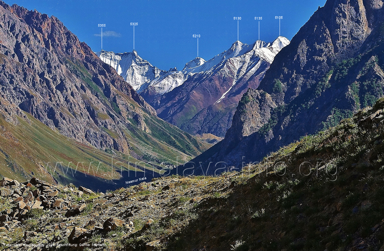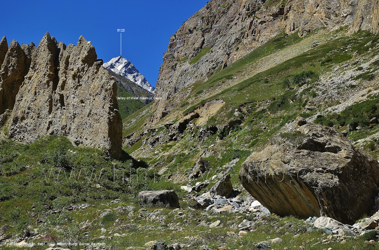 Stelle (230) Blick aus ca: 3670 m Höhe im Tal des Naamur Gans nach Süden Rechts des Peak 5080 liegt der Pass Tormik La (4950 m). Die unteren Hänge des Tals sind auch hier noch grün, obwohl die Fotos erst zum Ende des Sommers entstanden. (231) Blick aus ca. 3740 m Höhe im Tal des Naamur Gans nach Süd-Südosten Voraus sieht man die gemeinsme Zunge des mittleren und östlichen Naamur Gans. (232) Rückblick aus ca. 3740 m Höhe nach Norden zum Shingu Kuru (5990 m) Vor der Felswand in der linken Bildhälfte mündet der West Naamur Nala. (233) Vor dem Gletschertor des Naamur Gans in ca. 3850 m Höhe