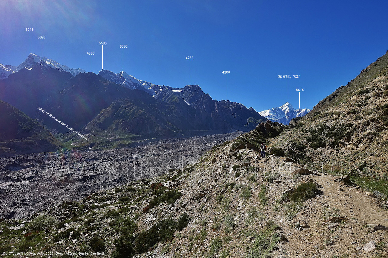 Kapaltang Kun. Foto: Jozef Houben, Aug. 2023; Beschriftung: Günter Seyfferth (36) Blick bei 75°11'25 nach Nordosten zum Spantik (7027 m) Foto: Jozef Houben, Aug. 2023; Beschriftung: Günter Seyfferth (37) Rückblick bei 75°11'20 nach Südosten Die Gipfel im Hintergrund stehen südlich der Ortschaft Arandu. Foto: Jozef Houben, Aug. 2023; Beschriftung: Günter Seyfferth (38) Rückblick bei 75°10'39° (H = 3610 m) nach Südosten Foto: Jozef Houben, Aug. 2023; Beschriftung: Günter Seyfferth (39) Rückblick bei 75°09'25" nach Ost-Südosten