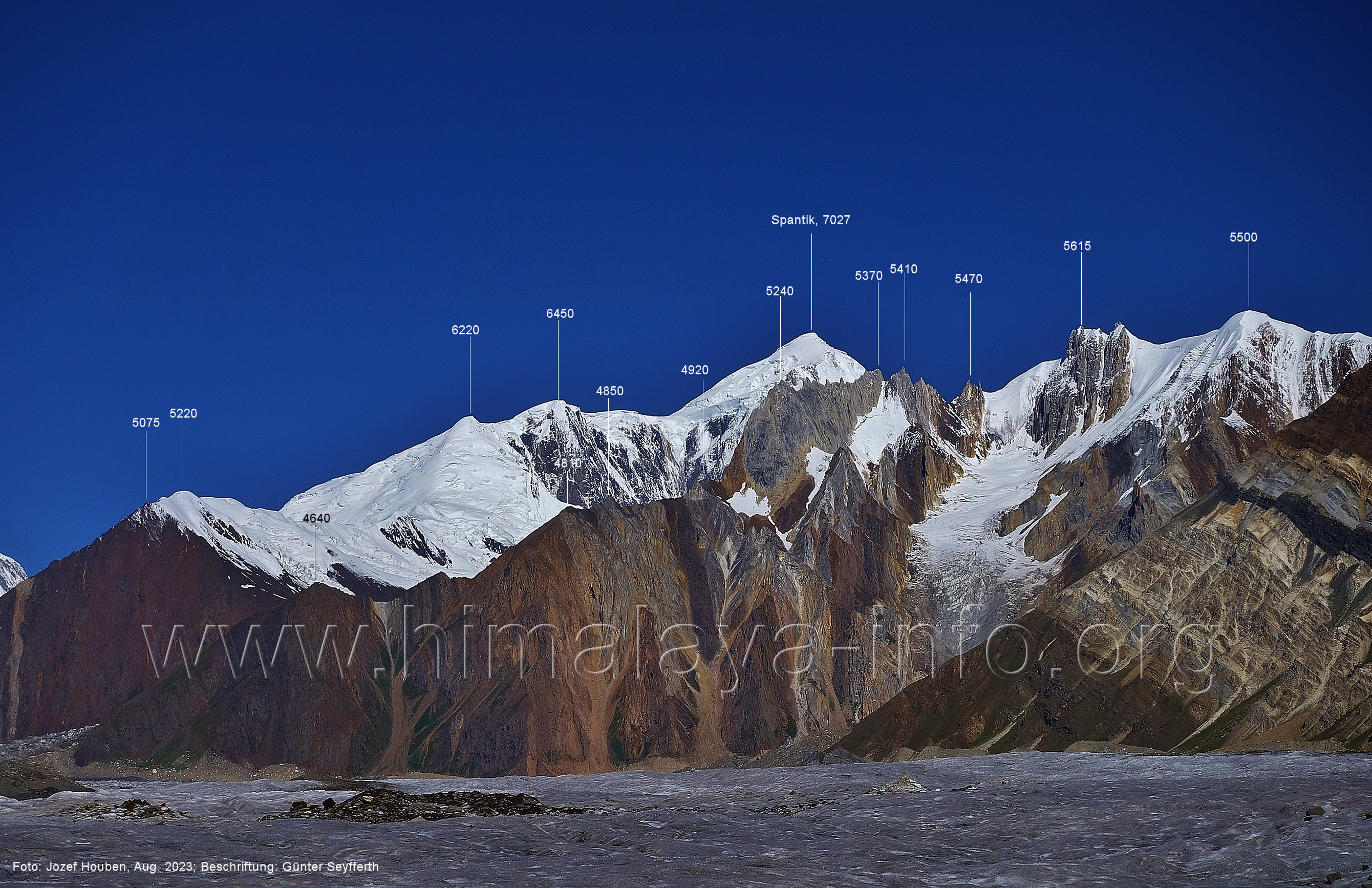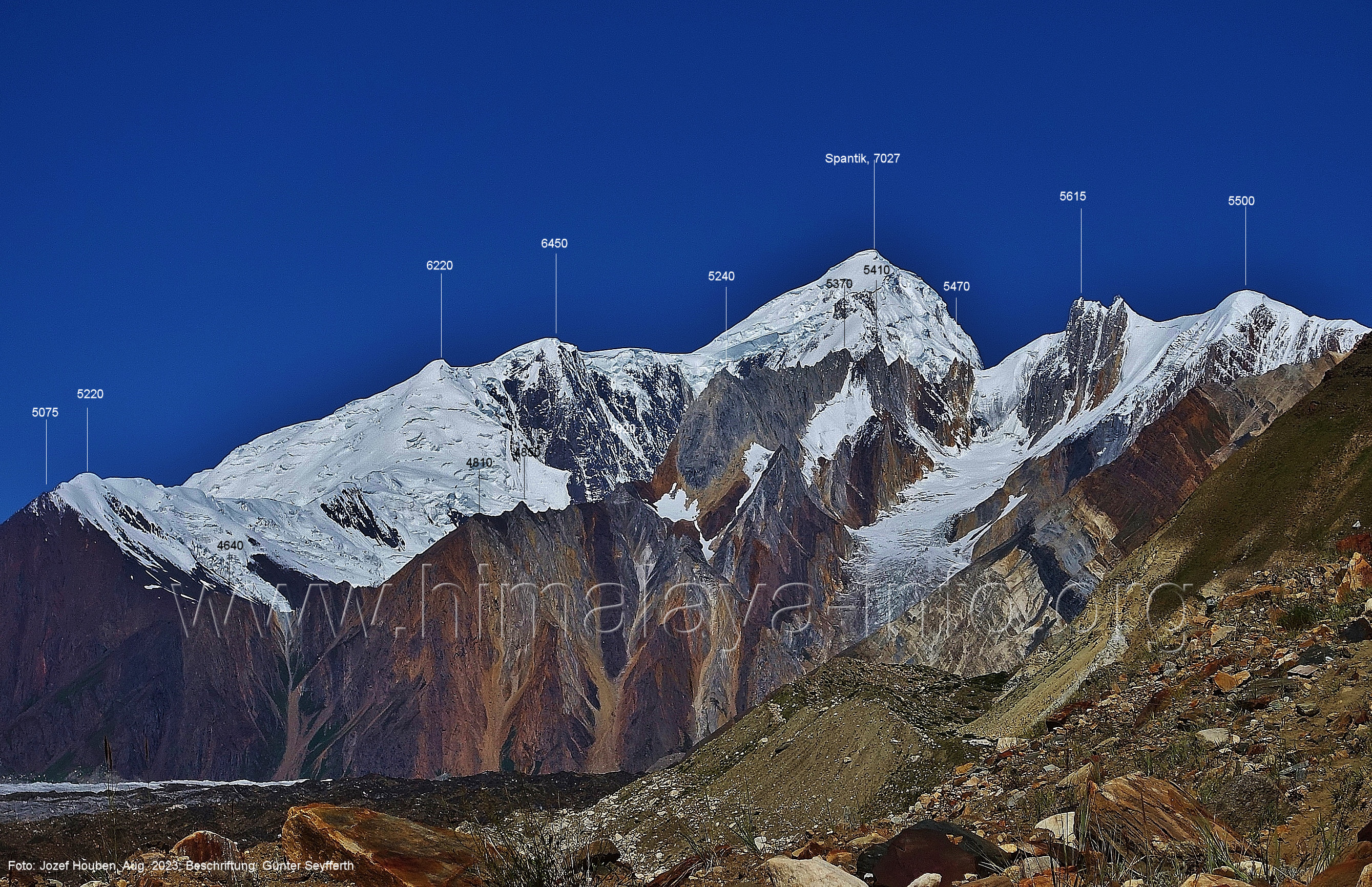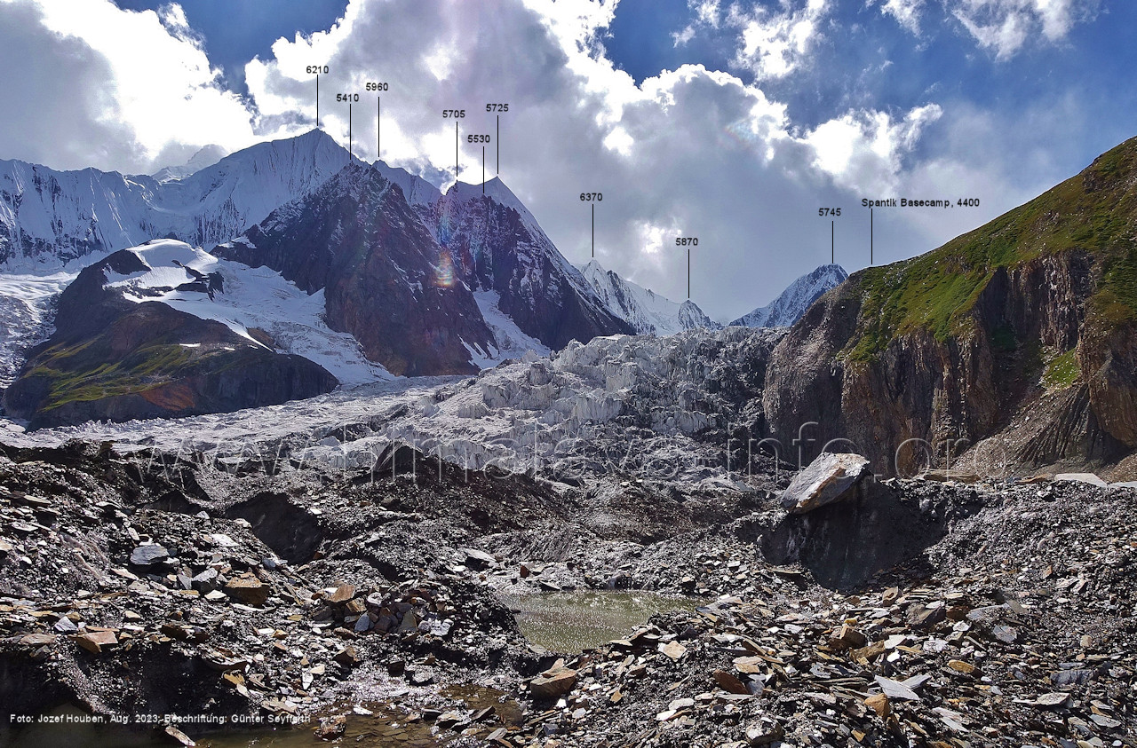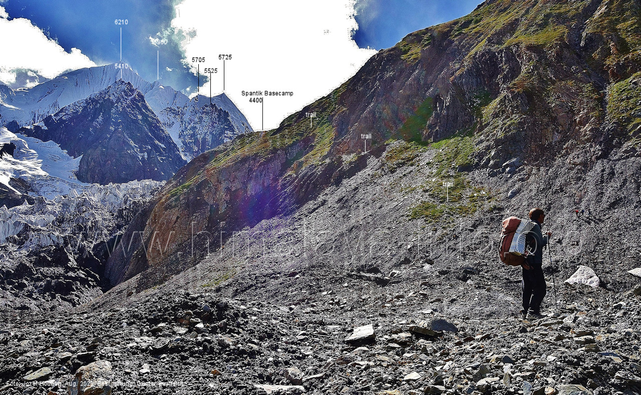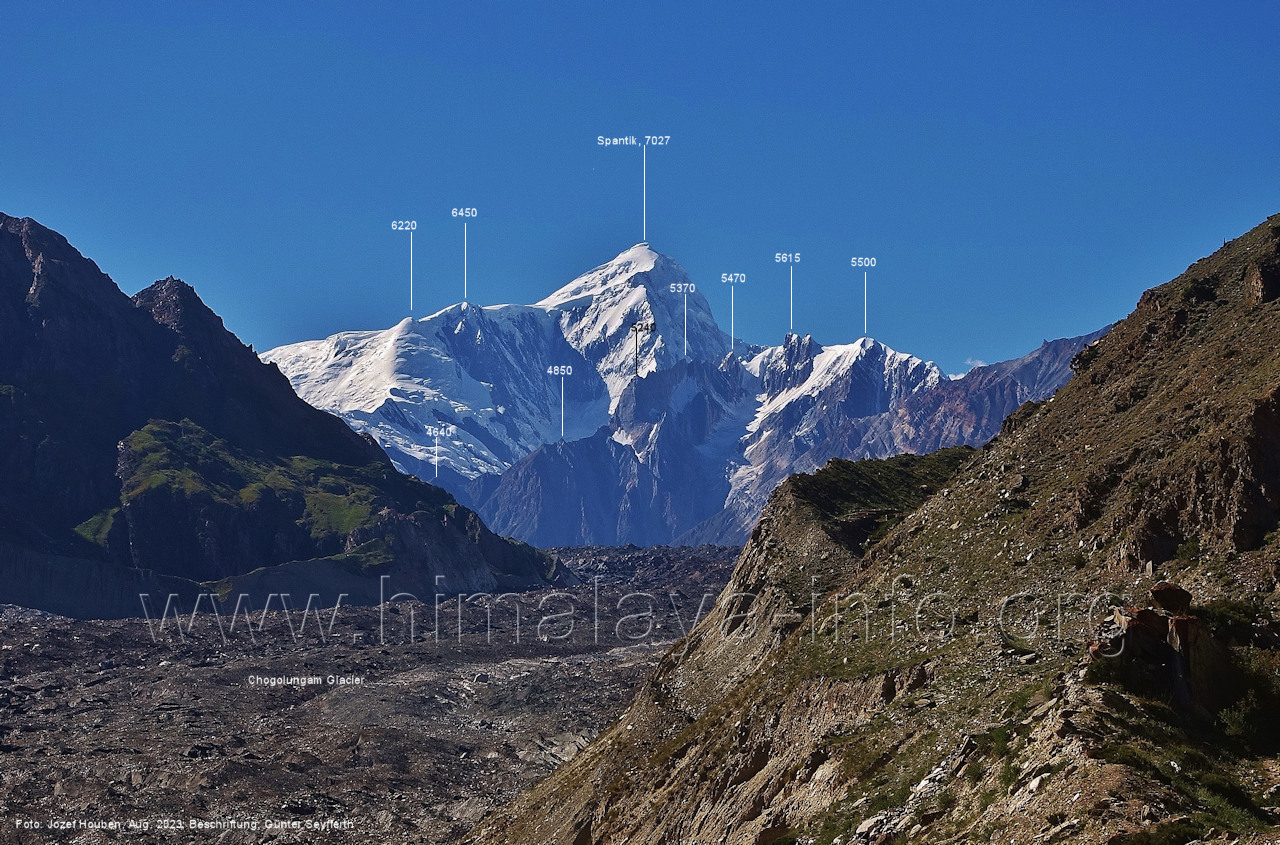 und kurzen Seitentäler Foto: Jozef Houben, Aug. 2023; Beschriftung: Günter Seyfferth Fast ständig hat man den Spantik so oder ähnlich vor Augen: (27) Blick bei 75°12'55" nach Nordwesten zum Spantik (7027 m) Foto: Jozef Houben, Aug. 2023; Beschriftung: Günter Seyfferth (28) Blick bei 75°12'53" nach West-Nordwesten zu Gipfeln des Kapaltang Kun-Massivs und zum Spantik (7027 m) Foto: Jozef Houben, Aug. 2023; Beschriftung: Günter Seyfferth Und wieder quert man eine Schwemmebene hinter der Moräne des Chogolungma-Gletchers: (29) Blick bei 75°12'30" (H = 3430 m) nach Nordwesten zum Spantik (7027 m) Foto: Jozef Houben, Aug. 2023; Beschriftung: Günter Seyfferth Die Rückblicke nach Südosten variieren nur wenig, sind aber immer überwältigend schön: (30) Rückblick bei 75°12'17" nach Südosten Foto: Jozef Houben, Aug. 2023; Beschriftung: Günter Seyfferth (31) Blick bei 75°12'09" nach Nordwesten zum Spantik (7027 m)