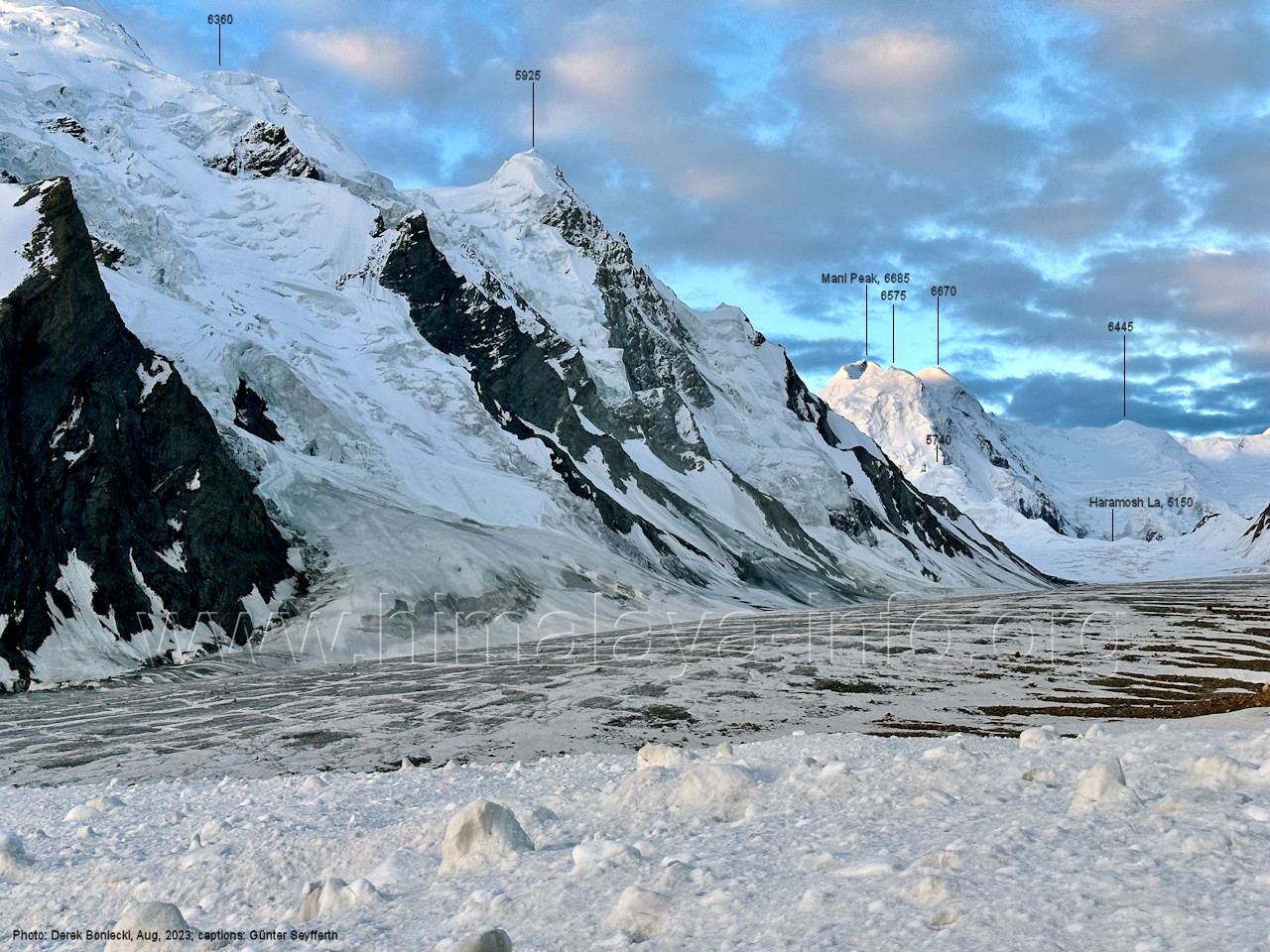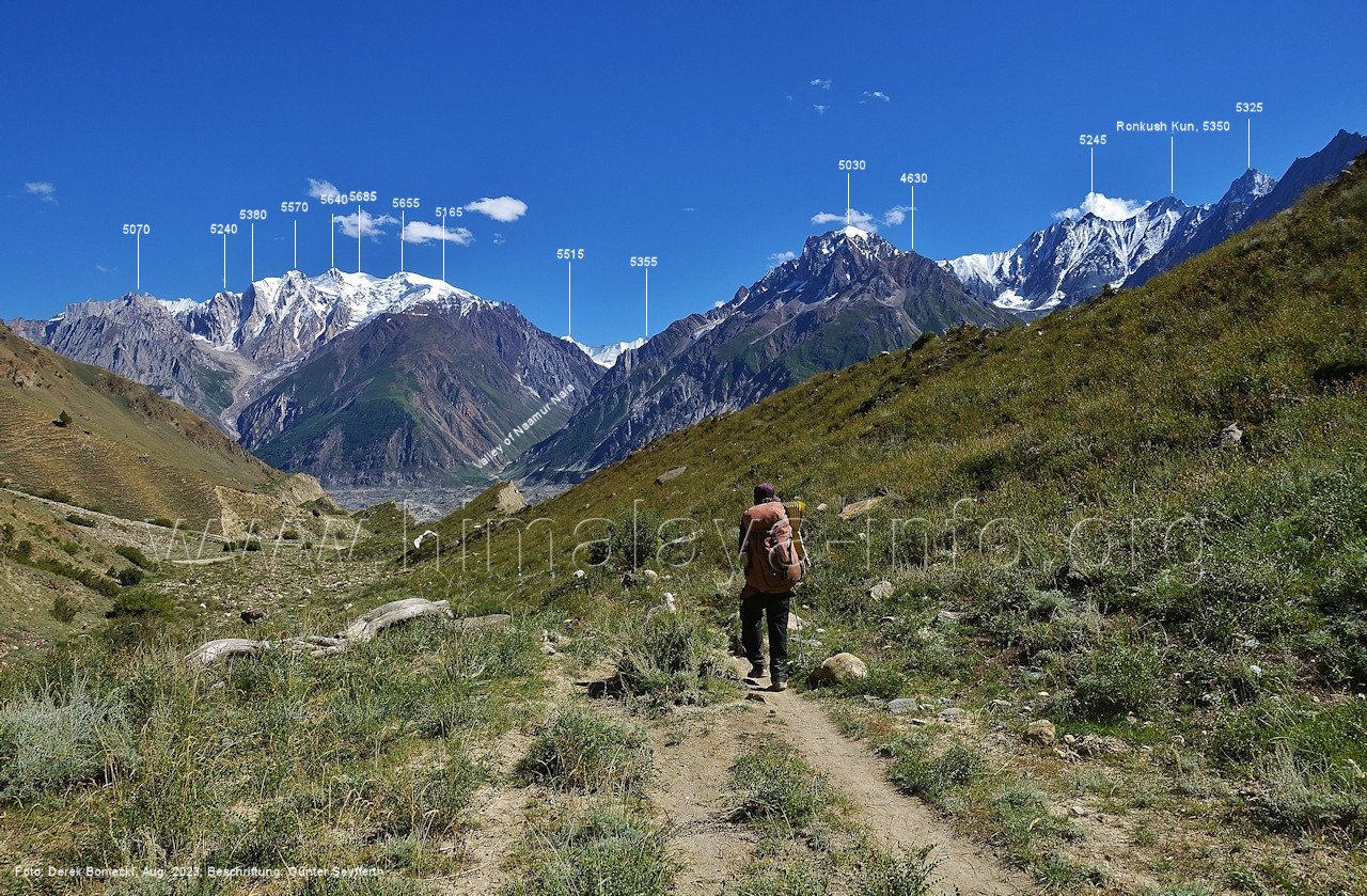 (60) Blick bei 75°06'50" in ca. 3850 m Höhe nach West-Nordwesten Foto: Jozef Houben, Aug. 2023; Beschriftung: Günter Seyfferth (61) Blick bei 75°06'30" zum Malubiting (7458 m) und Spantik (7027 m)