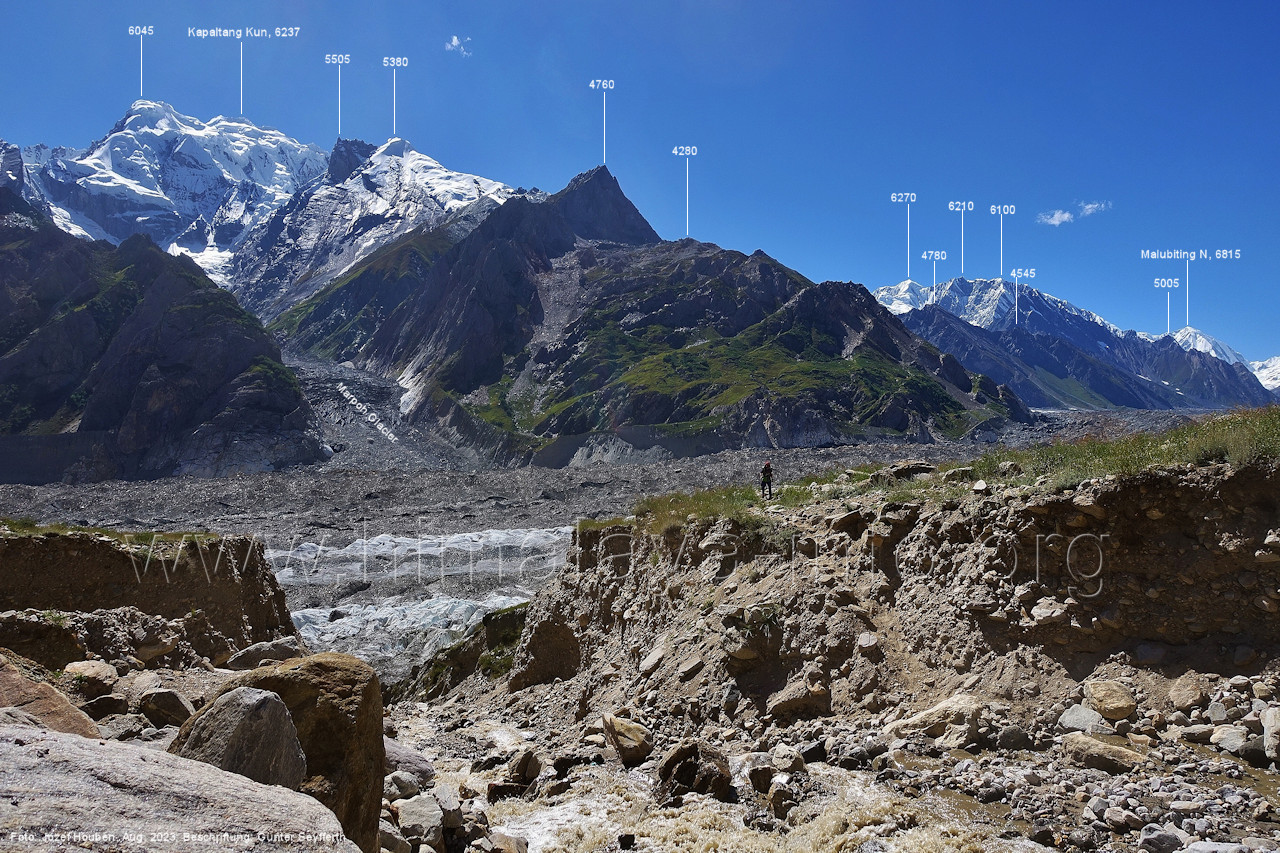 mehr von Geröll bedeckt und relativ eben ist. Foto: Jozef Houben, Aug. 2023; Beschriftung: Günter Seyfferth (44) Blick bei 75°09'08" nach Südosten Rechts sieht man den mittleren Gratausläufer des Kapaltang Kun. Foto: Jozef Houben, Aug. 2023; Beschriftung: Günter Seyfferth (45) Bick bei 75°08'30" (H = 3770 m) nach Westen mit Malubiting (7458 m) und Spantik (7027 m)