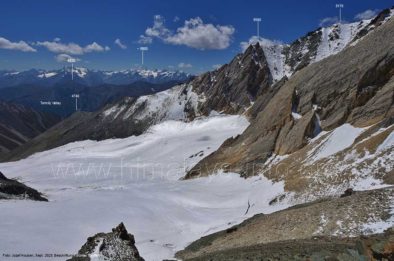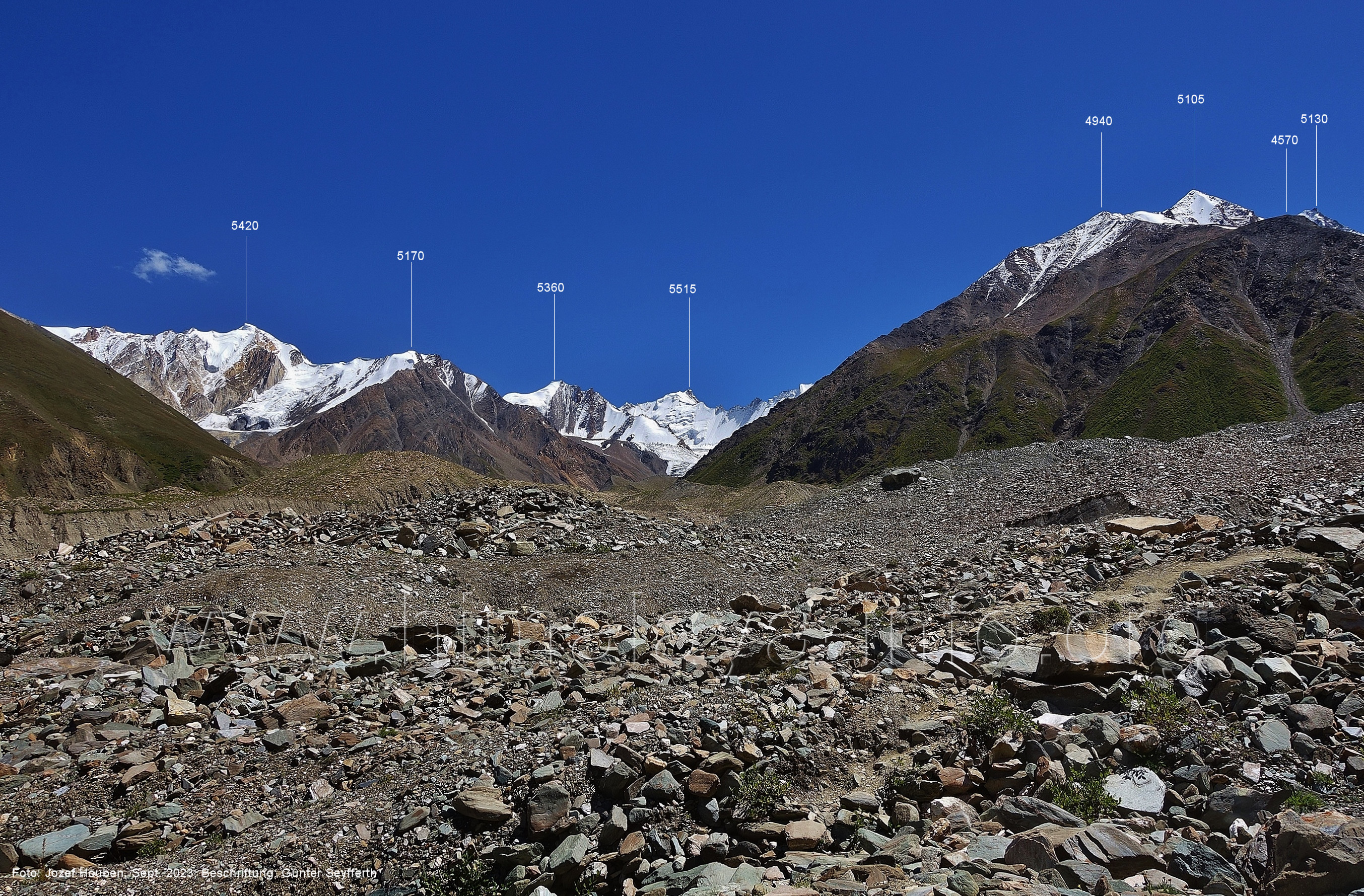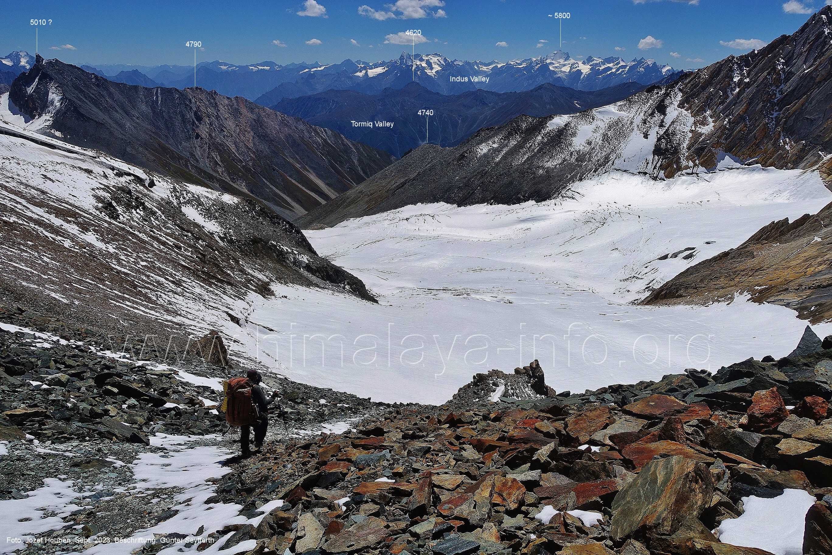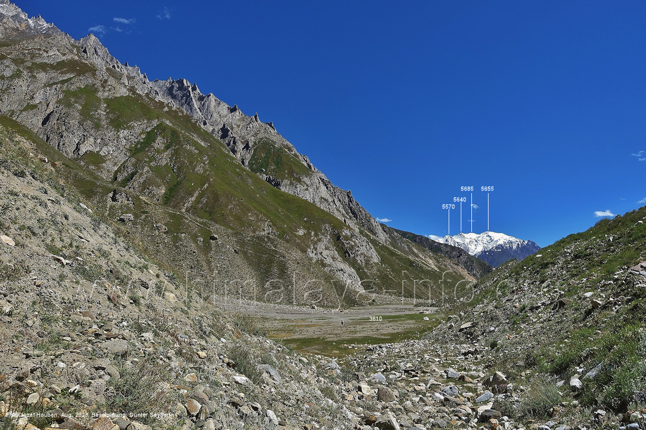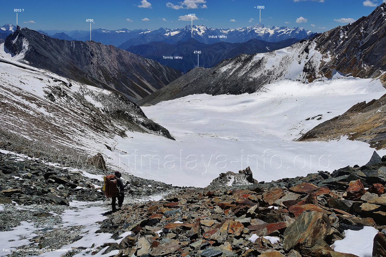 (70) Rückblick bei 75°05'40" in ca. 3930 m Höhe nach Osten Foto: Jozef Houben, Aug. 2023; Beschriftung: Günter Seyfferth (71) Blick bei 75°05'20" nach Süden mit Kapaltang Kun (6237 m) und Peak 5470