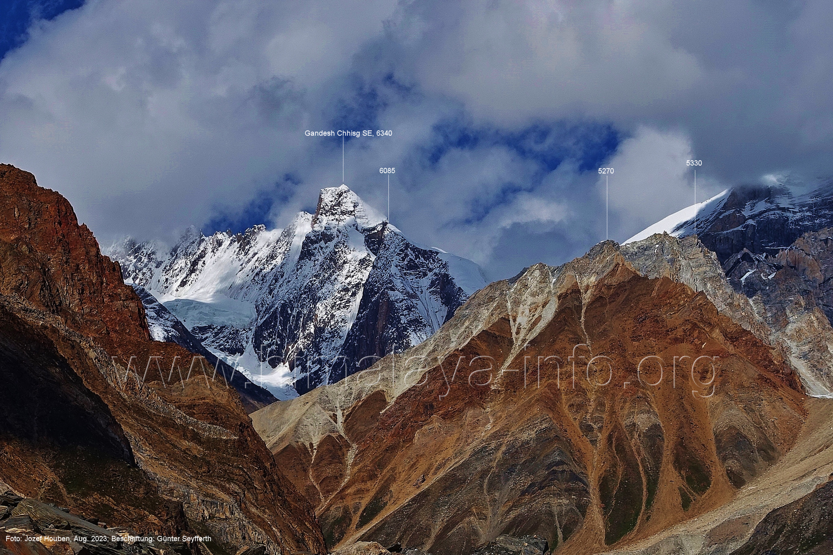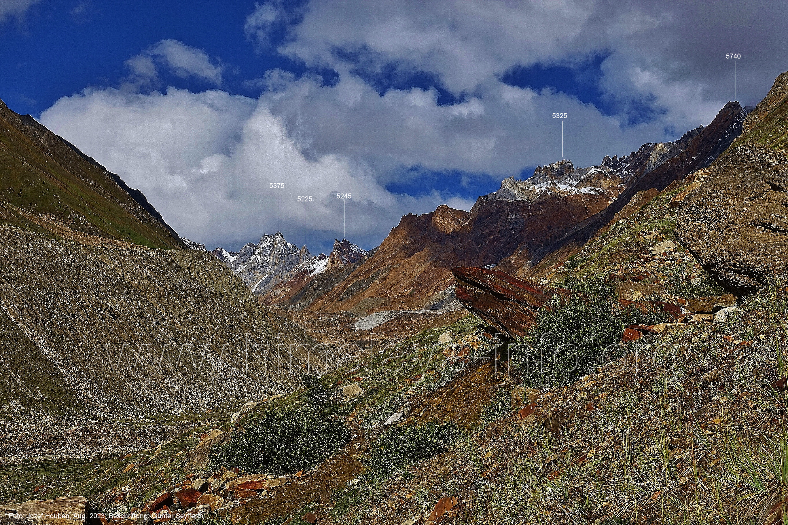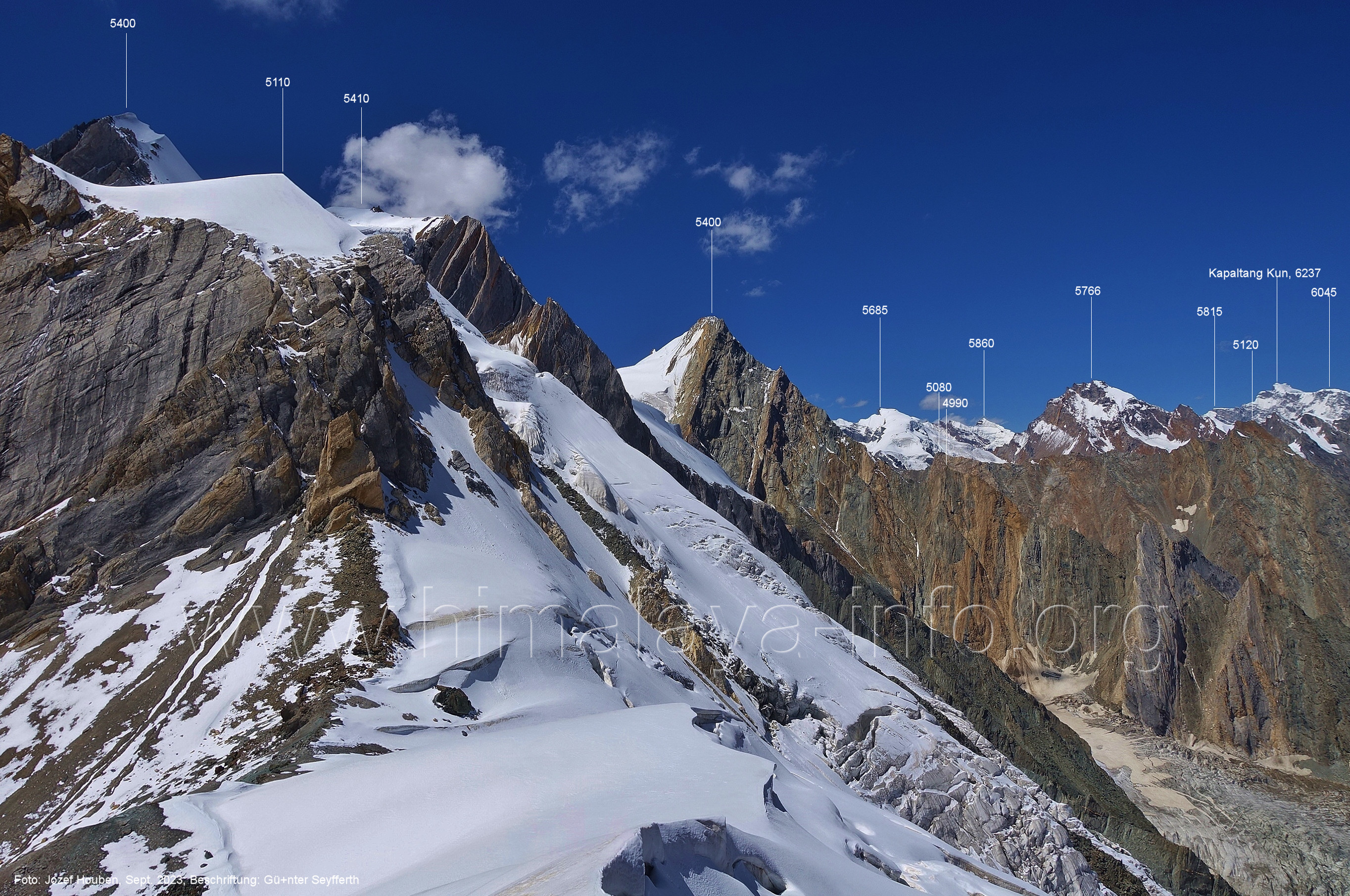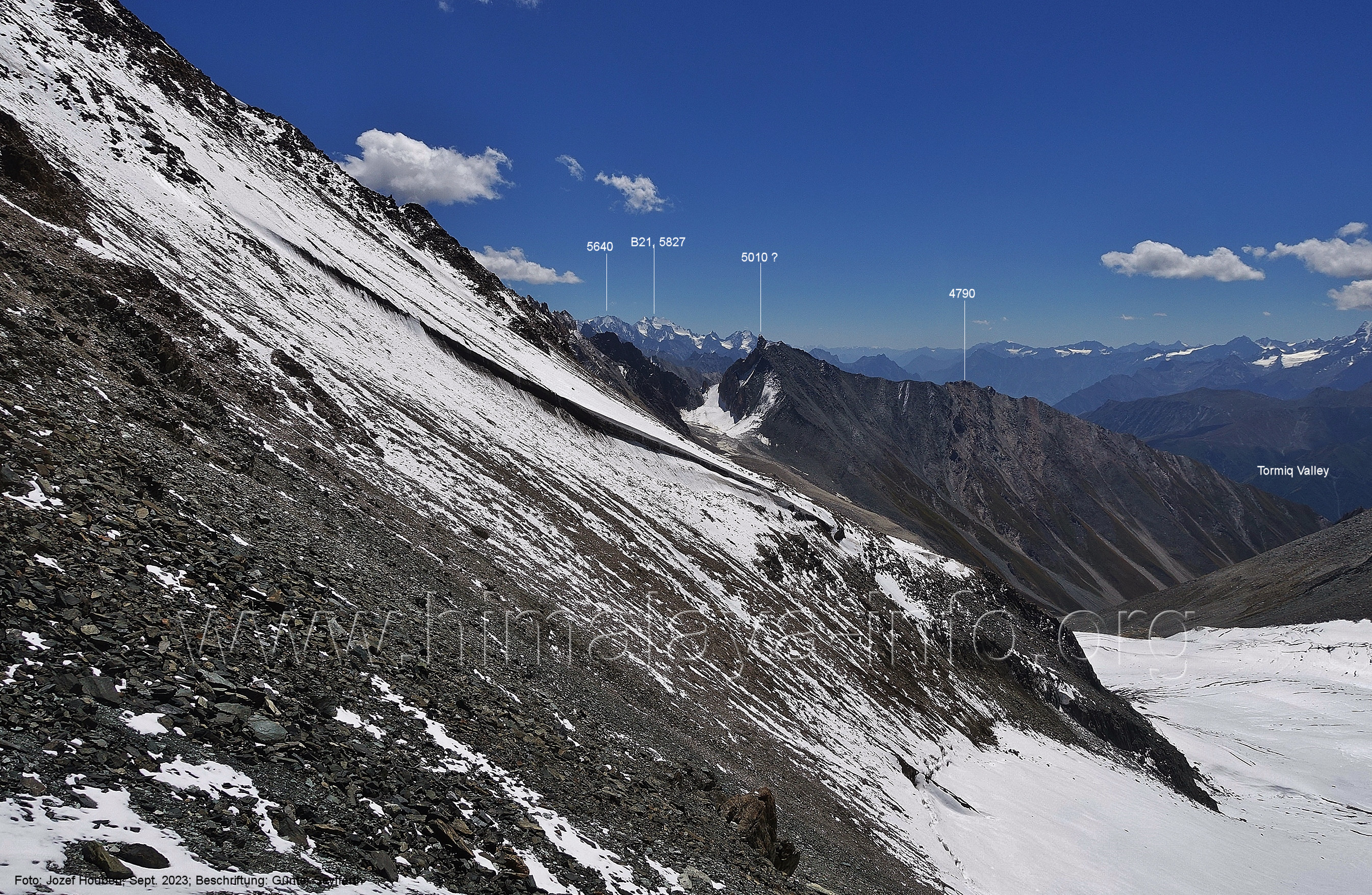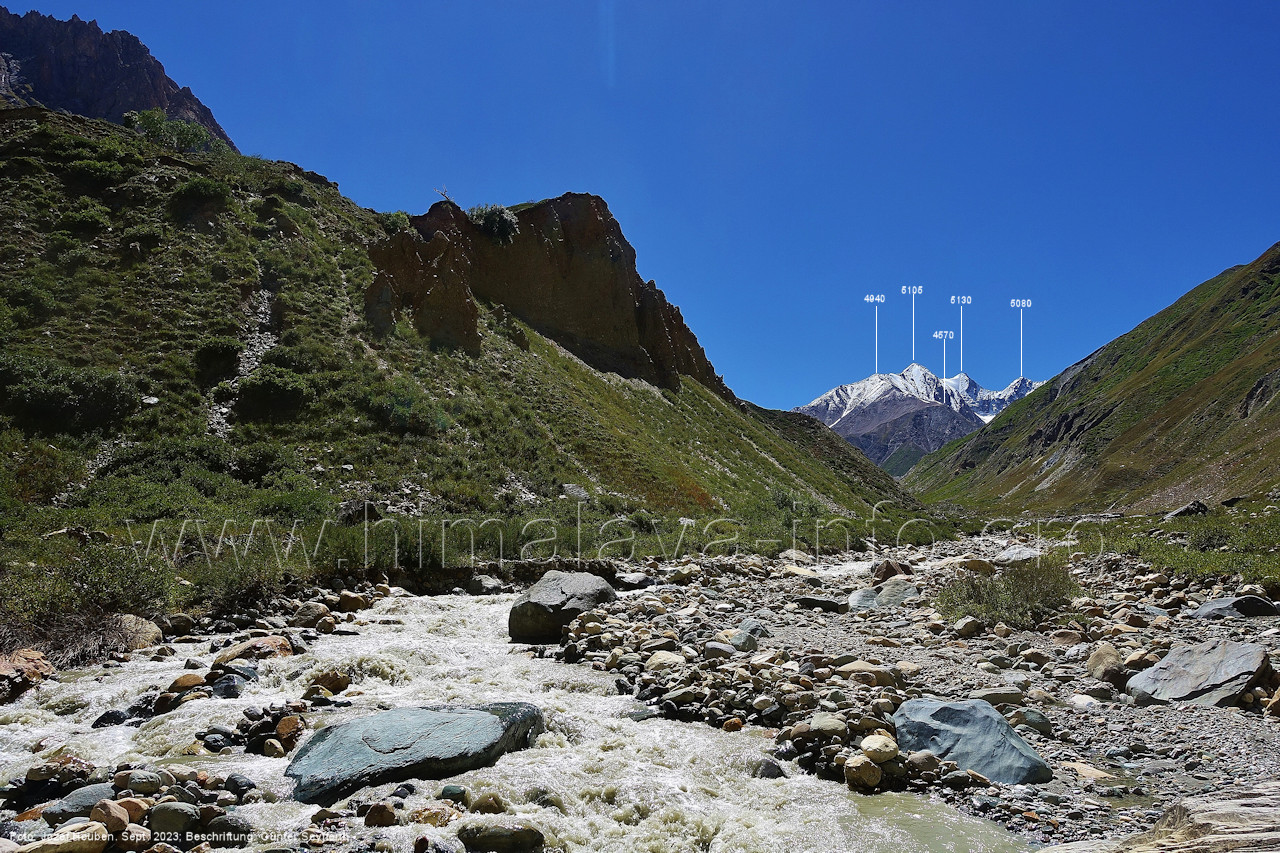(70) Rückblick bei 75°05'40" in ca. 3930 m Höhe nach Osten Foto: Jozef Houben, Aug. 2023; Beschriftung: Günter Seyfferth (71) Blick bei 75°05'20" nach Süden mit Kapaltang Kun (6237 m) und Peak 5470